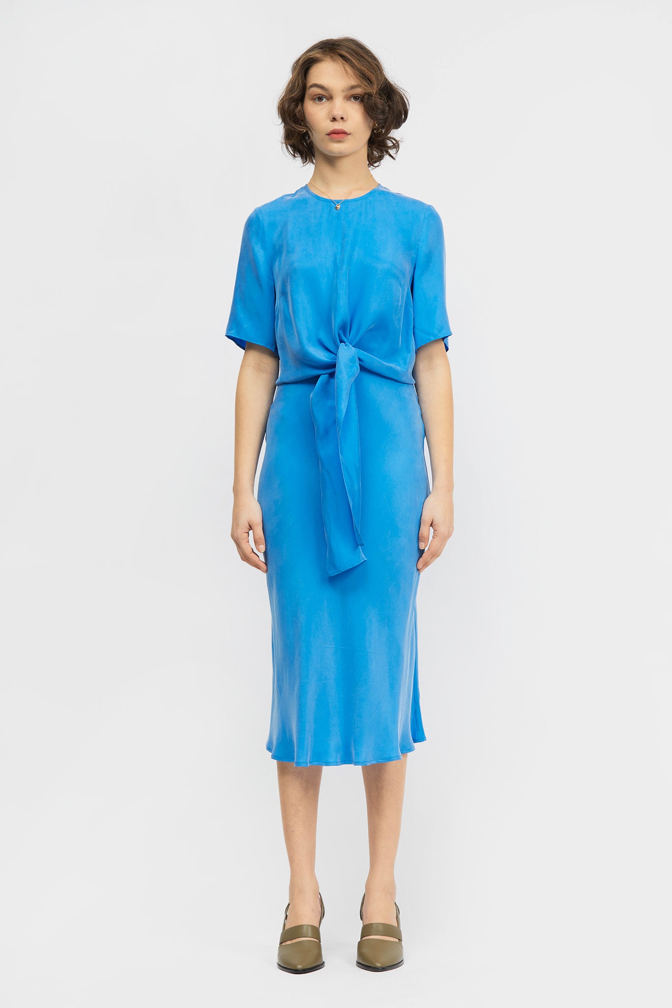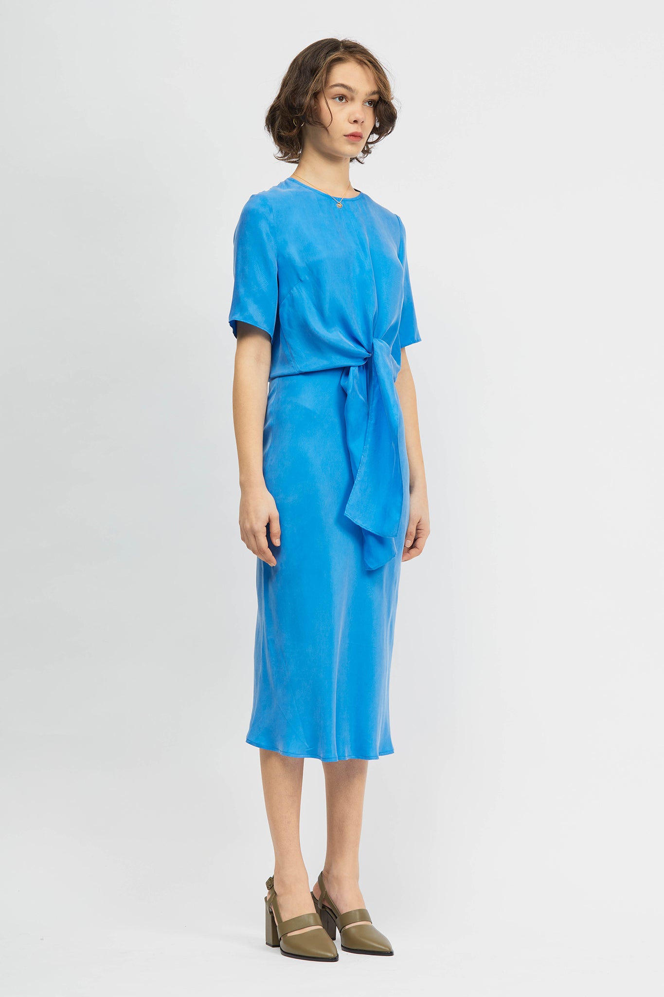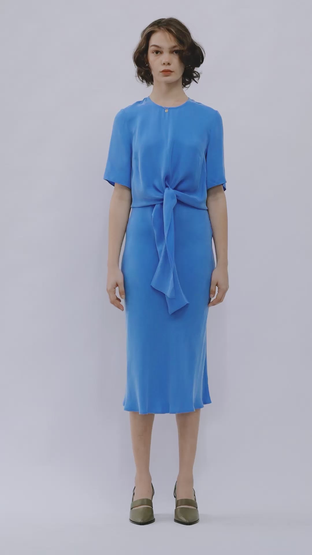 The Somang Dress is a short sleeve, mid-length style with a regular fit. This is a double layer style, with a bias-cut slip and a removable top with a tie hem detail. These two layers can be worn layered together or separately and are both made from a soft cupro blend.