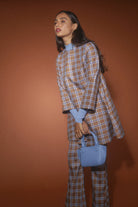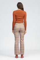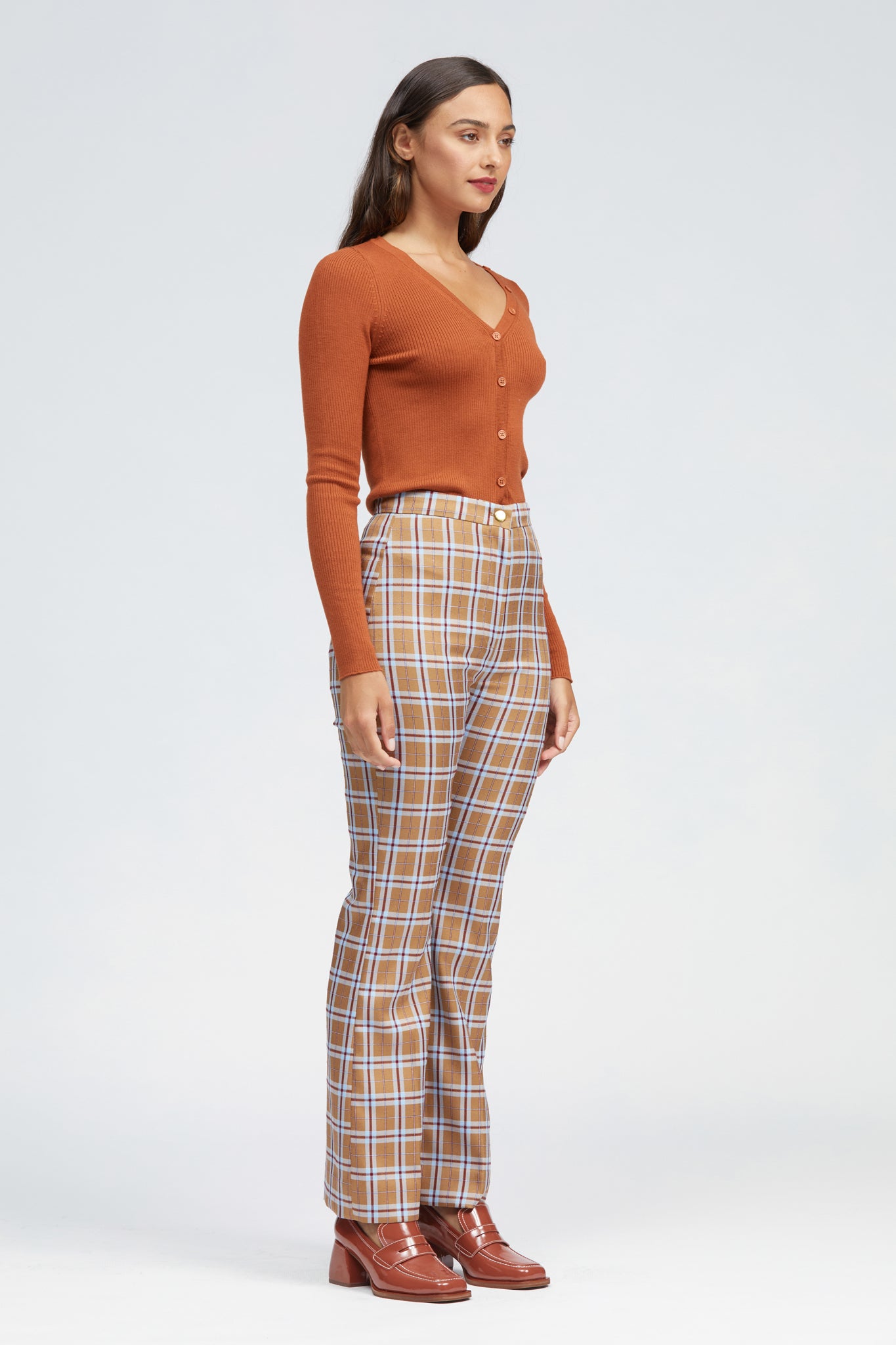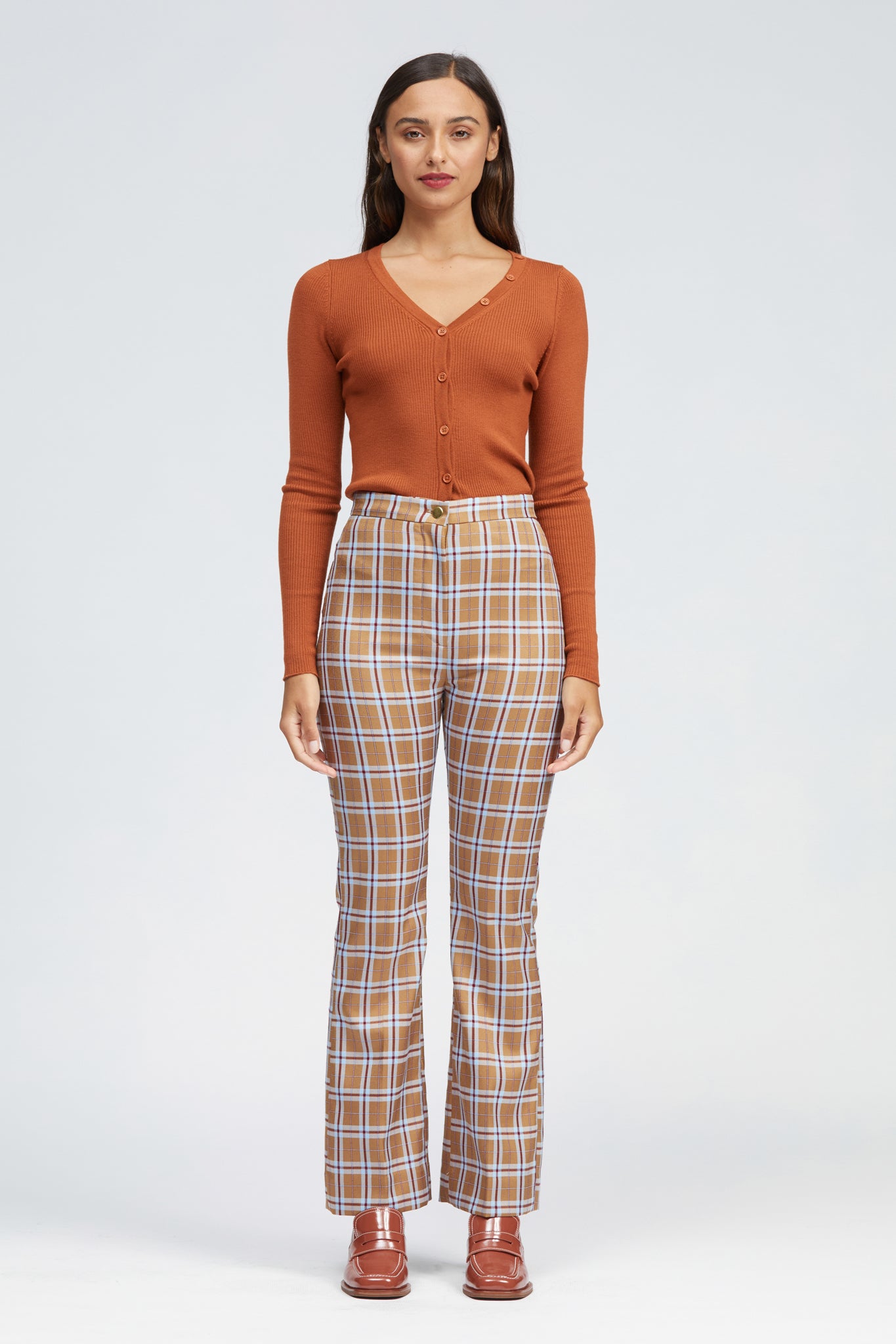 The Traf Pant is a full-length, high-waisted bootcut style. Details include gold-toned hardware and pressed seams. Made with a Tencel blend check with slight stretch. This style can be paired back with your existing wardrobe favourites or with the Fala Dress in matching fabric as a set.