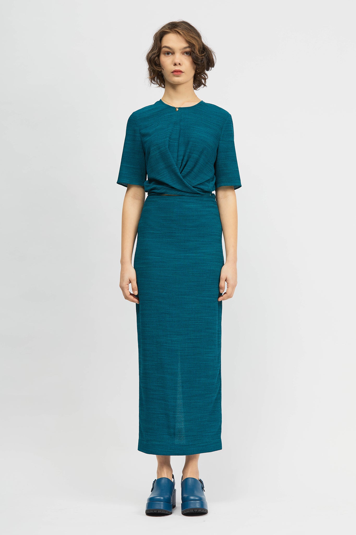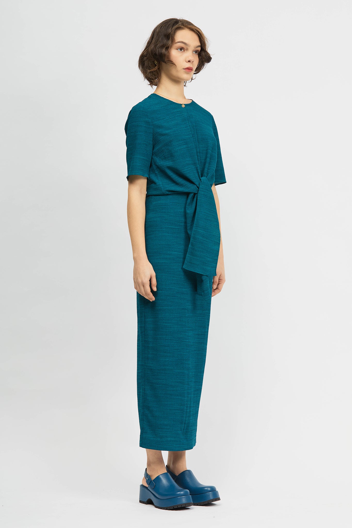 The Ver Top is a short-sleeve, regular fit style. This style offers front ties which can be wrapped around the body, fastened at the front, left hanging or tucked in. Made with a stretch seersucker fabrication. This style can be paired back with your existing wardrobe favourites or with the Obrigado Skirt in matching fabric as a set.