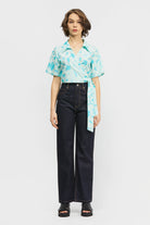 The Bada Top is a short sleeve wrap style in a regular fit. Details include an open collar, wide short sleeves and a front wrap that ties towards the side. Made from a soft viscose/ cotton blend in búl’s in-house designed Namu Print.