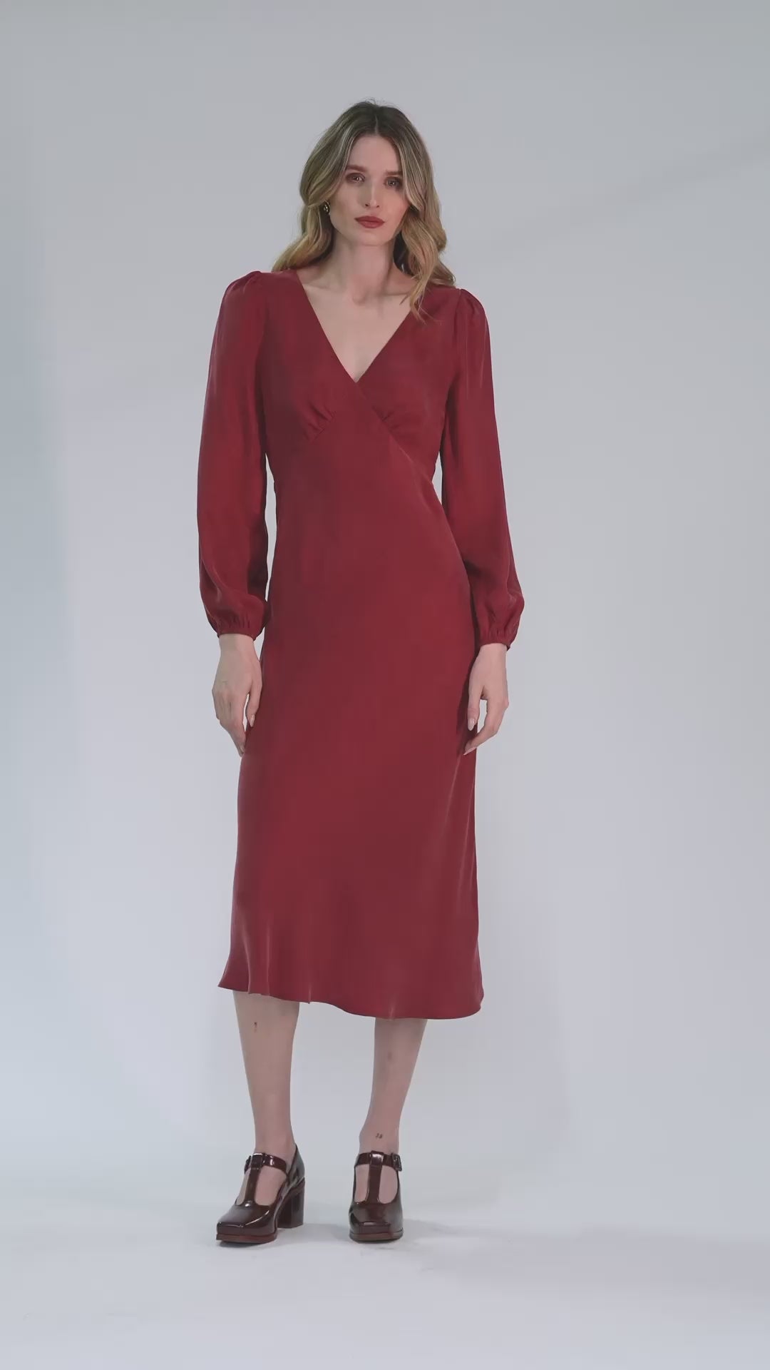 The Bungaree Dress is a fitted style in mid-length. This style features a low neckline with gather detailing along the bust seams, balloon shaped sleeves with an elasticated cuff and a bias-cut, flowy skirt. Made in a soft cupro/ viscose blend.