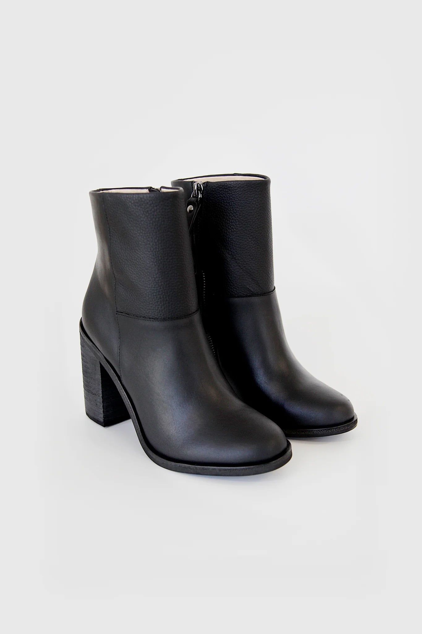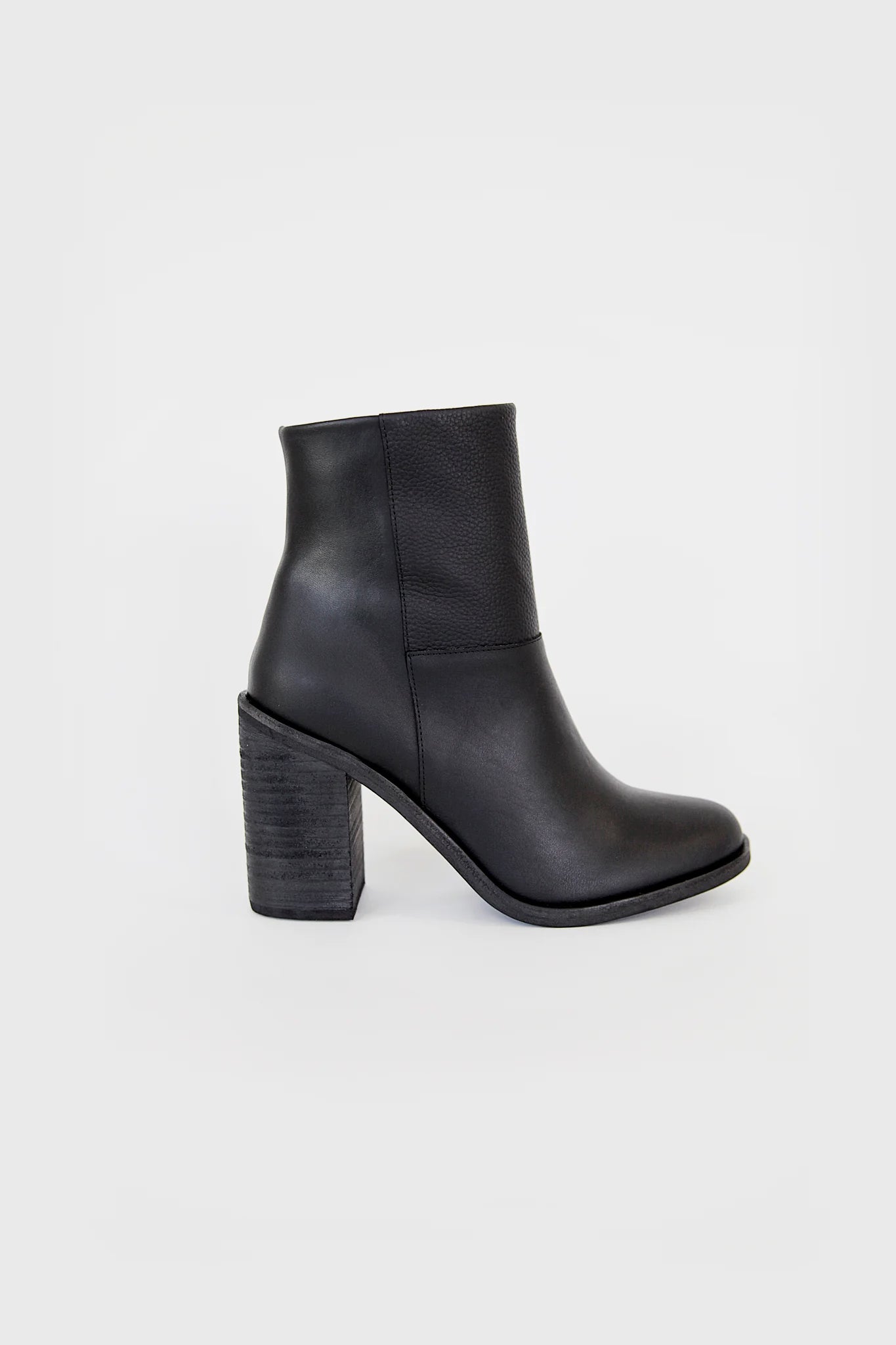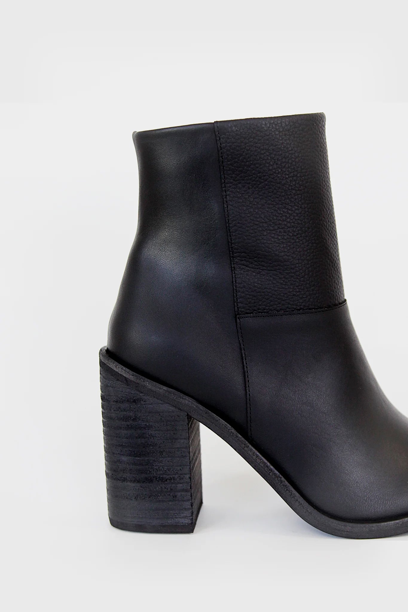 The Etwa Boot is a high heeled shoe, featuring contrast panal detail, and reaches to mid calf length.