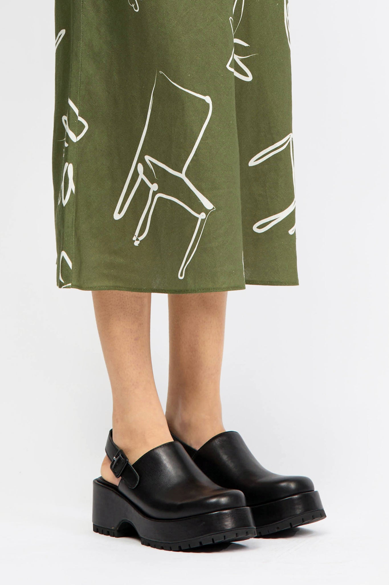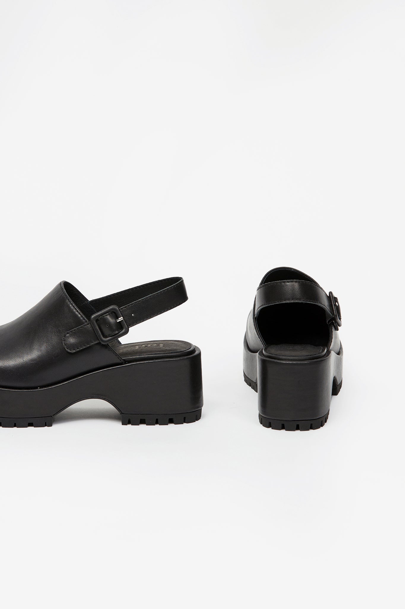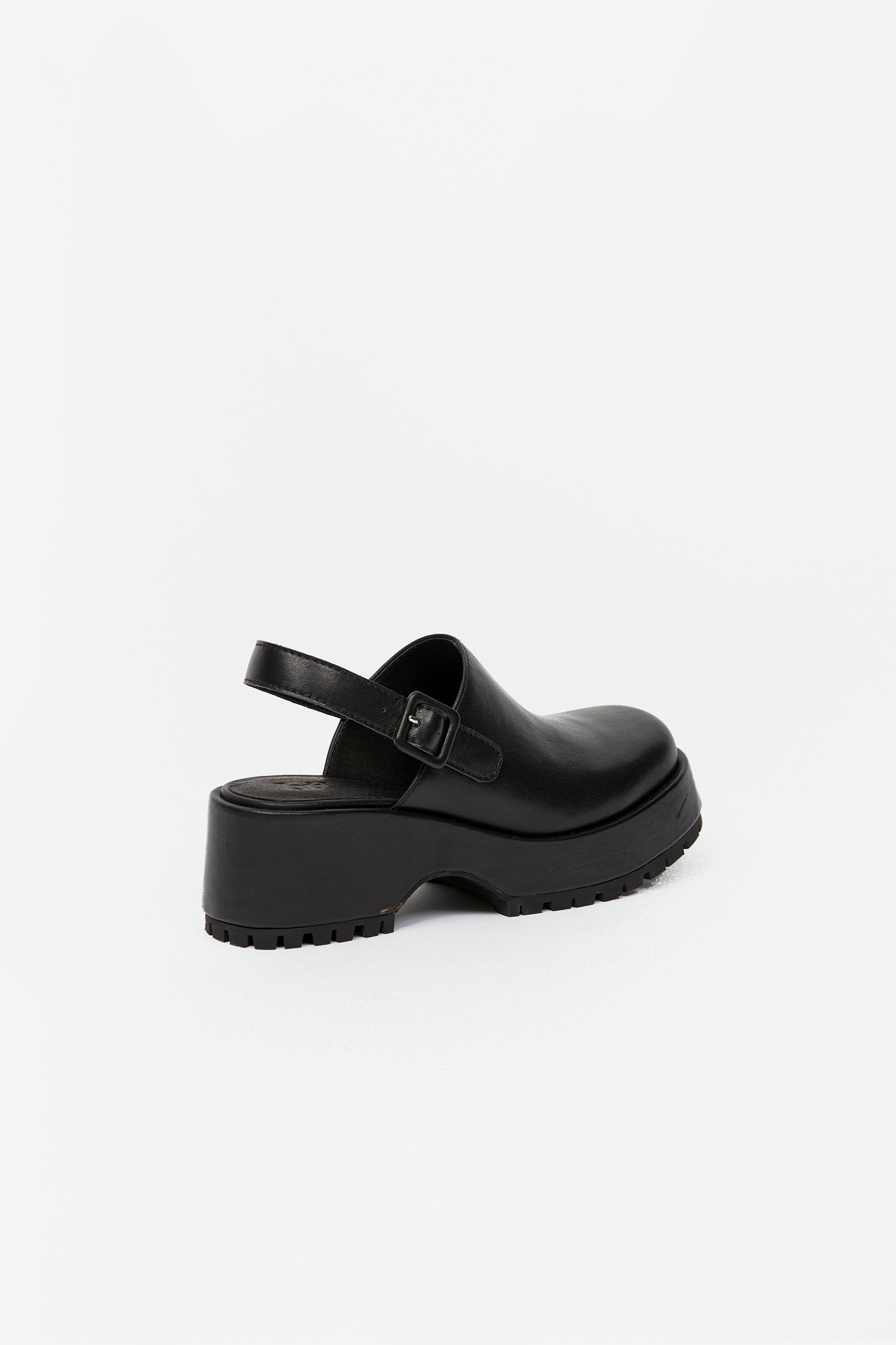 The Gada Clog is a rounded square toe style with an ankle strap and open back. This style offers a self-covered platform heel and lug sole. Made in smooth leather.