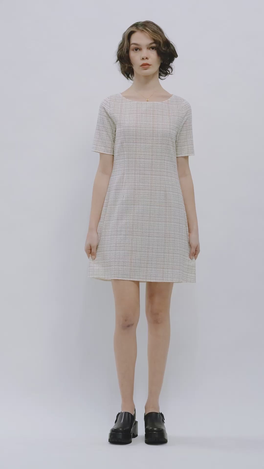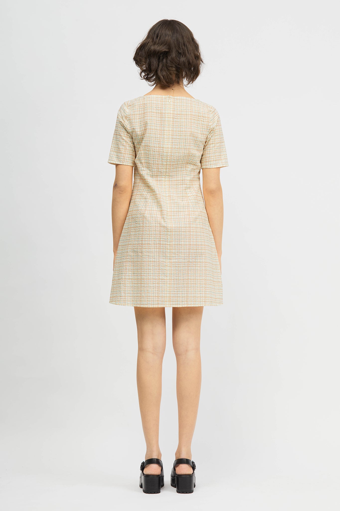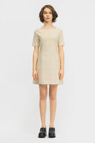The Hanji Dress is a short sleeve, fitted style in a mini-length. Details include a rounded boat-neckline, centre-back zip and dart detailing that creates a fitted silhouette through the waist flowing into a flared skirt. Made from a cotton seersucker fabrication.