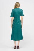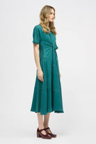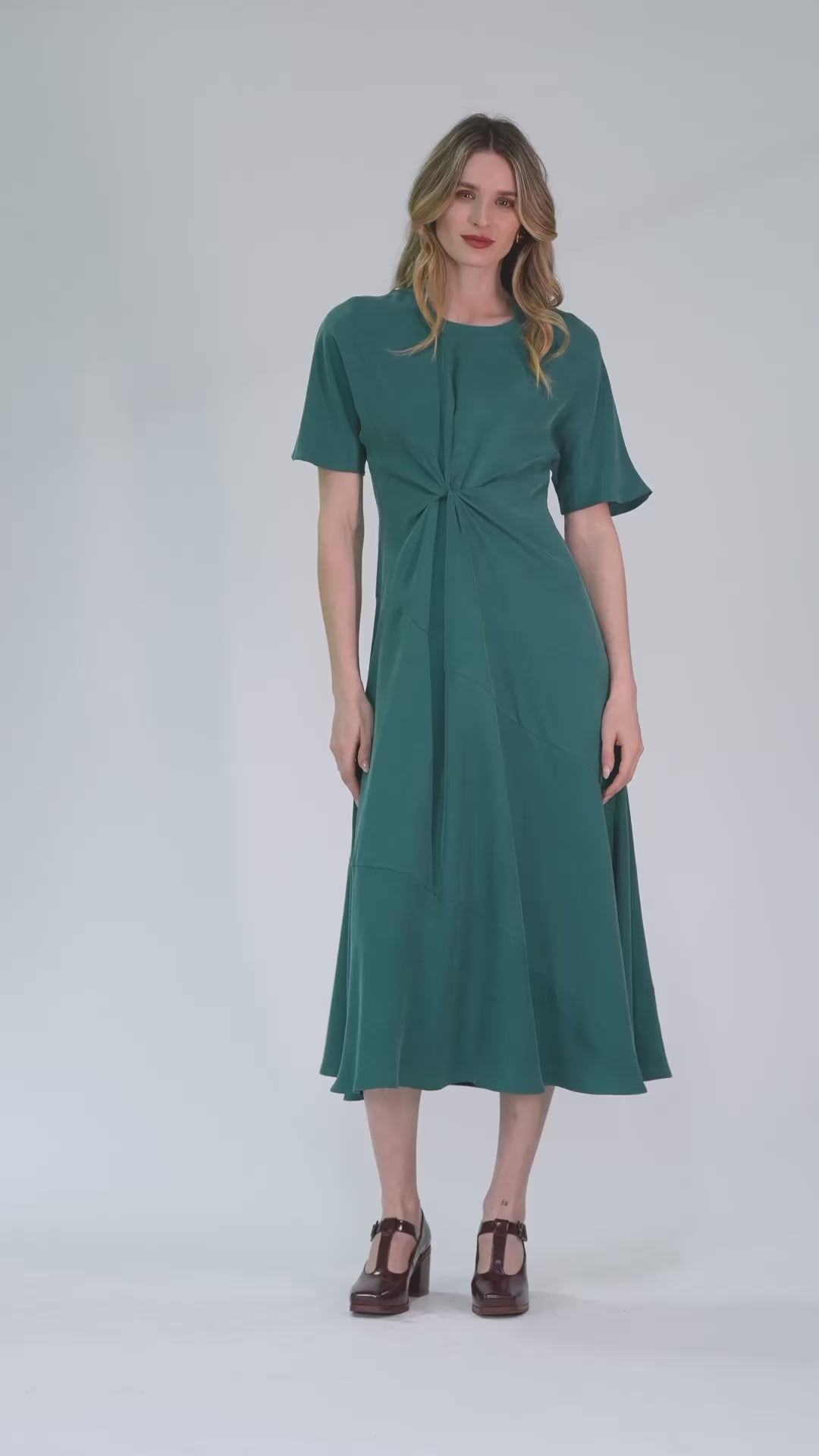 The Heden Dress is a short sleeve, flowy, mid-length style with a twist waist detail. This style features asymmetrical seam detailing and kimono-style sleeves. Made in a soft tencel twill fabrication.