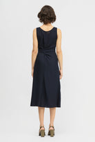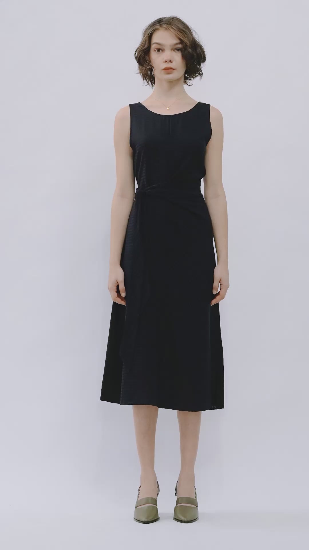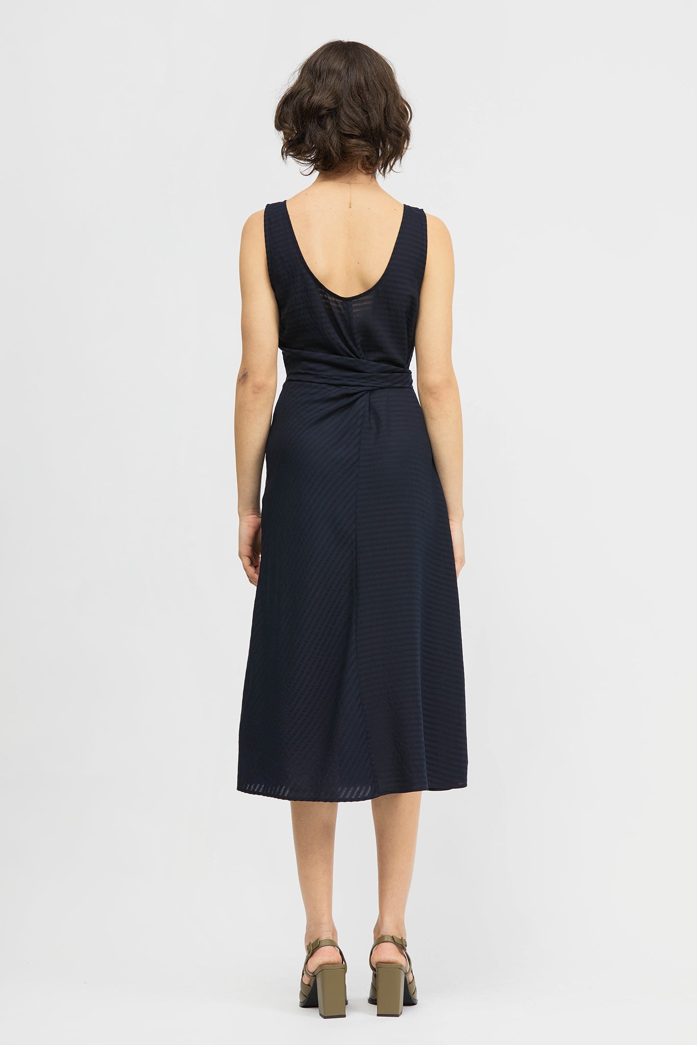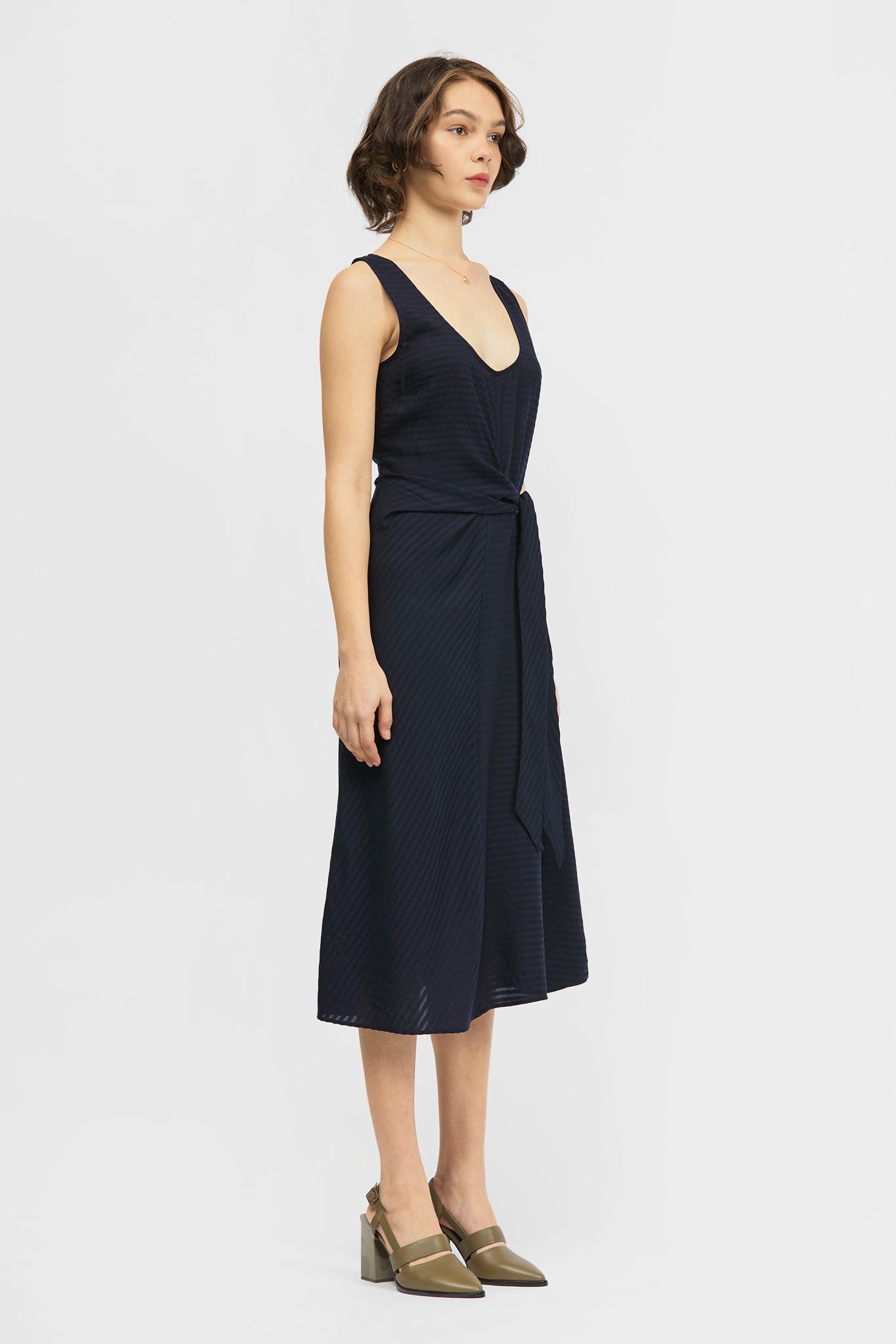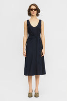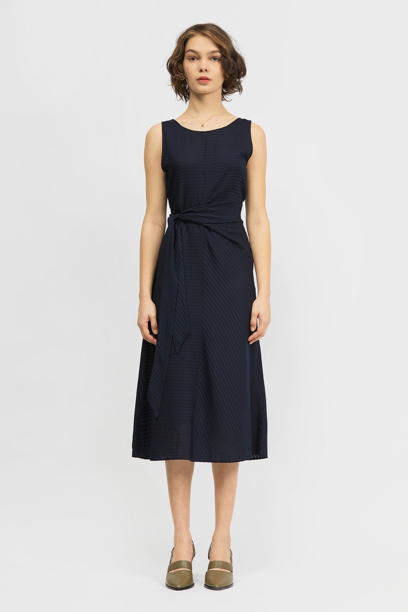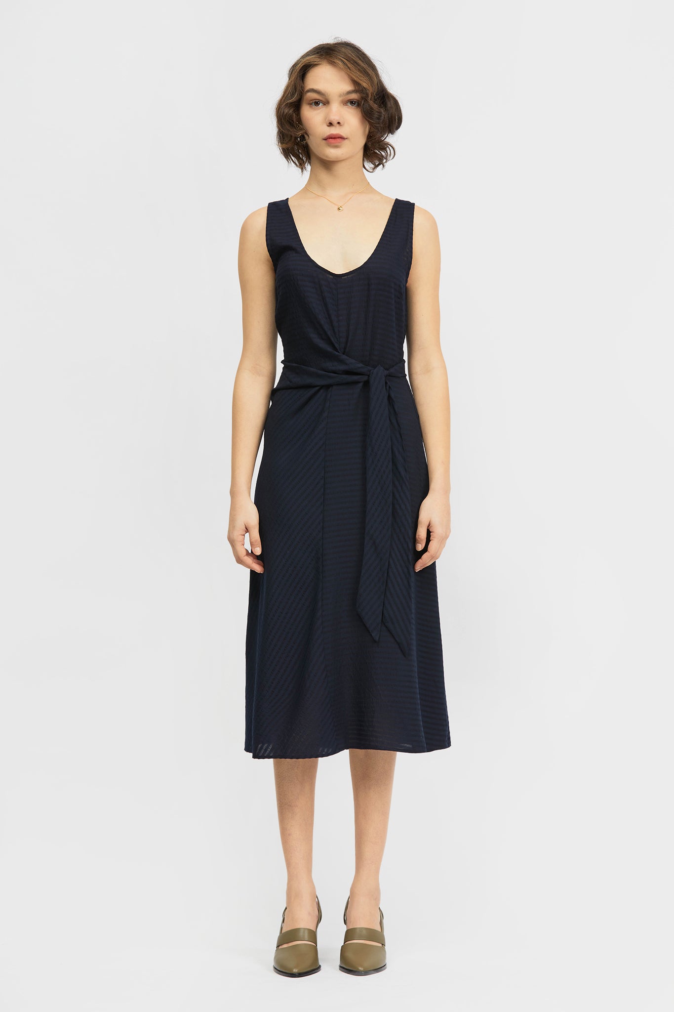 The Jayu Dress is a sleeveless, mid-length style in a regular fit. This style features a scooped neckline that can be worn towards the front or back and a tie detail that secures towards the side. Made in a soft stripe tencel fabrication.