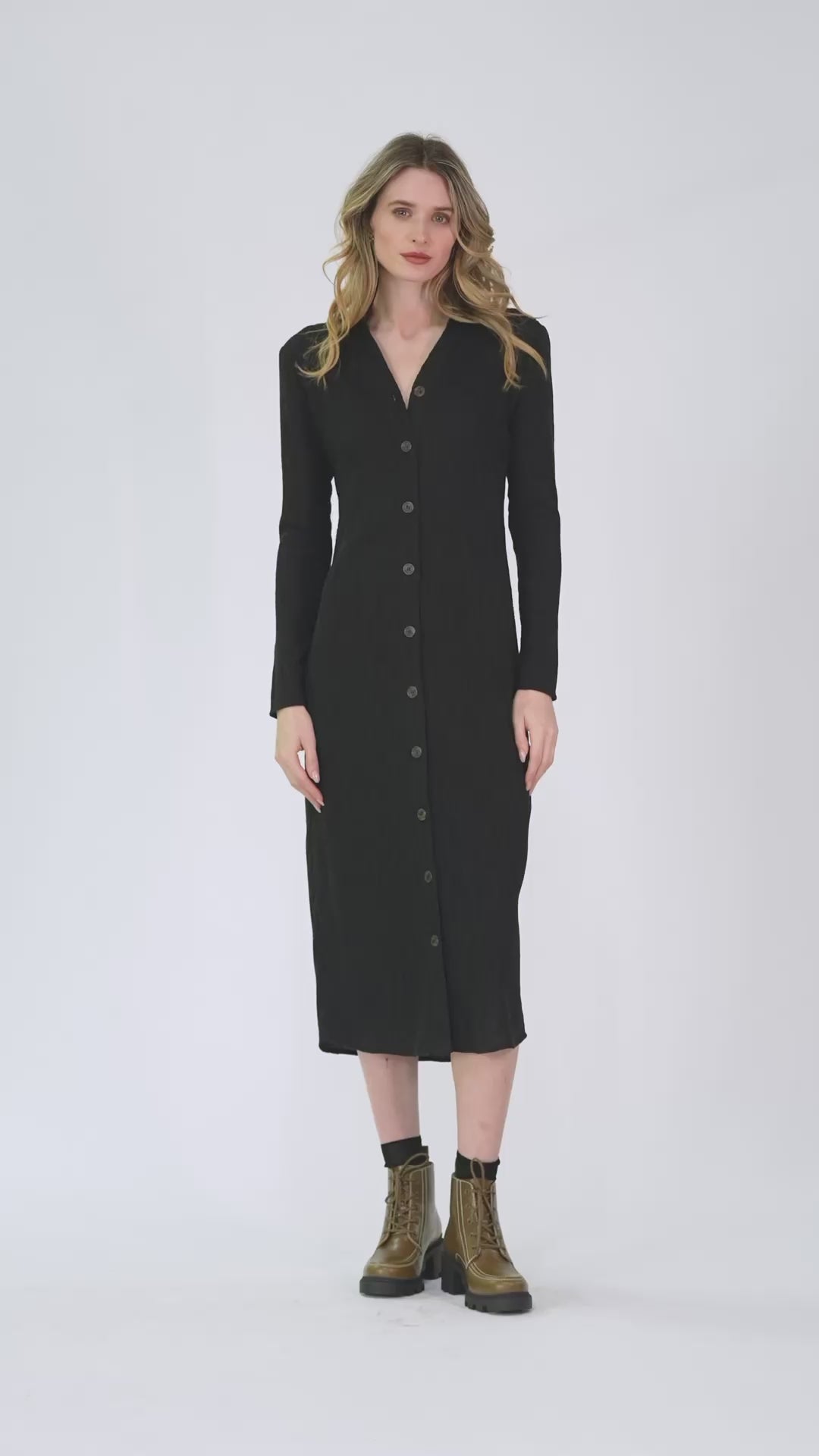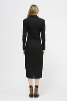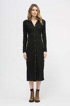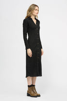 The Keel dress is a regular fit style in mid-length. Design details include an open collar, button-up front and button-up placket detail at sleeve cuff. Made from a tencel/ polyester stretch fabrication.