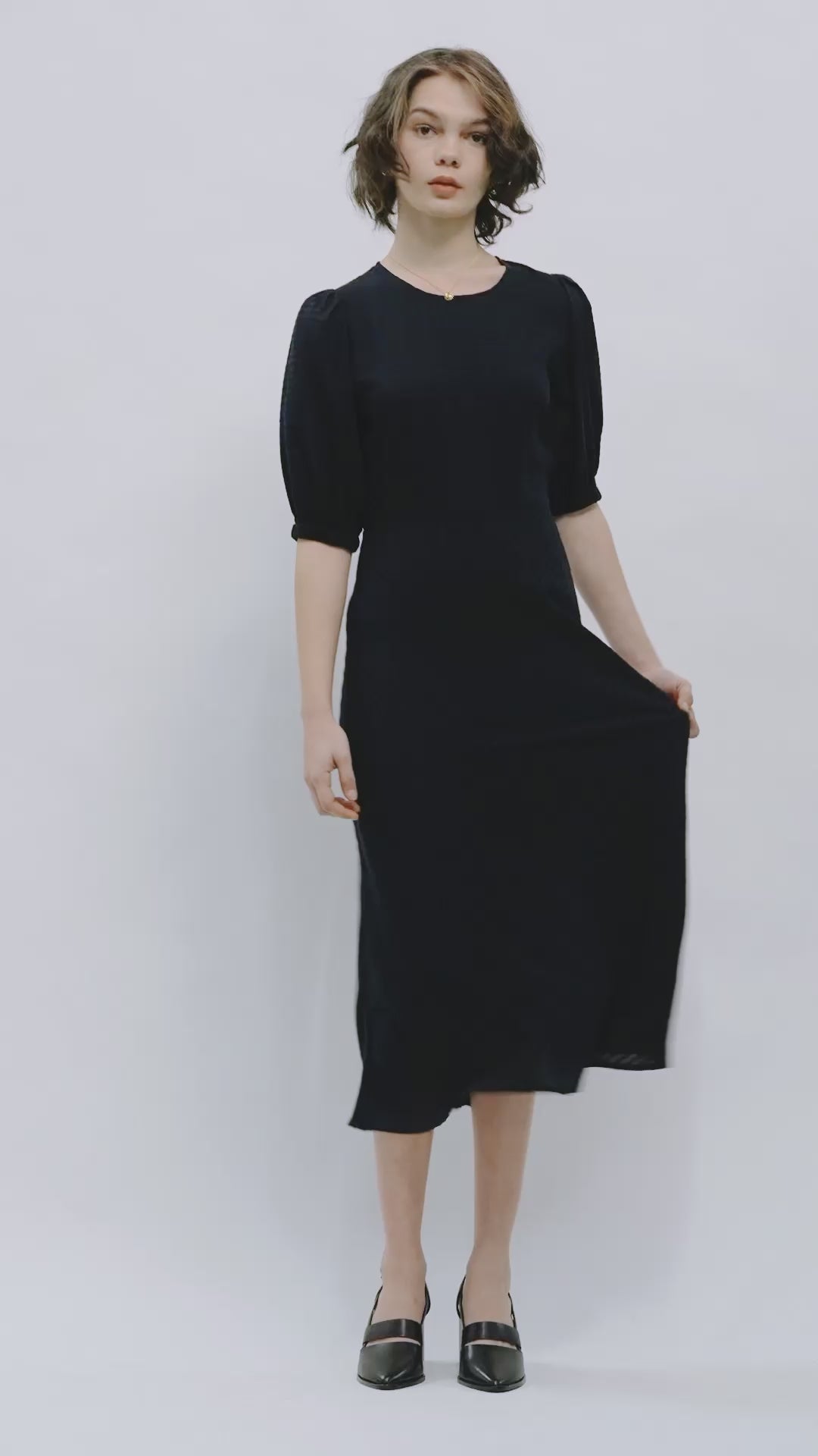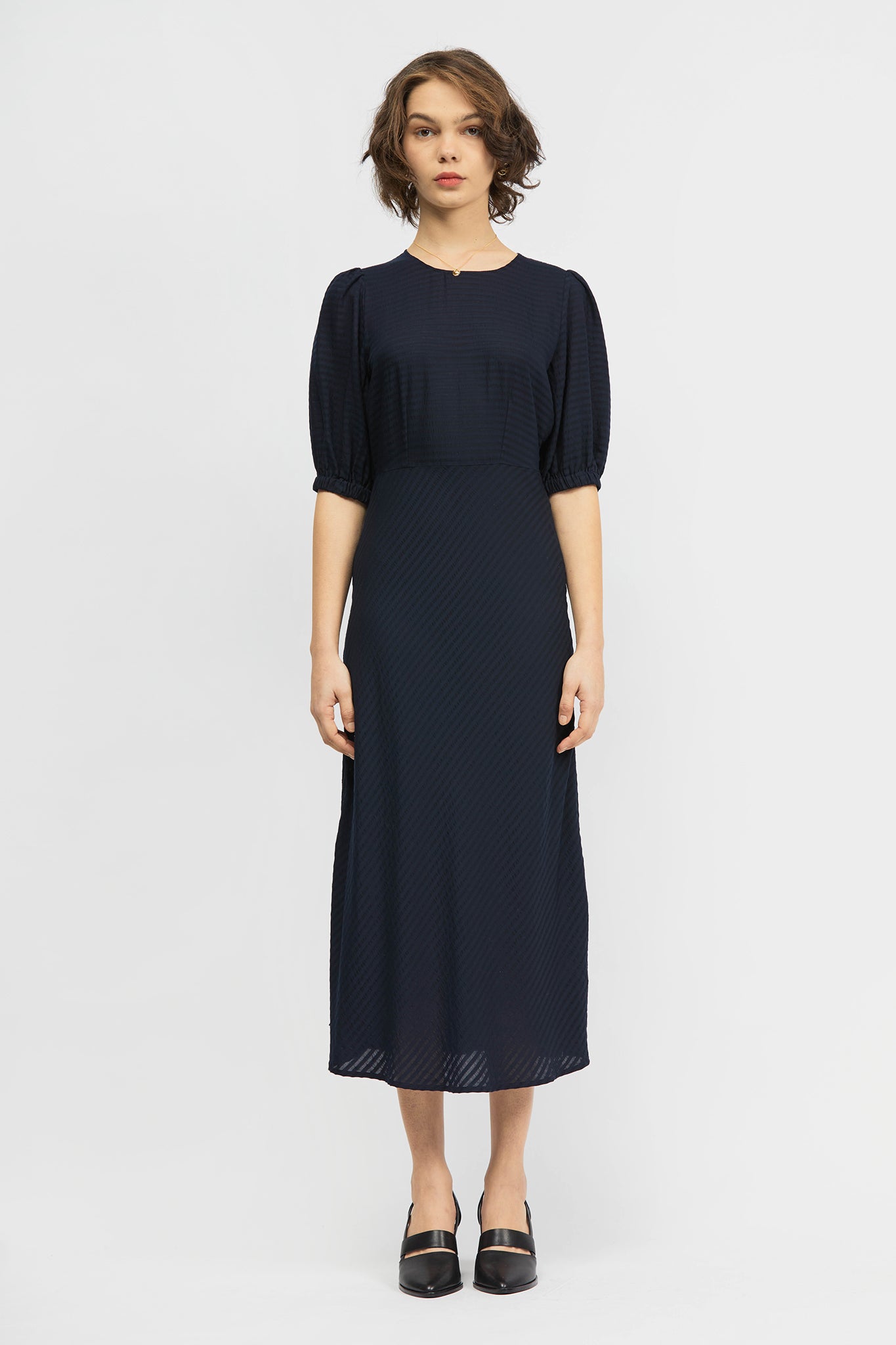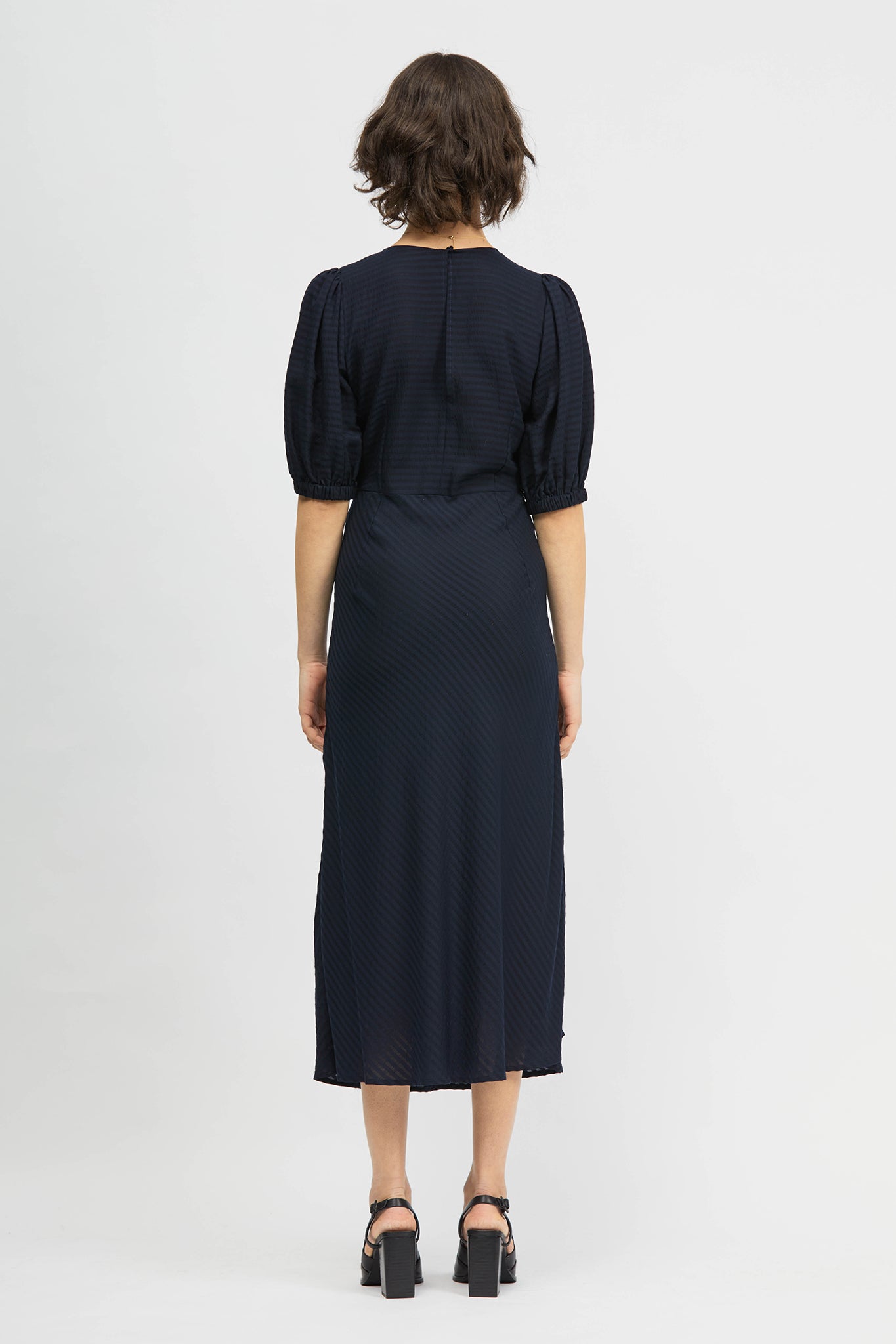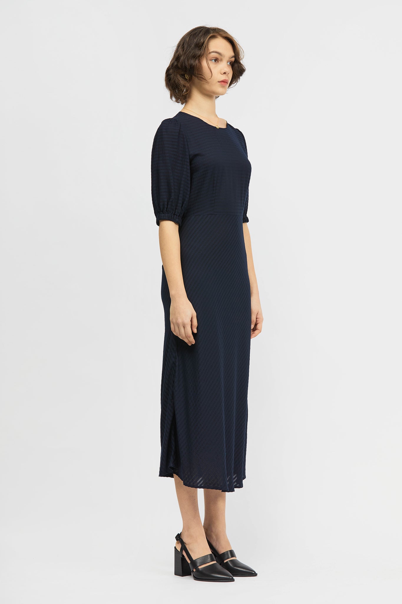 The Leo Midi Dress is an A-line, mid-length style, with a regular fit. This style includes voluminous short sleeves, dart detailing and inseam pockets. Made from a soft stripe tencel fabrication.