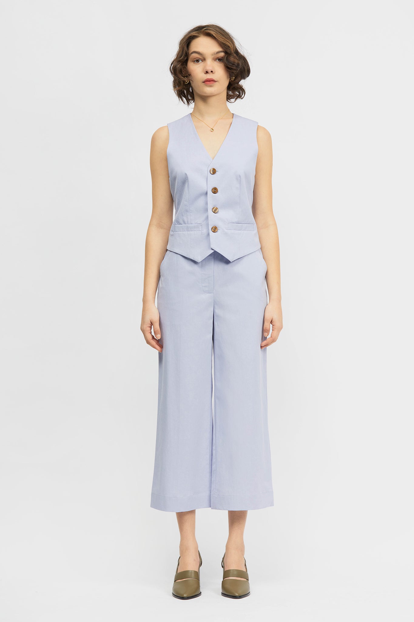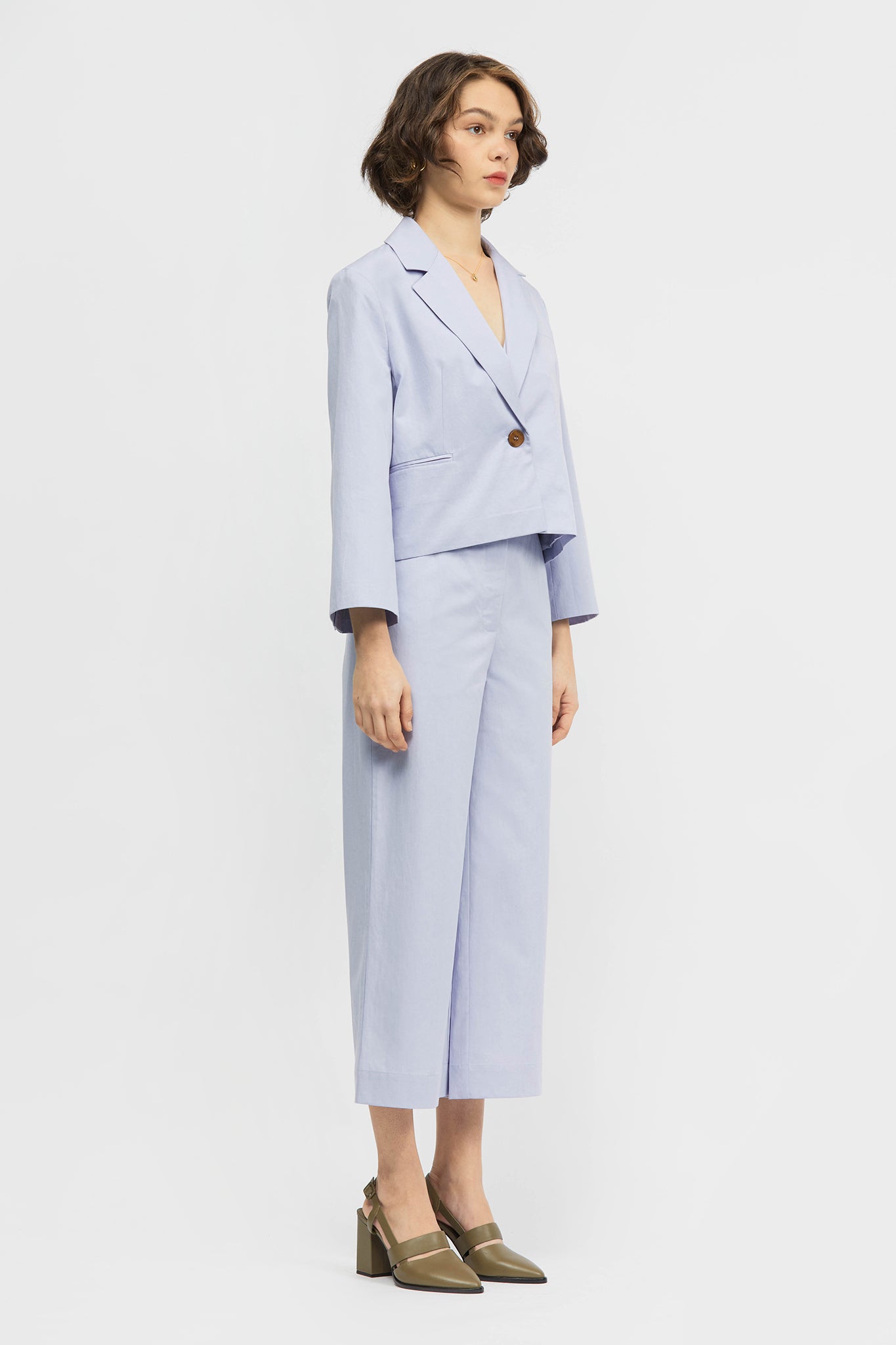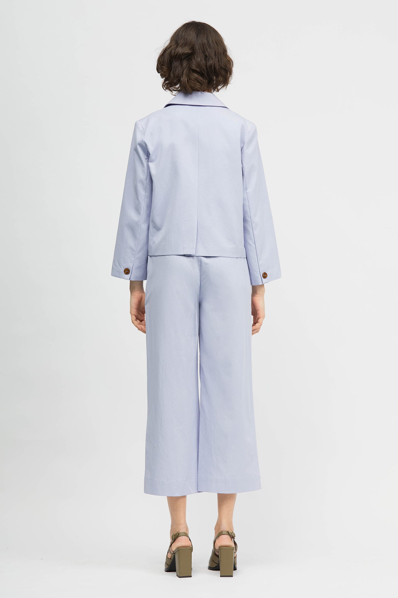 The Minhwa Blazer is a single breasted, cropped- length blazer in regular fit. This style offers a traditional lapel and collar, back vent, functional front welt pockets and an internal breast pocket. Made in a lightweight cotton/ tencel blend and fully lined in soft rayon. This style can be paired back with your existing wardrobe favourites or with the Brisa Pant and Ulster Vest in matching fabric as a set.
