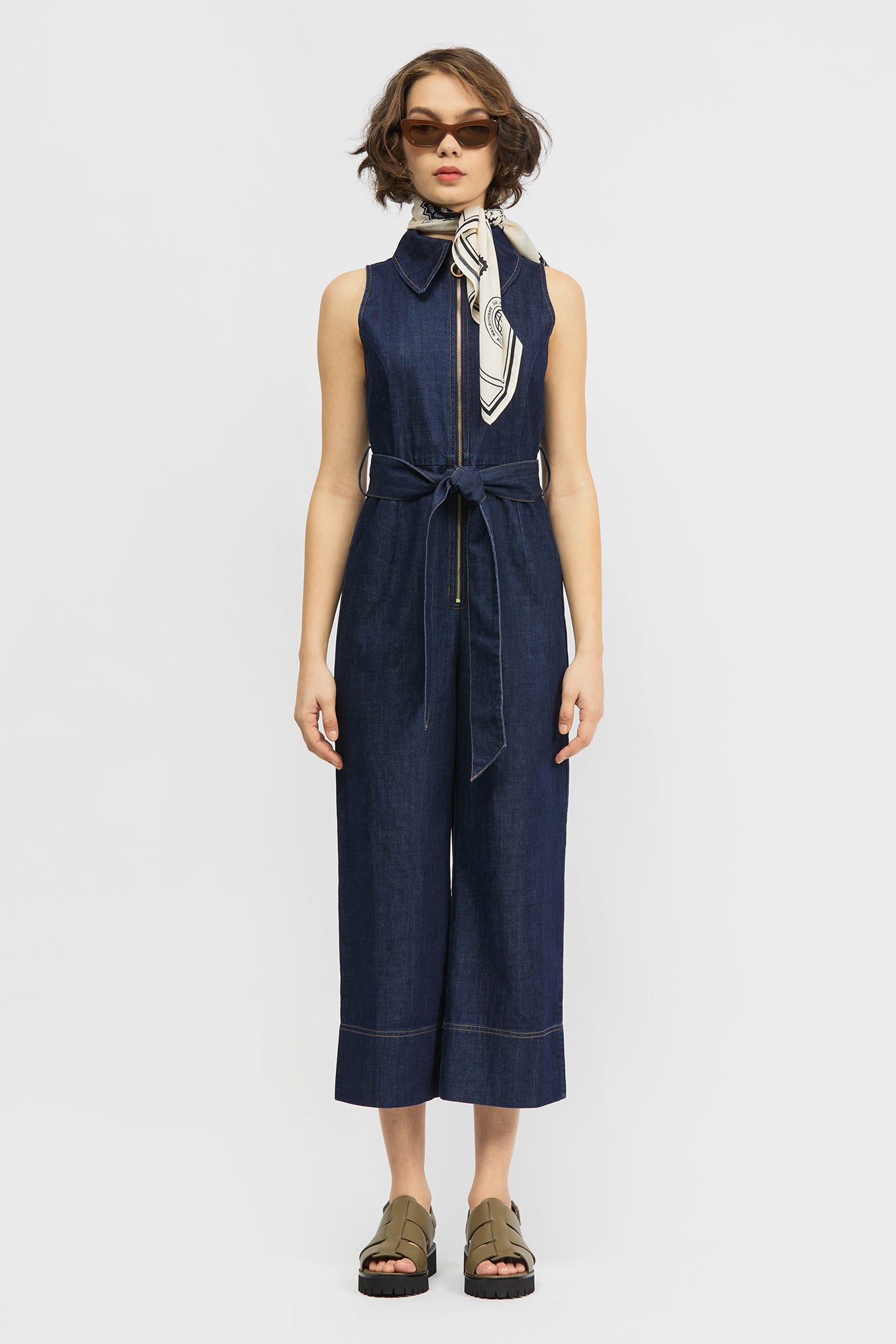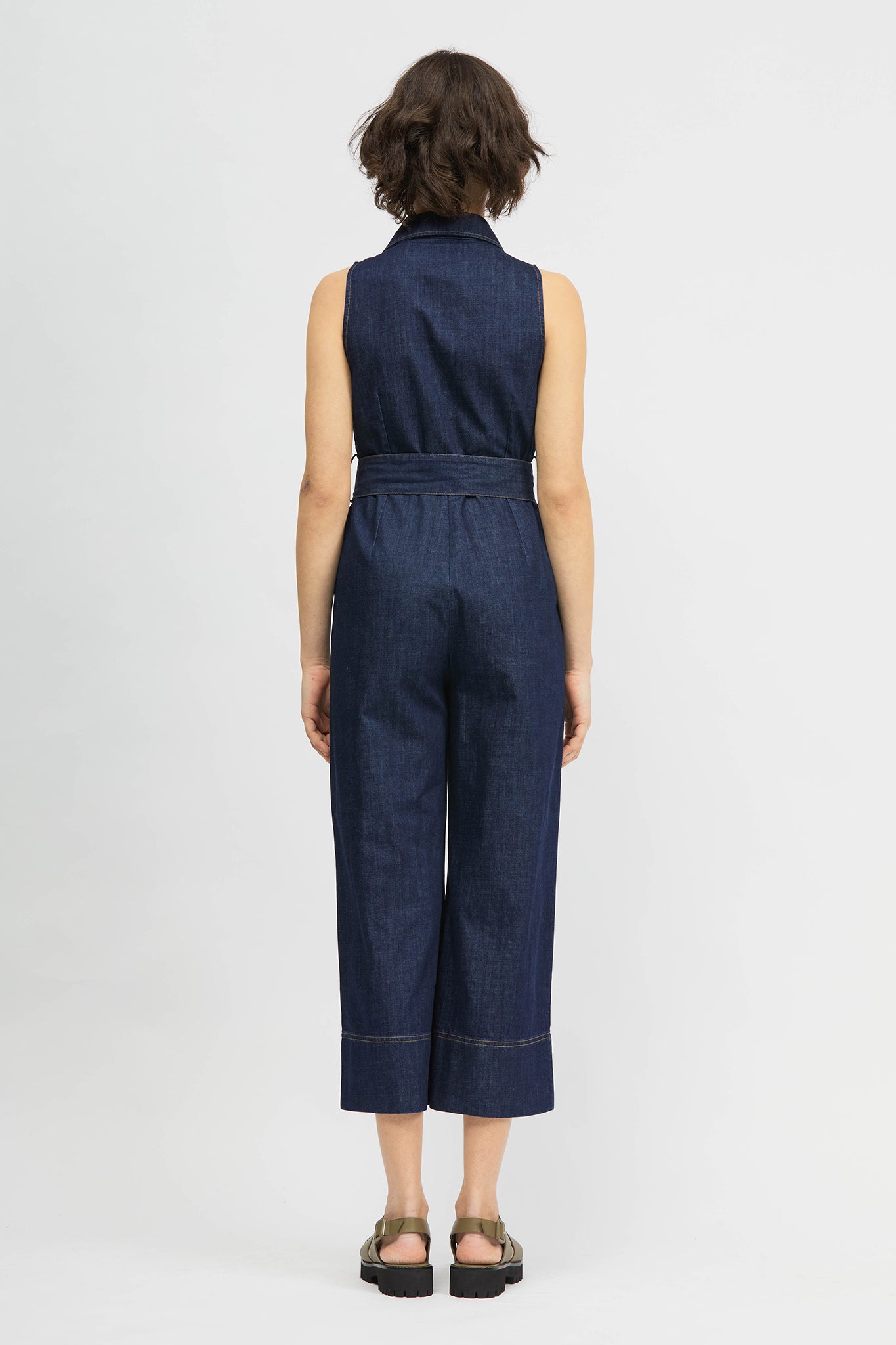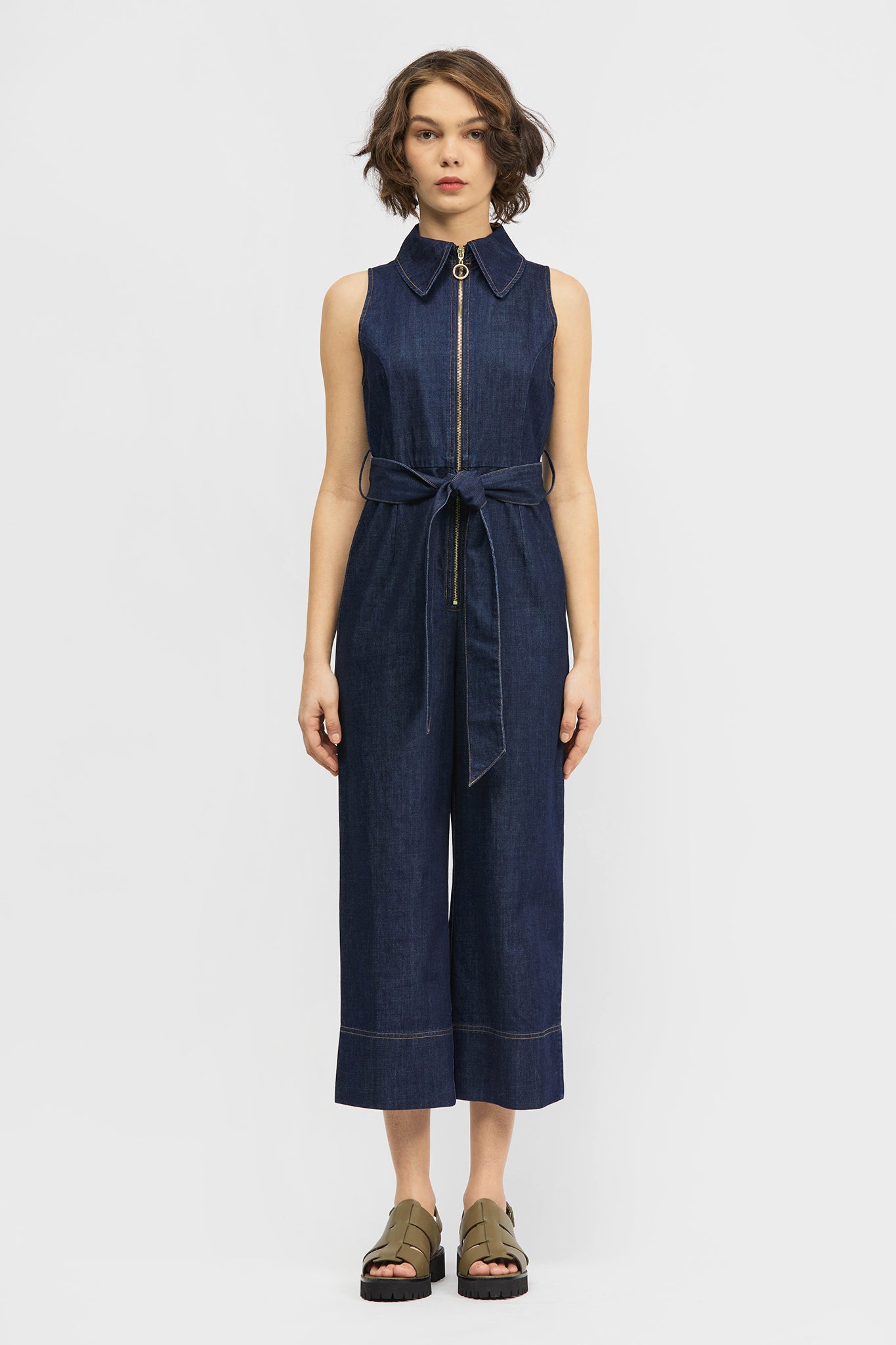 The Mocanal Onesie is a sleeveless, wide leg style with a cropped-length and tailored upper. This style offers a detachable tie-up belt, gold tone zip, contrast topstitching and dart detailing. Made in a rigid, lightweight denim fabrication.