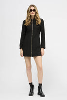 The Reekara Dress is a mini-length, long-sleeve style with a classic collar and panelling throughout. This style features stitching details, front patch pockets and a gold-toned zip through the centre front with a circular puller. This is a tailored fit style with shaping through the waist and a flared skirt. Made in a soft but structured stretch polyester fabrication.
