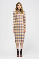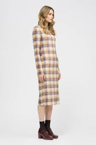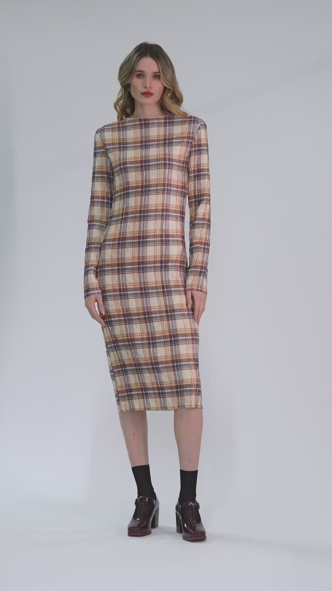 The Riptide Dress is a long sleeve, mid-length, relaxed fit style designed with a high neckline. This style is finished with soft baby lock at neckline and raw edges at hems. Made from a pleated fabrication with high stretch for comfort.