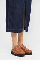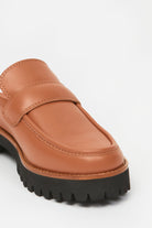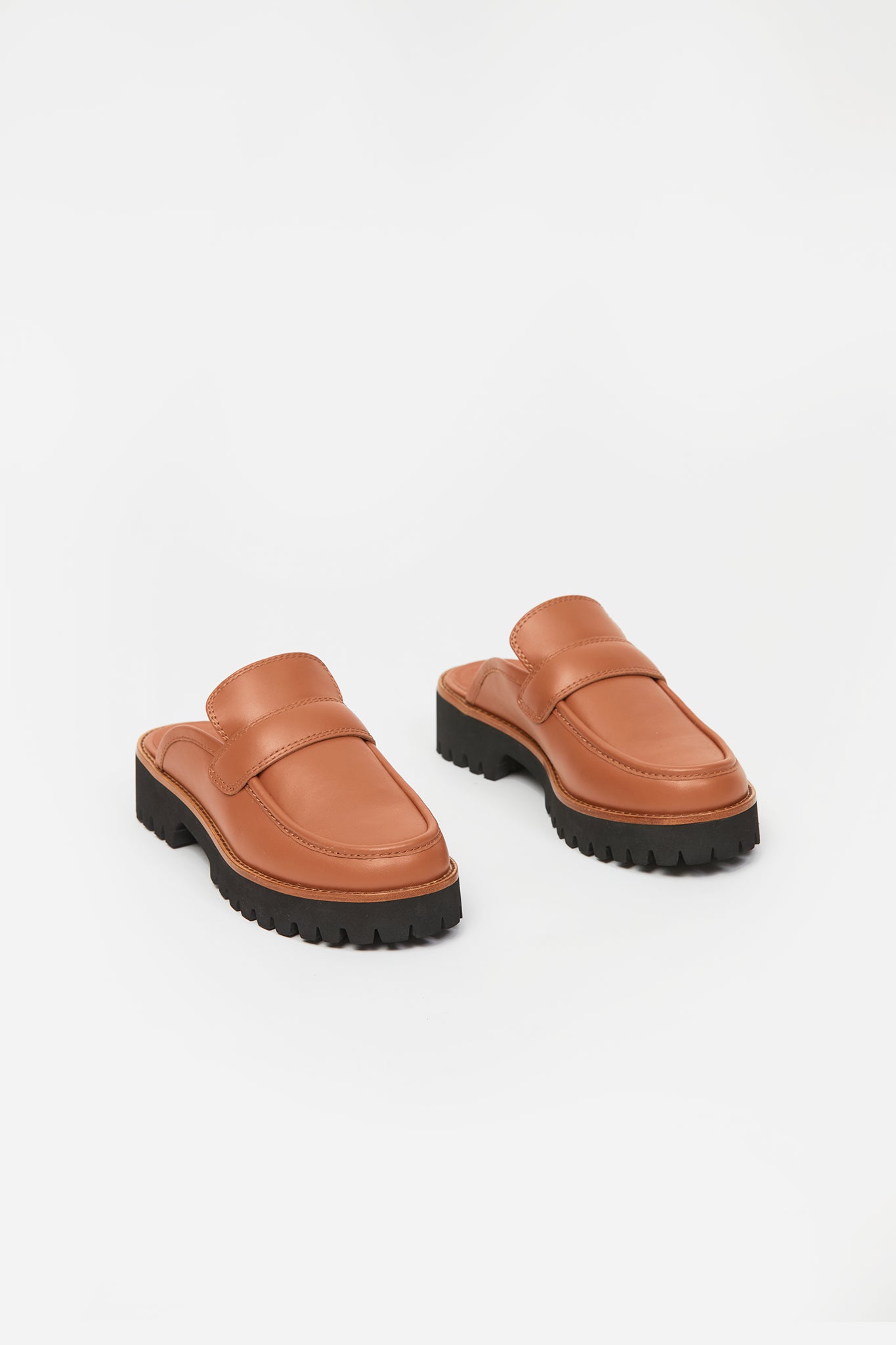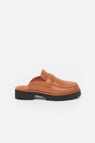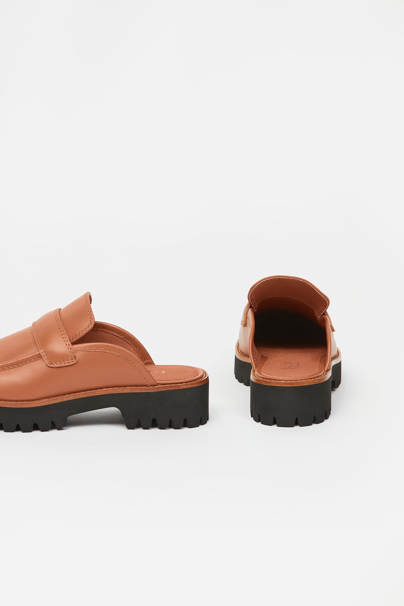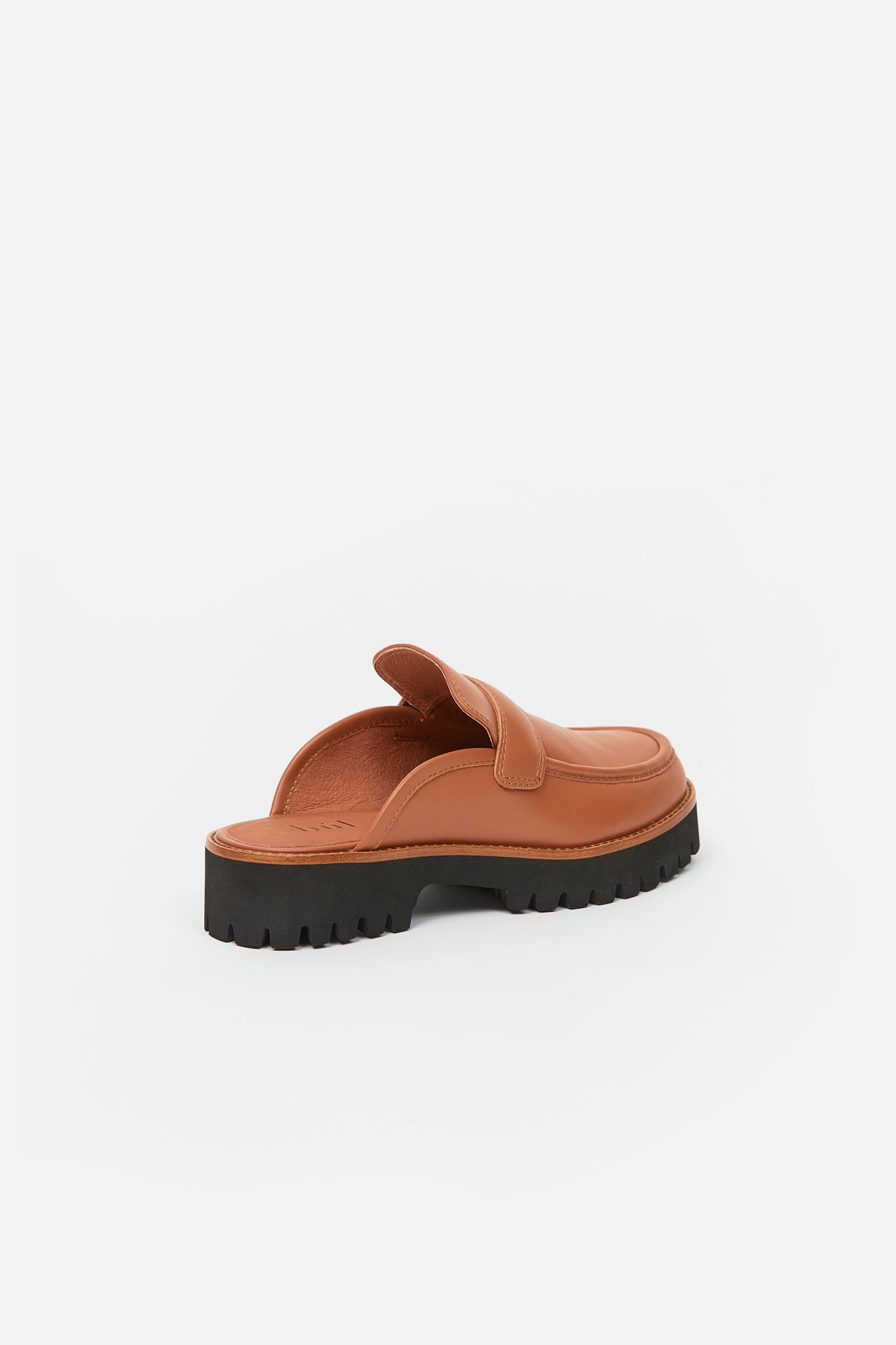The San Loafer is a backless, slide-on, loafer style with a lug sole. Features include a round toe, topstitch detailing and welt detail on the upper front. Made in smooth leather.
