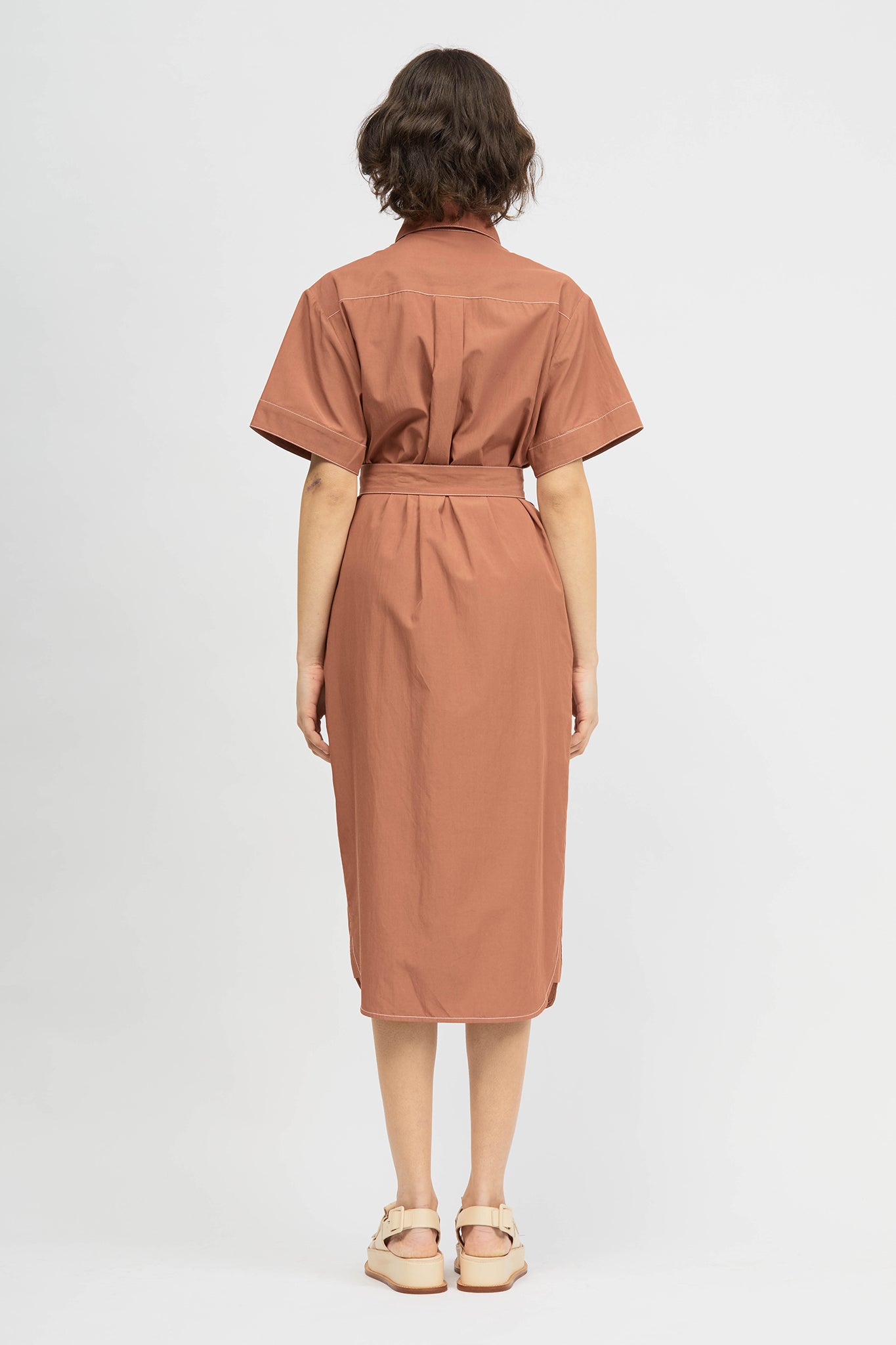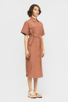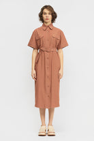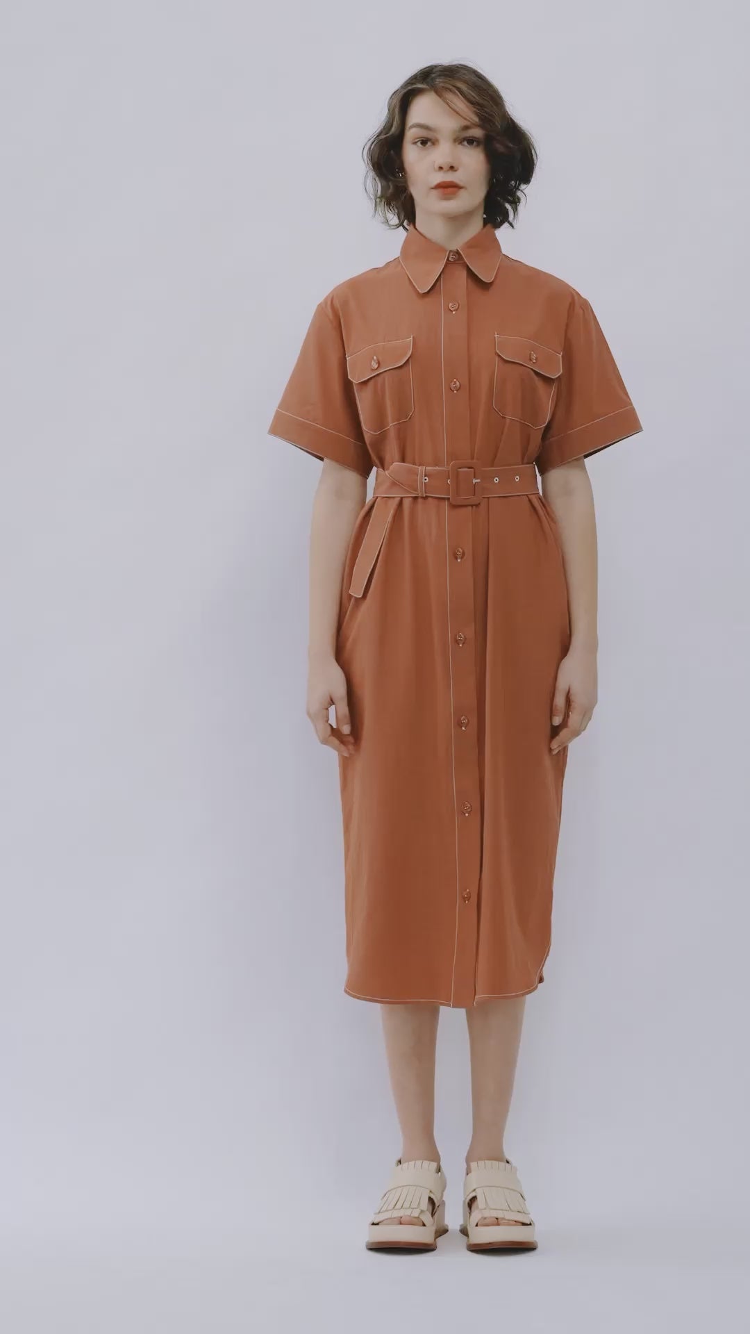 The Seom Dress is a relaxed fit, mid-length shirt dress with a button up front. Features include short sleeves with cuff detail and a traditional collar with rounded points. This style offers contrast cream top stitching, inseam pockets, patch pockets on the front chest and a removable belt with a self-covered buckle. Made from a lightweight viscose/ cotton blend.