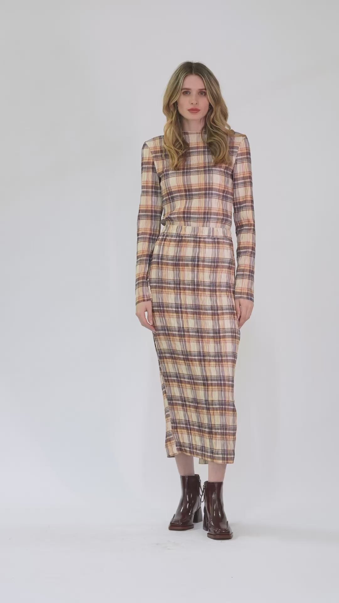 The Wave Top is a long sleeve, relaxed fit style designed with a high neckline. This style is finished with soft baby lock at neckline and raw edges at hems. Made from a pleated fabrication with high stretch for comfort. This style can be paired back with your existing wardrobe favourites or with the Hakea Skirt in matching fabric as a set.