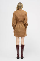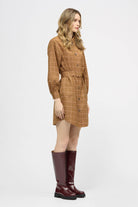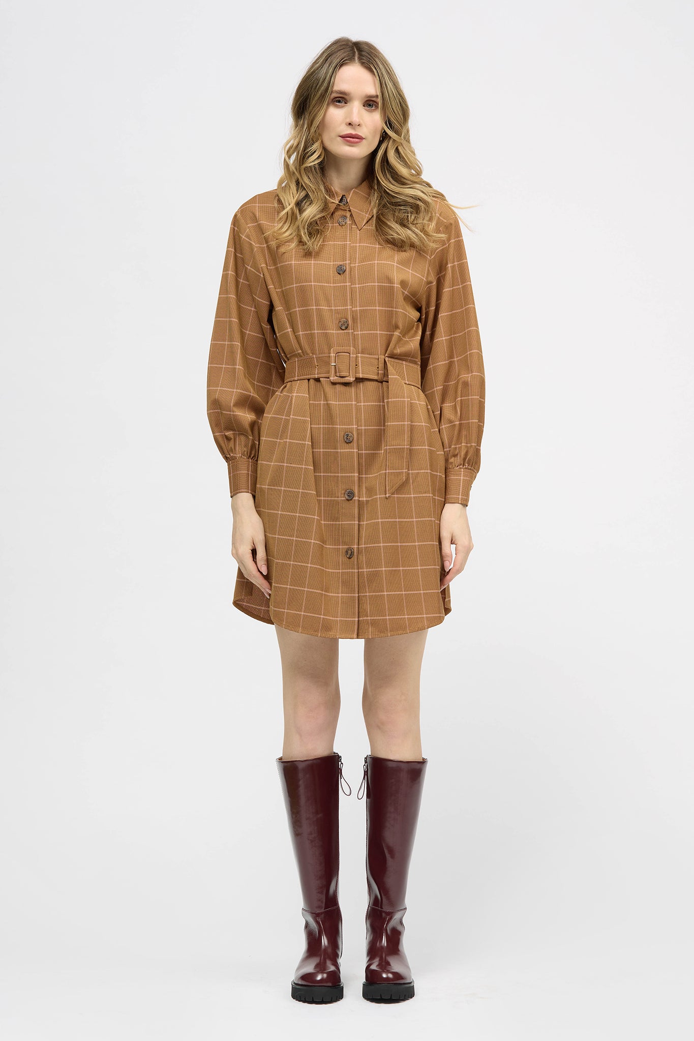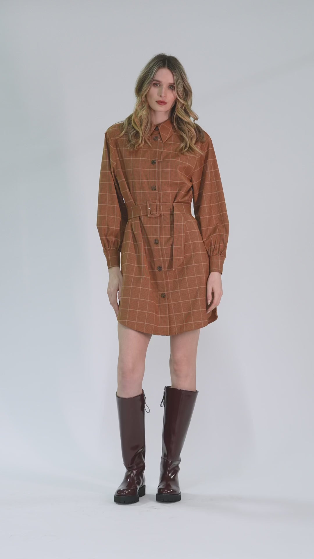 The Whistler Dress is a relaxed fit, shirt-dress style in a mini-length. This style features a classic shirt collar, button-up front, balloon style long sleeves with a button-up cuff, side seam pockets and a belt with self- covered buckle for fastening. Made in a soft polyester/ rayon blend.