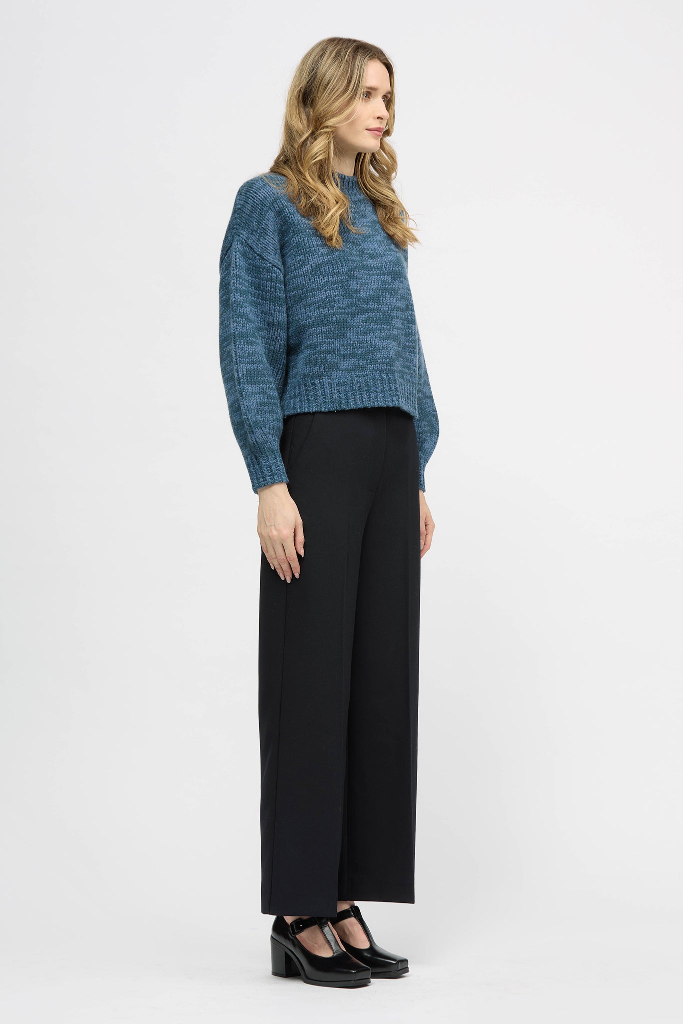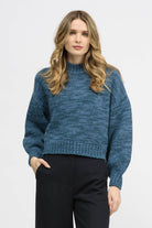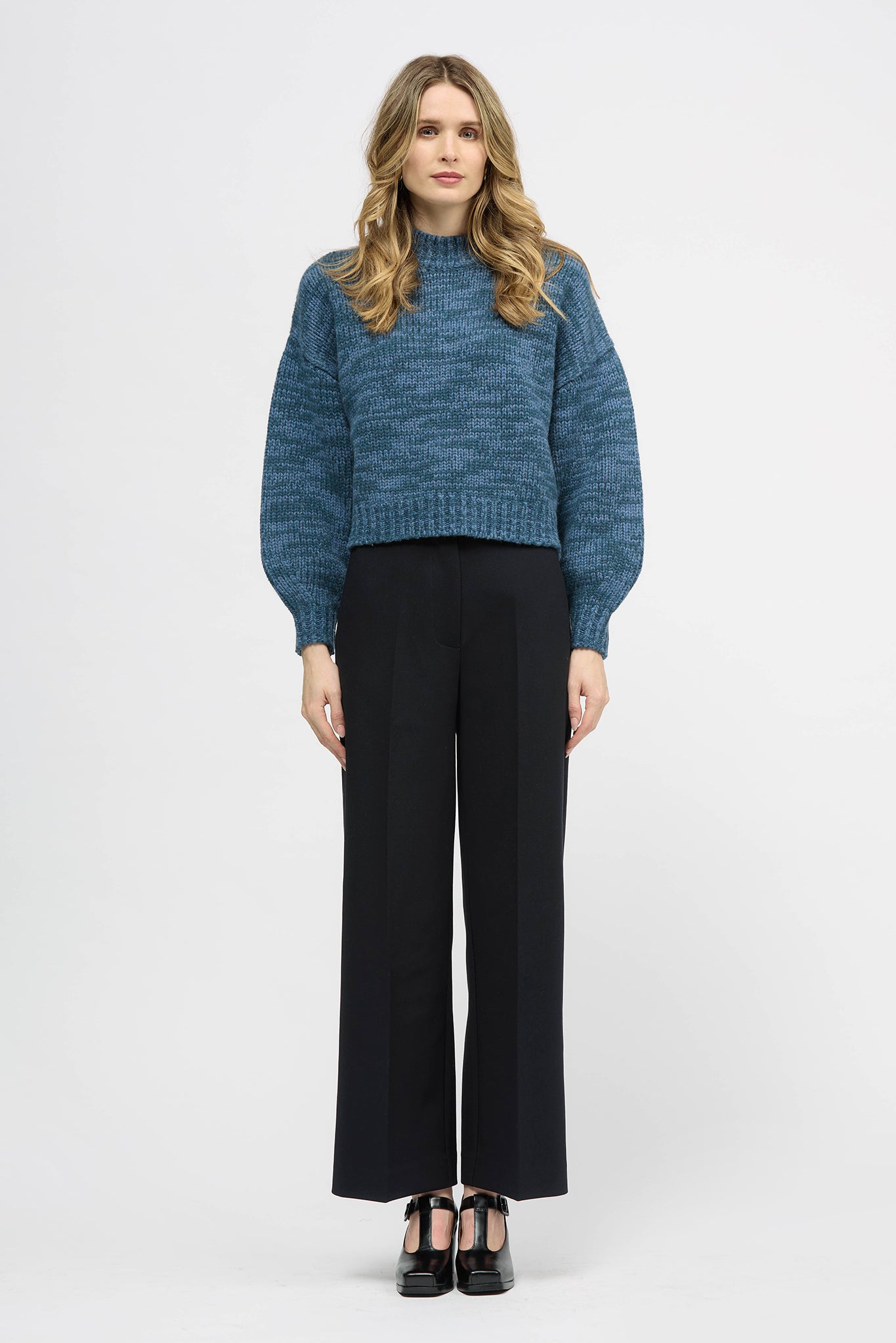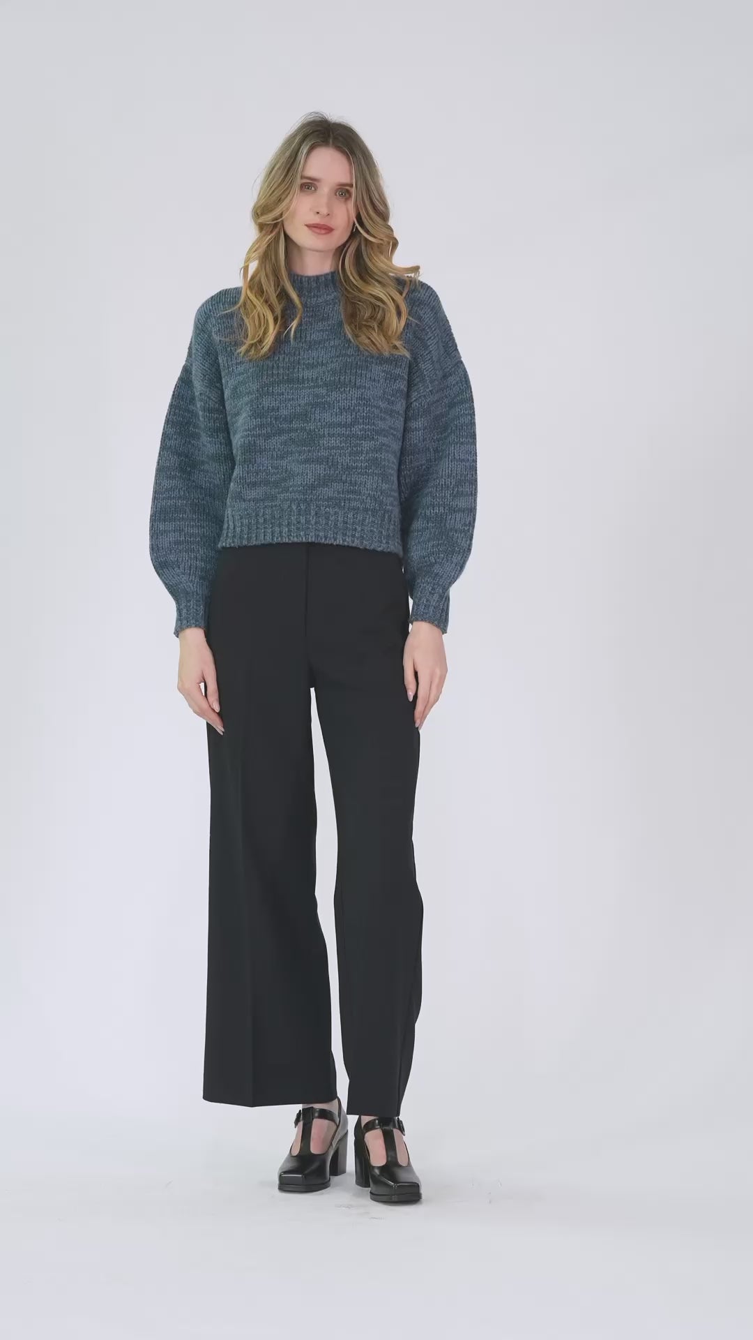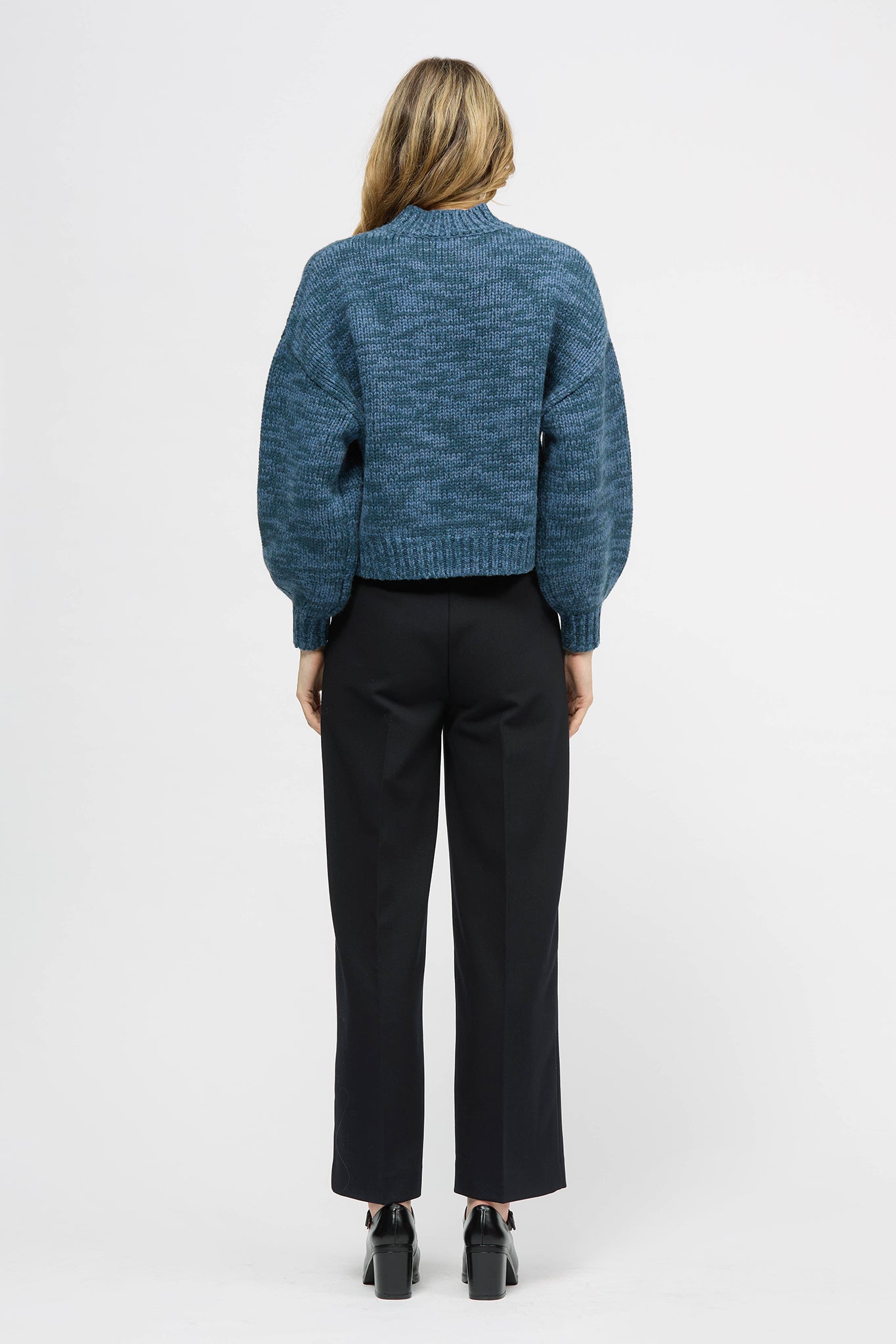 The Annie Jumper is a relaxed fit, long sleeve pullover. It features balloon style sleeves that gather into rib cuffs as well as a rib neck and hem. Made from a chunky, twisted multi-tone, merino wool yarn.
