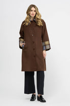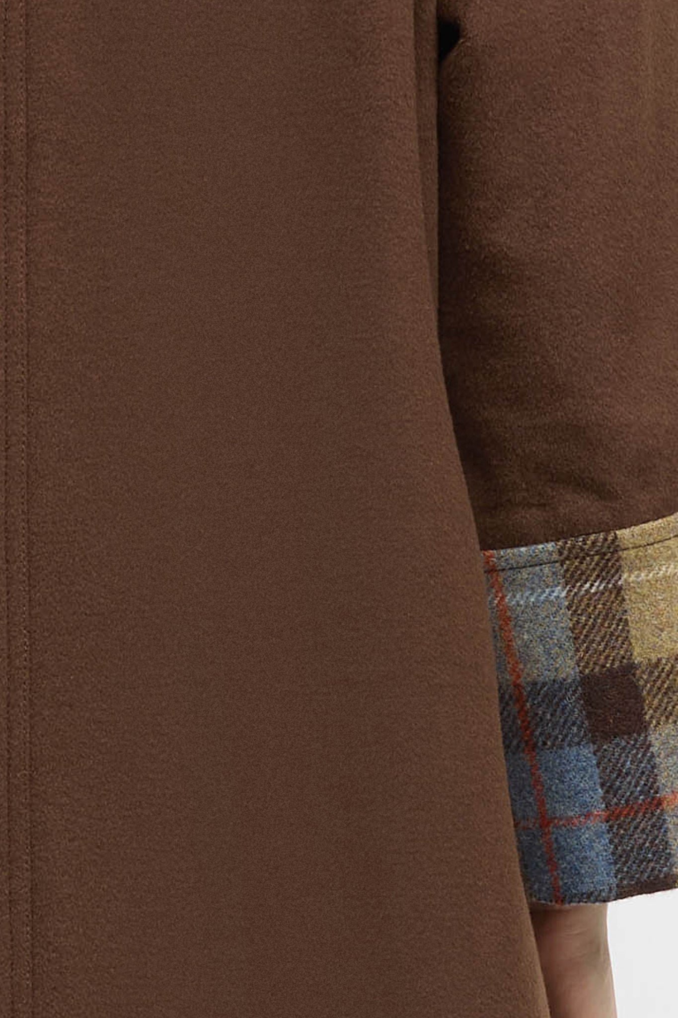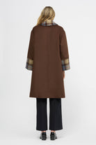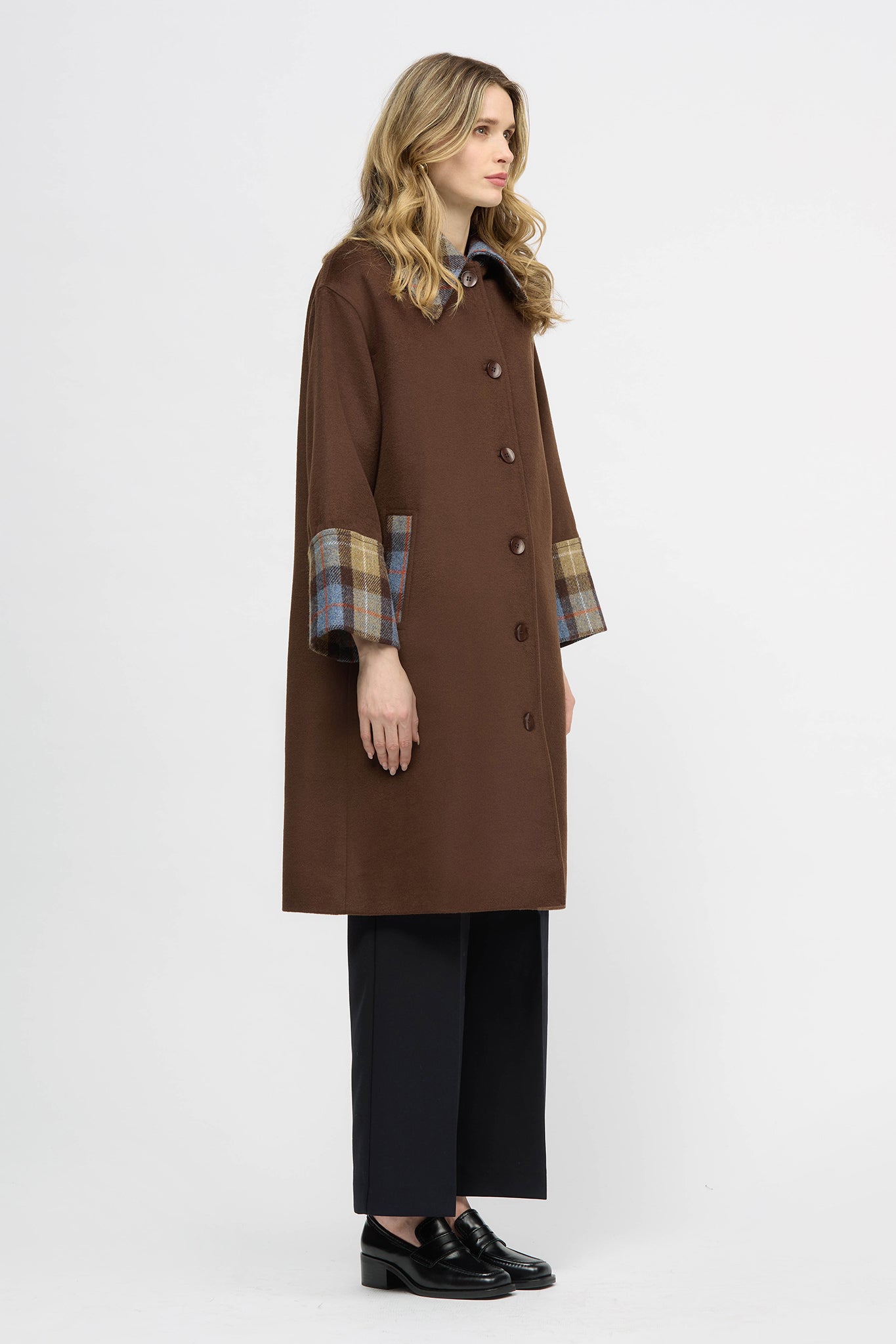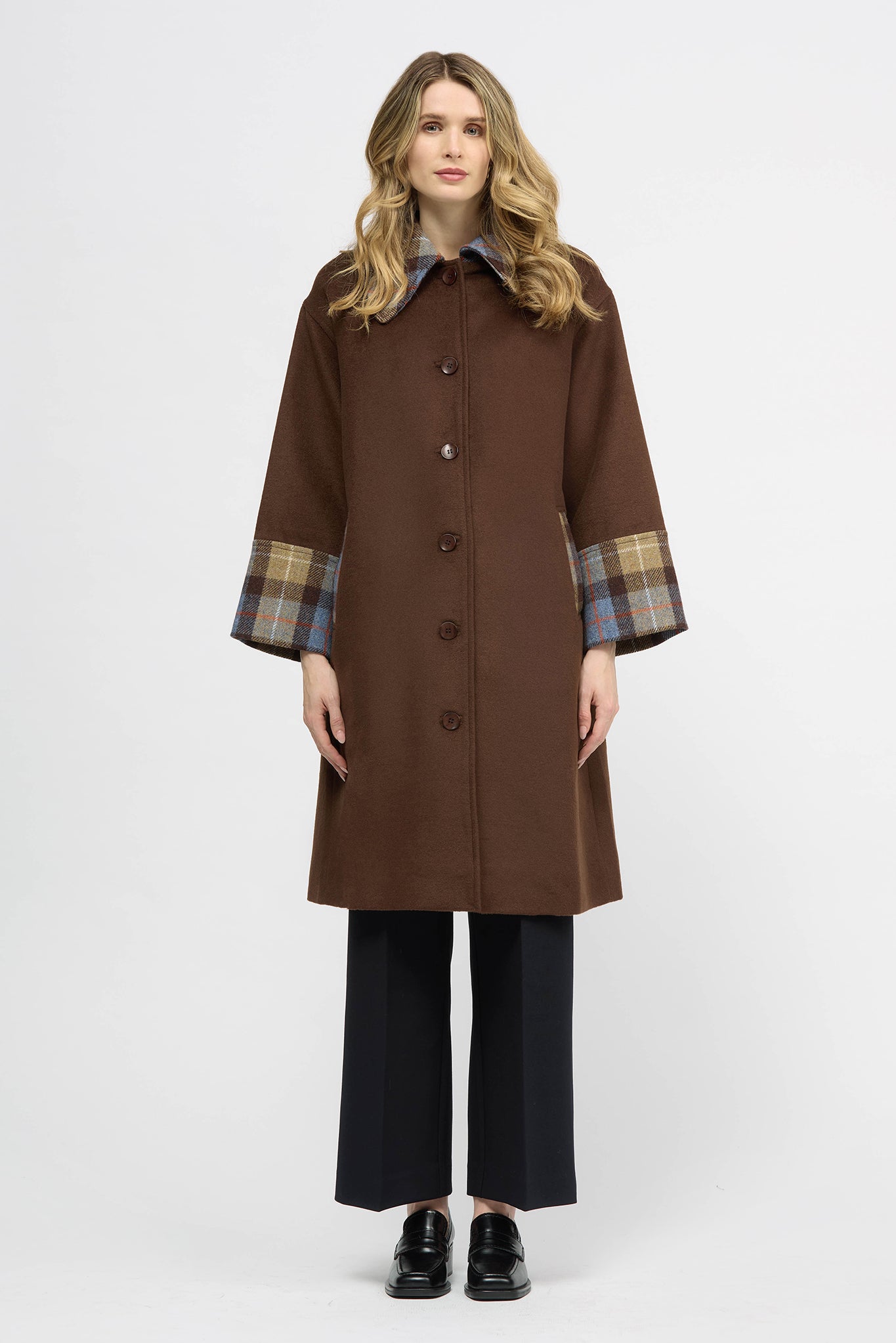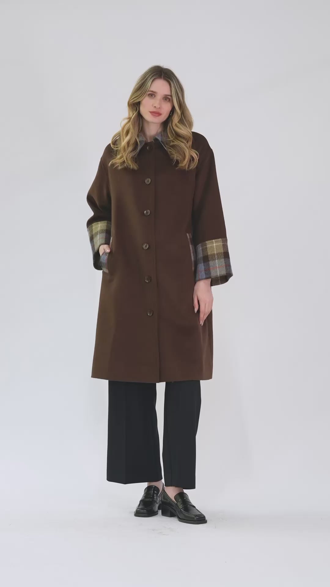 The Bottlebrush coat is a single breasted, long length style with a dropped shoulder and exaggerated sized collar. This style features contrasted check fabric at collar, pockets and extended cuffs. This style offers two slanted front welt pockets and an interior breast pocket, exposed buttons along the front for fastening and is finished with a hanger loop in the interior back neck. Made with a warm wool blend, 100% wool contrast detailing and is fully lined in a matching brown satin.