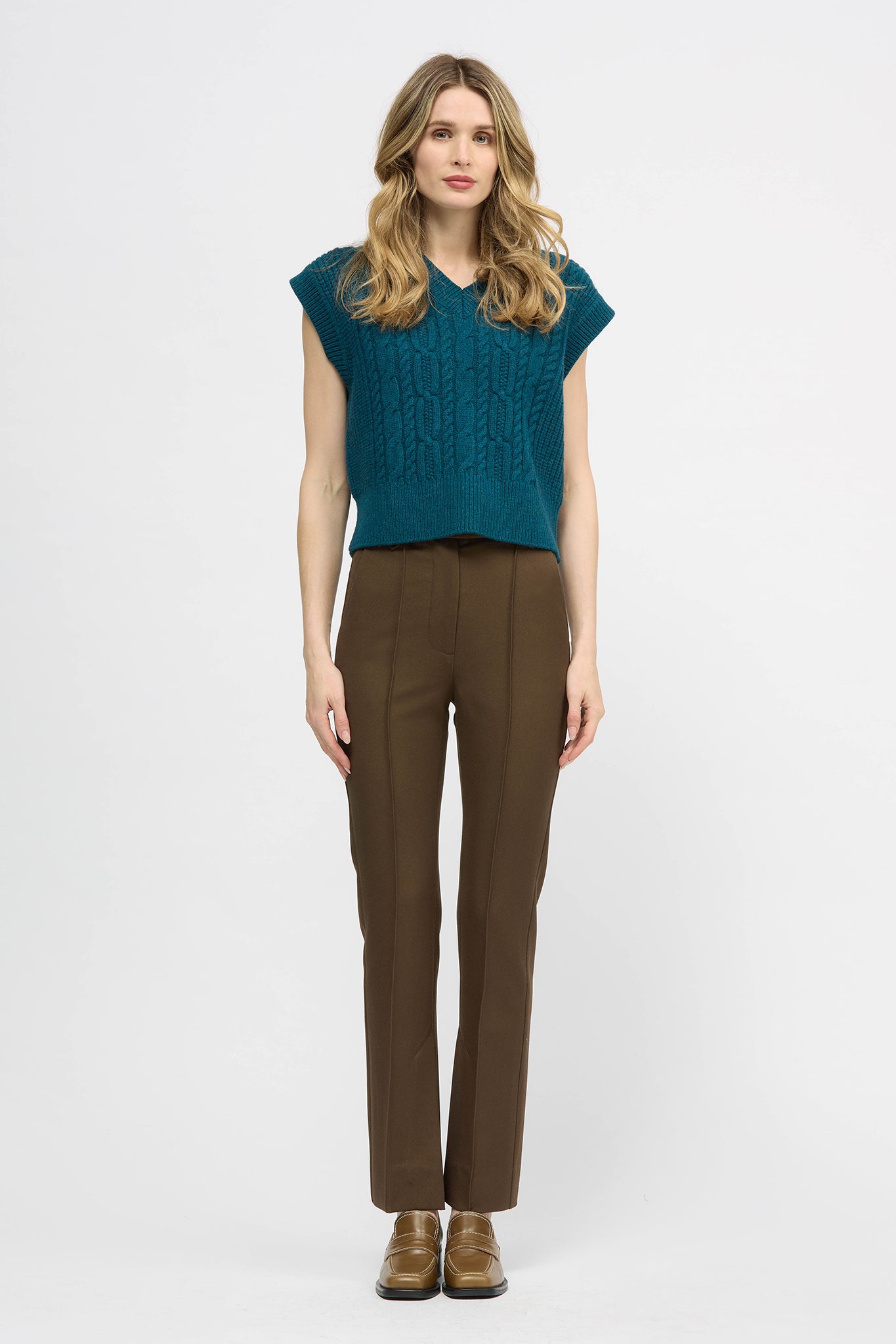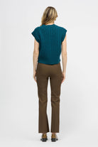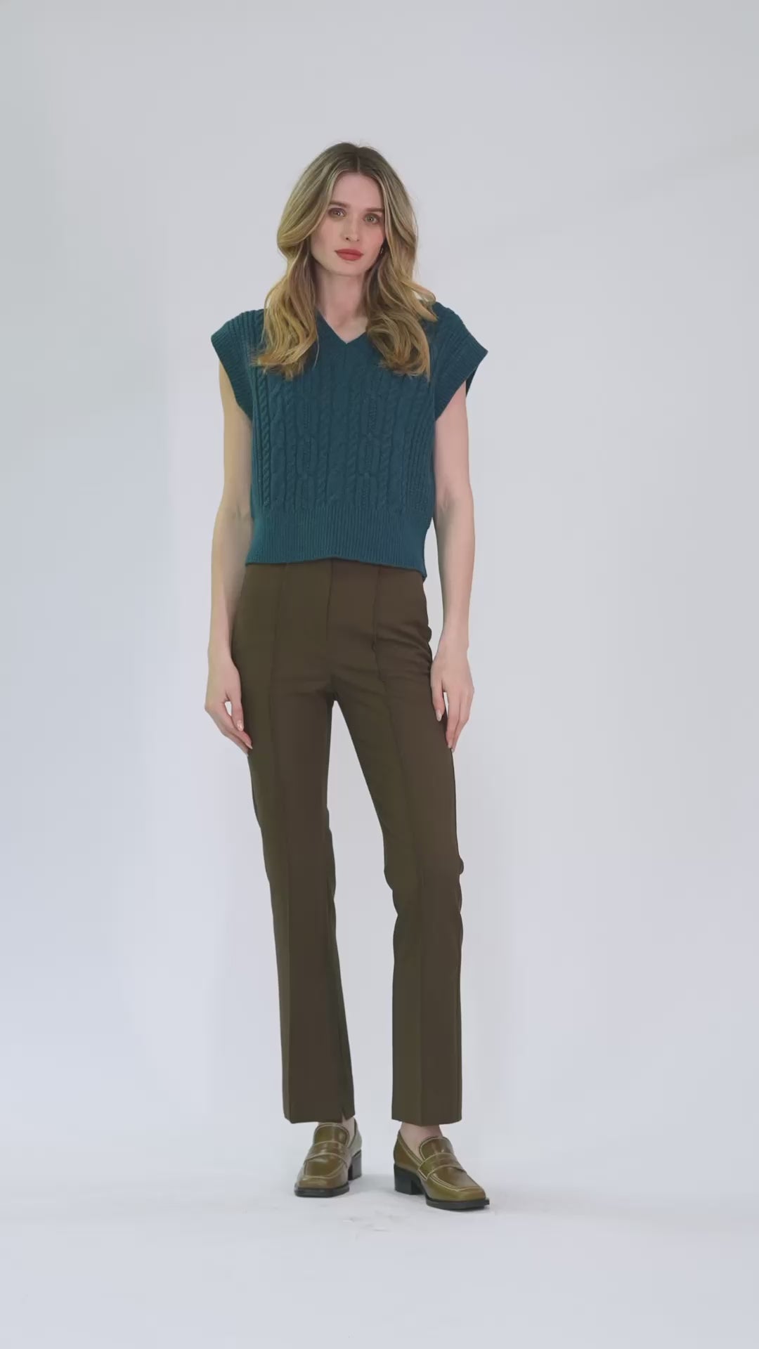 The Fairywren Vest is a V-neck, sleeveless, relaxed fit style. It features a cable knit design throughout and a rib knit neckline, armholes and hem. Made in a soft and warm merino wool.