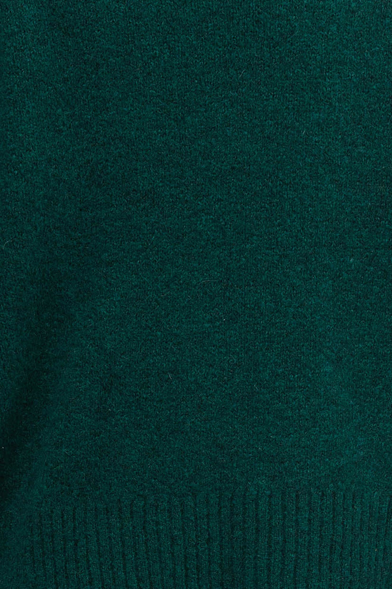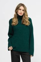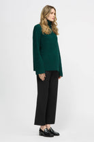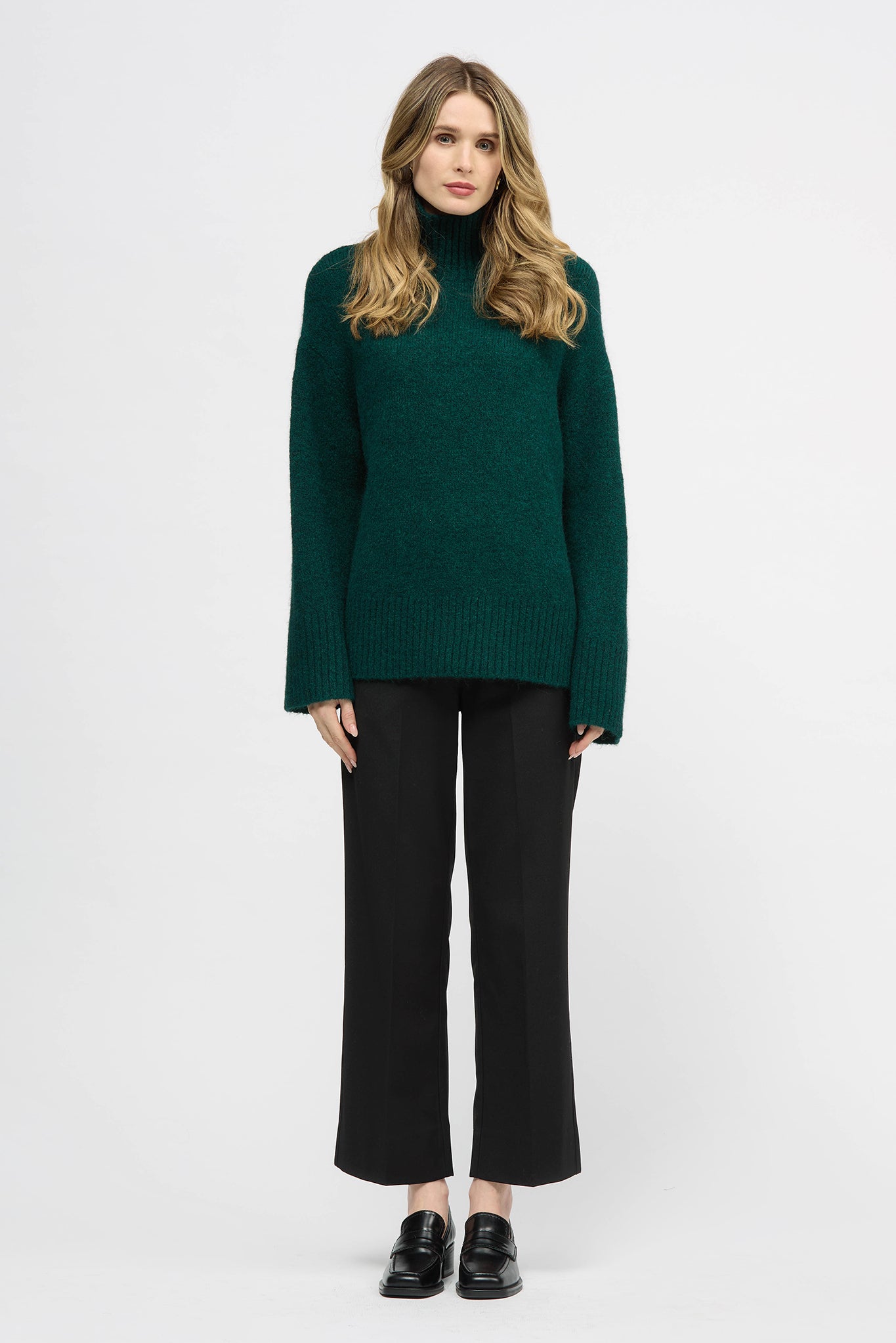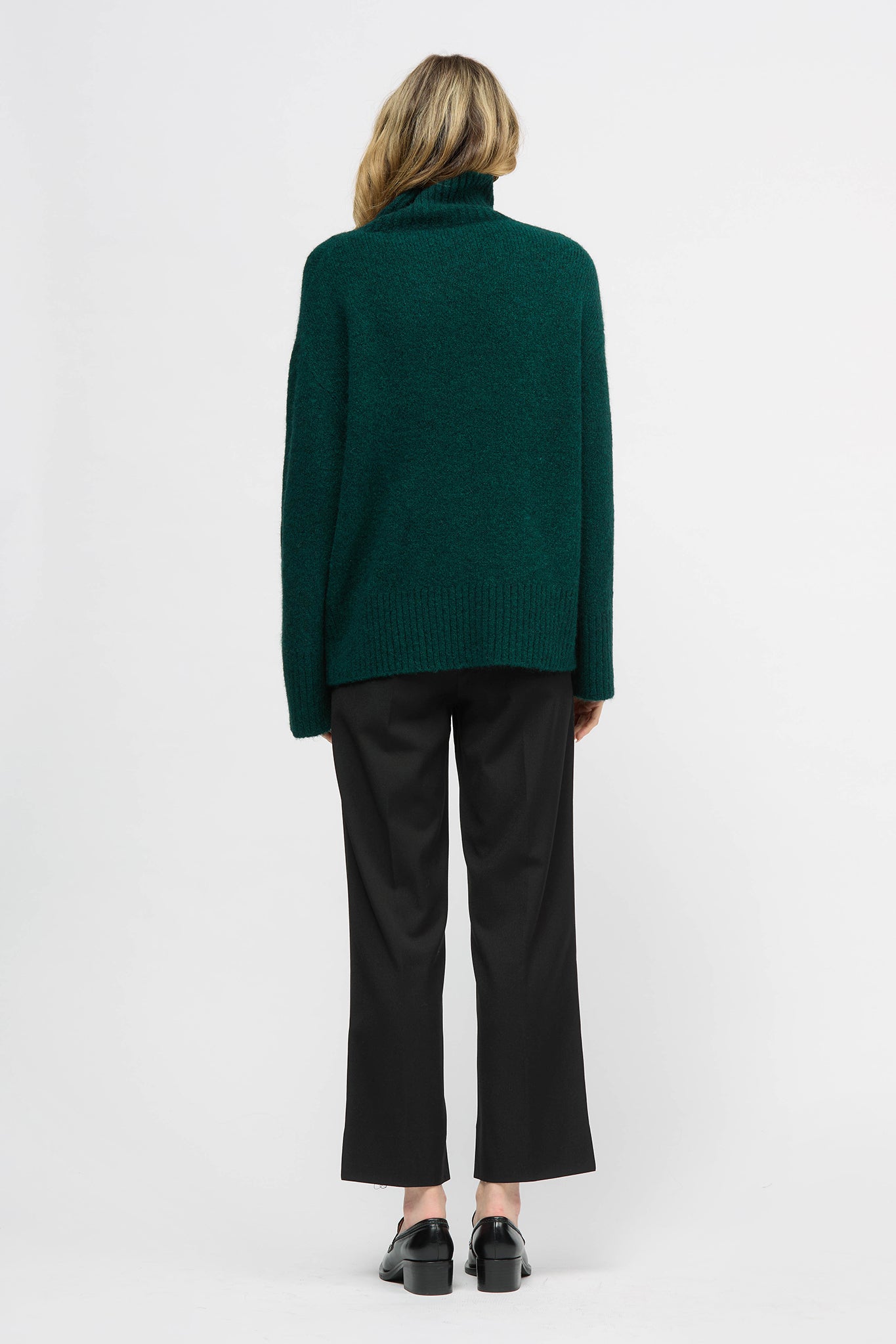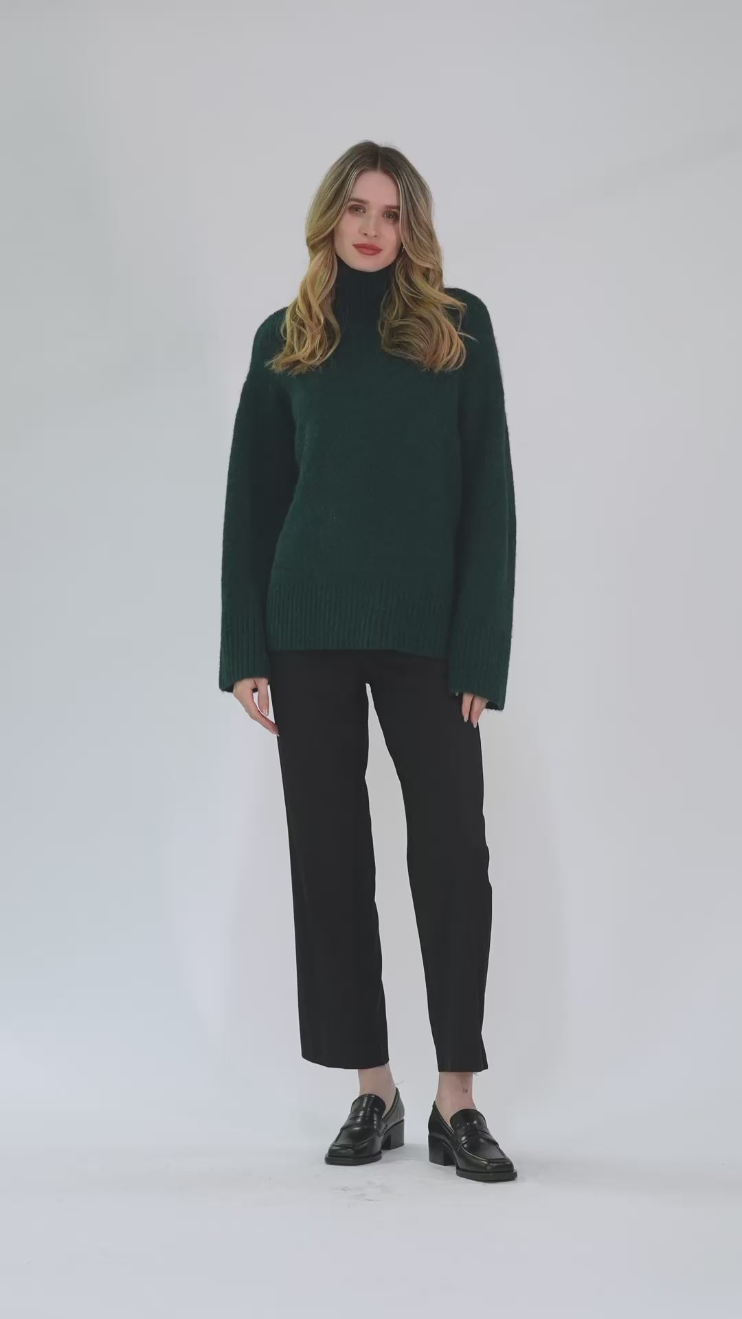The Grassy Jumper is an oversized style that includes exaggerated length rib at the mock neck neckline, cuffs, and hem and wide full-length sleeves. Made in a soft, cosy alpaca wool and acrylic blend.