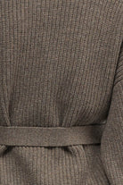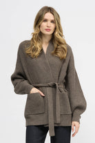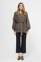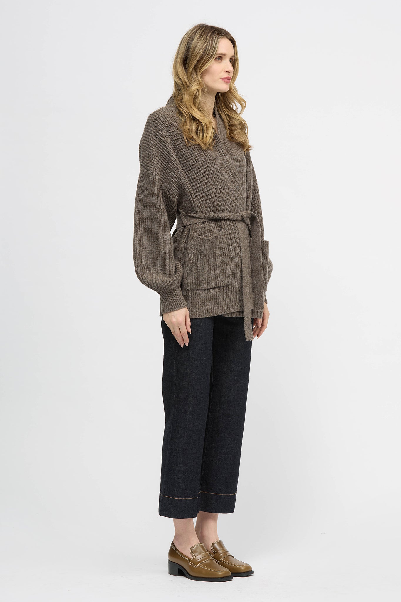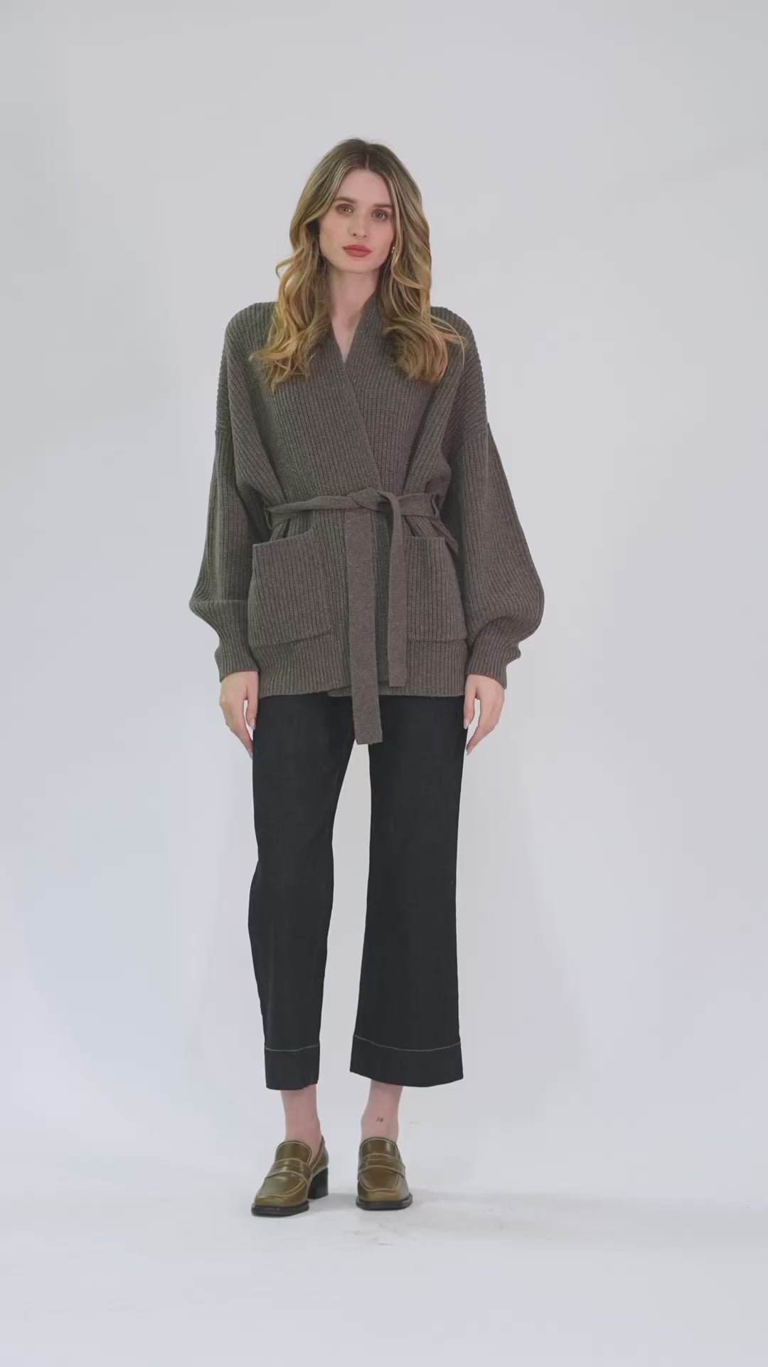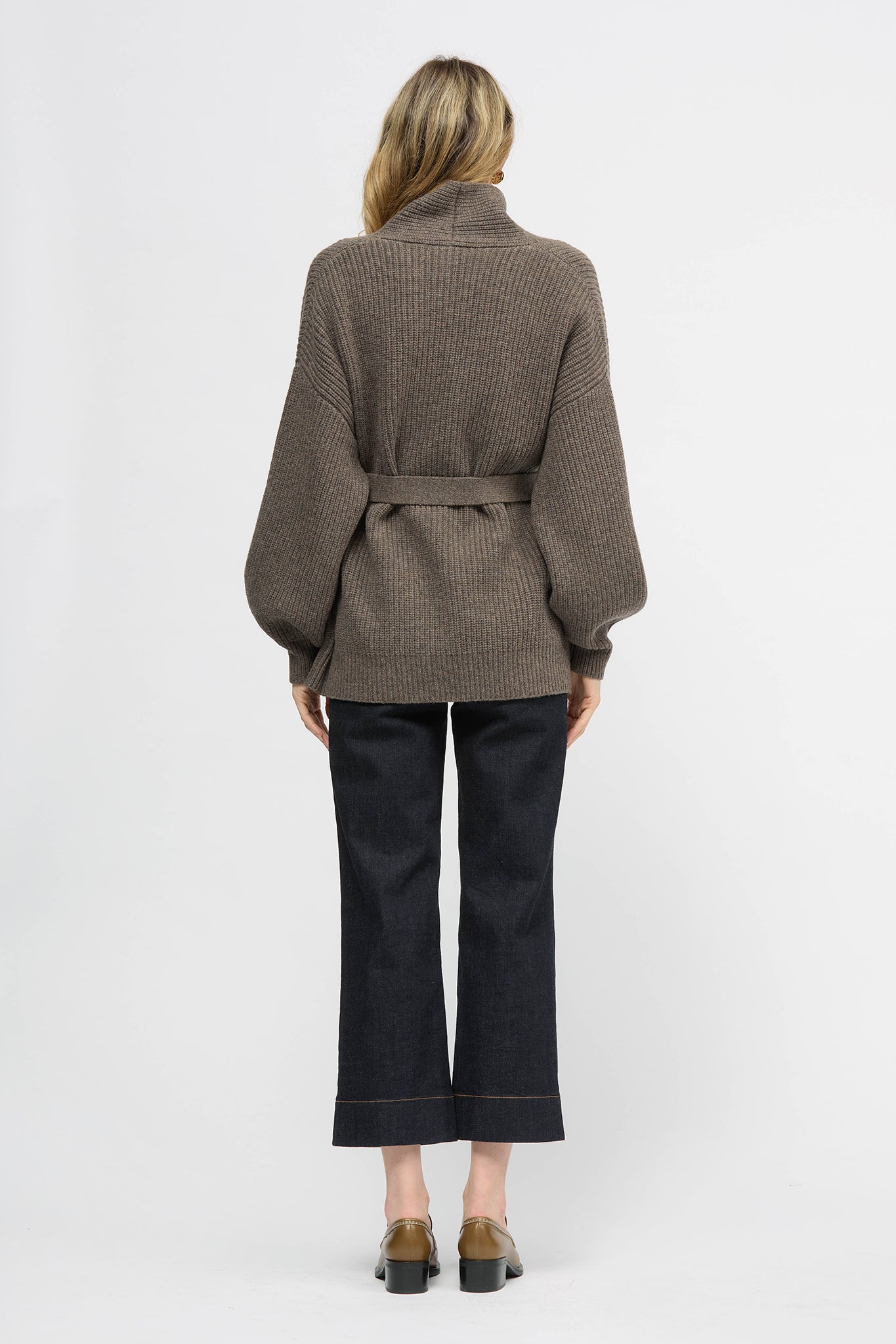 The Martha Cardigan is a mid-length shawl cardigan style with a dropped shoulder in an oversized fit. Features include balloon style sleeves, a knitted detachable waist tie and two front patch pockets. Made in a soft and warm merino wool.
