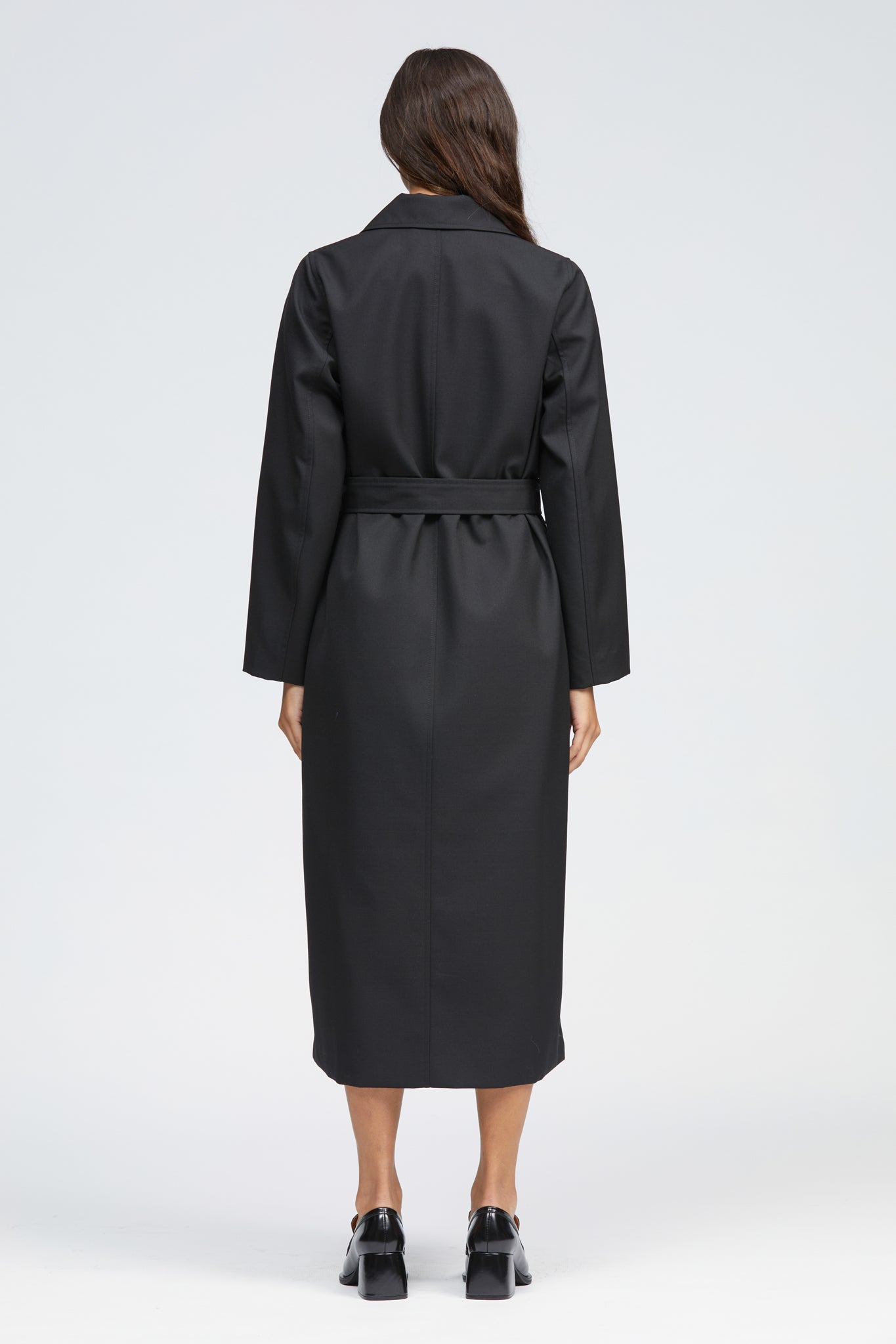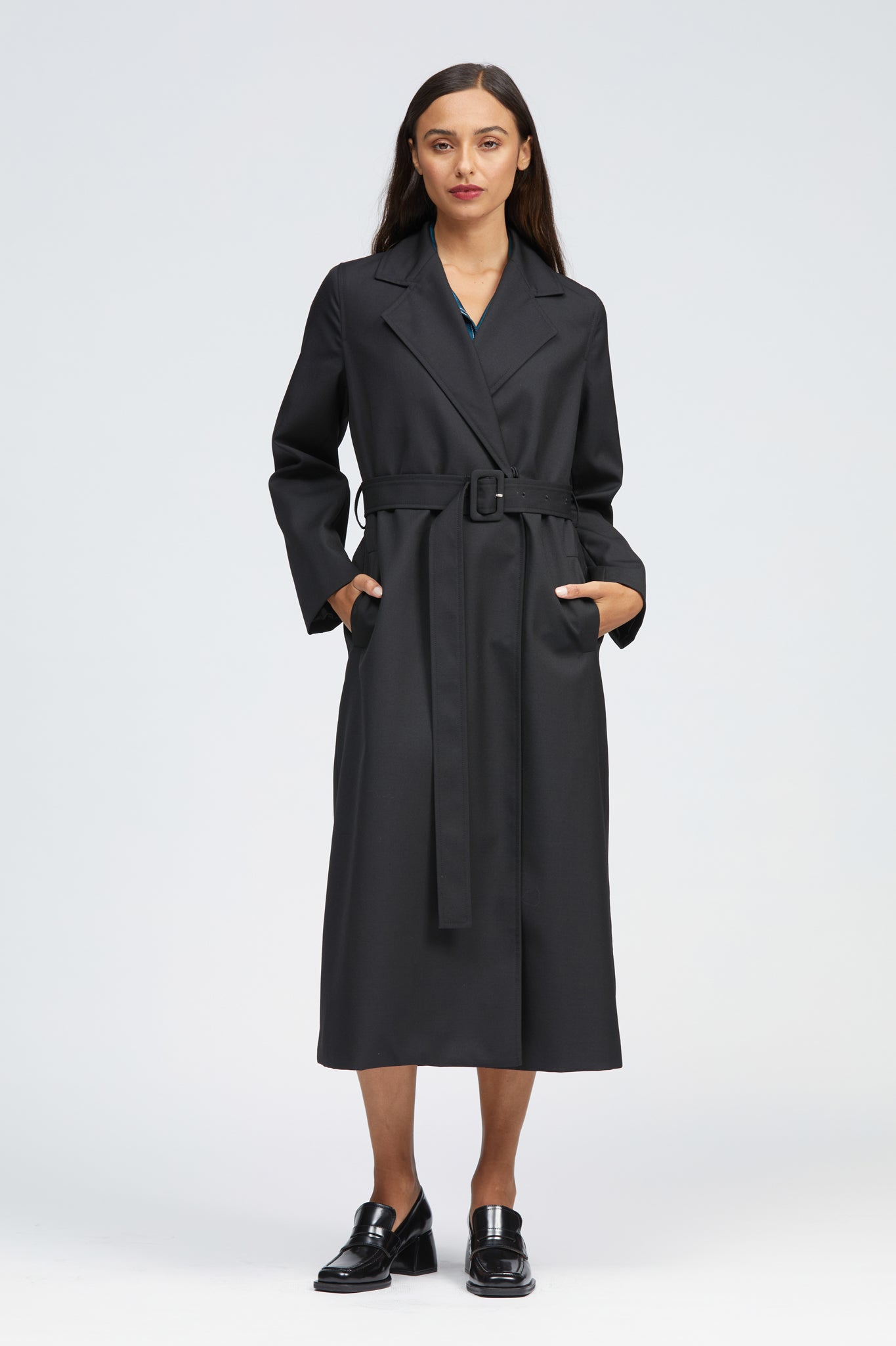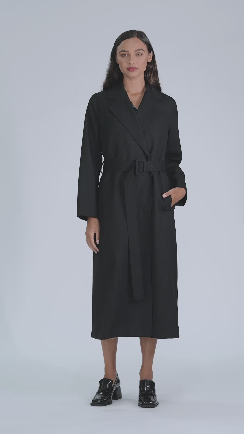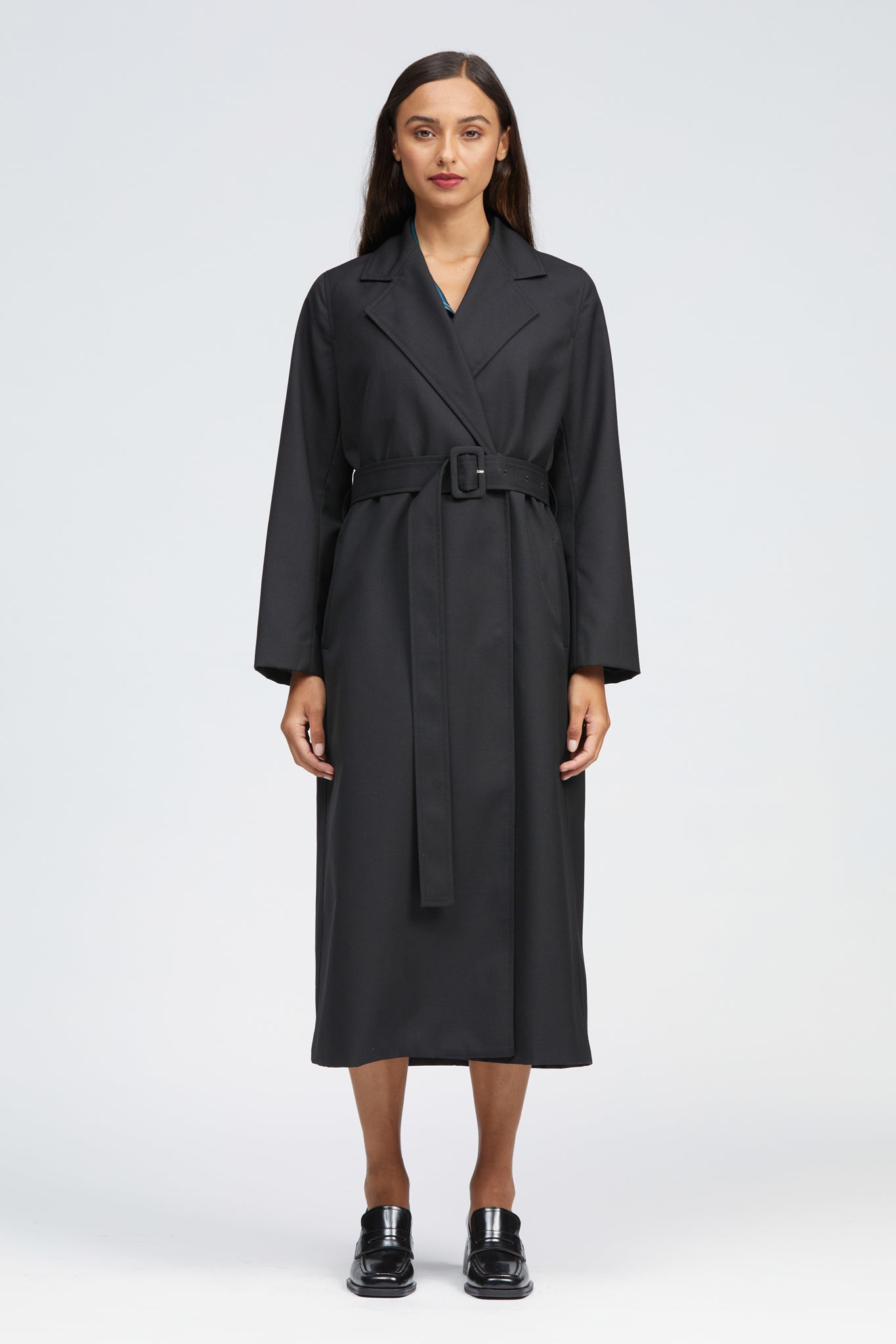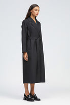 The Obel Coat is a long length, relaxed fit style with an internal hidden snap button fastening. Features include a classic collar and lapel, internal breast pocket, two front vertical welt pockets and a hanger loop in the interior back neck. This style has a relaxed straight fit which can be brought in with a detachable belt and fastened with the self-covered buckle. Made with a soft, light-weight Wool blend outer and fully lined with a matching black satin.