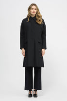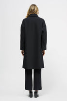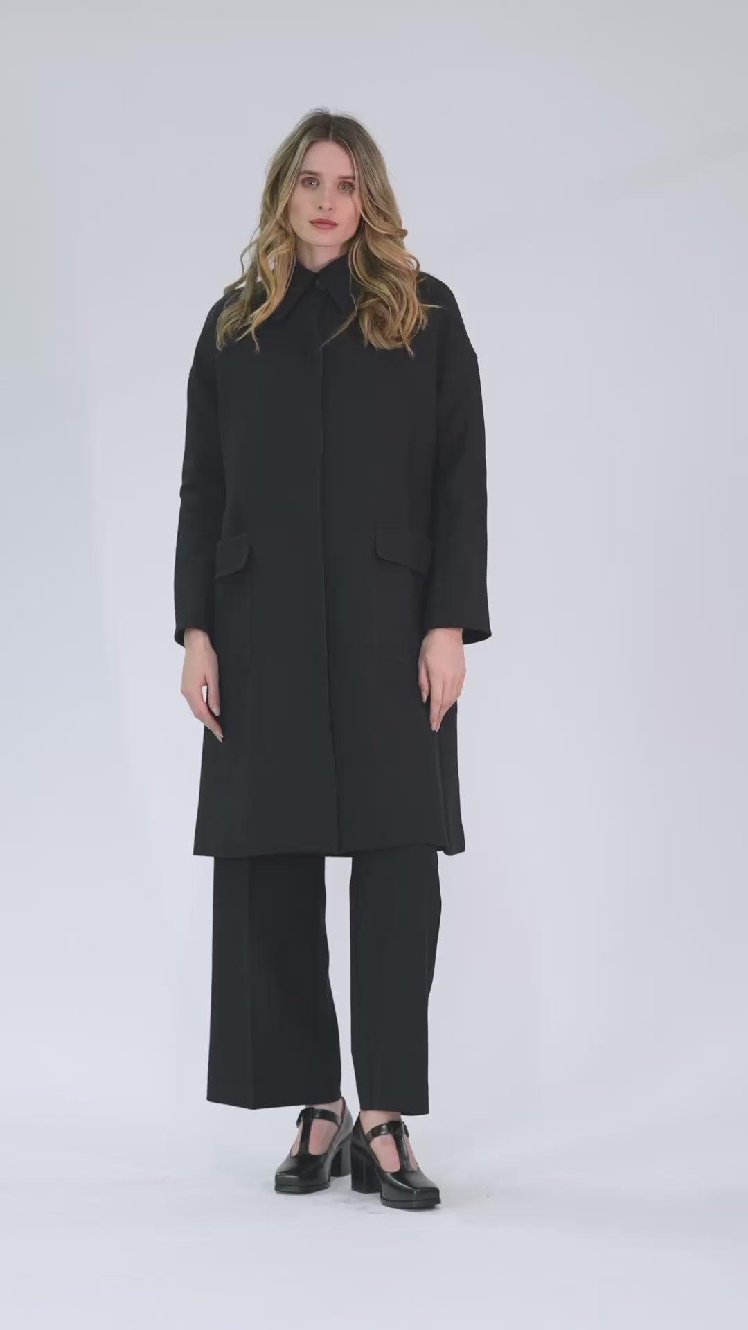 The Musgrave Coat is an oversized, mid-length style with a dropped shoulder and wide sleeves. Features include a classic collar and front patch pockets with a folded hem detail at the top opening edge. This is a single-breasted style made with hidden tonal marble buttons on a concealed front placket with a single button exposed on the collar. Made in a soft but structured polyester/ viscose blend and is fully lined in a matching navy satin. Wear with your existing wardrobe favourites or with the Aimsir Pant in Dark Navy as a matching set.