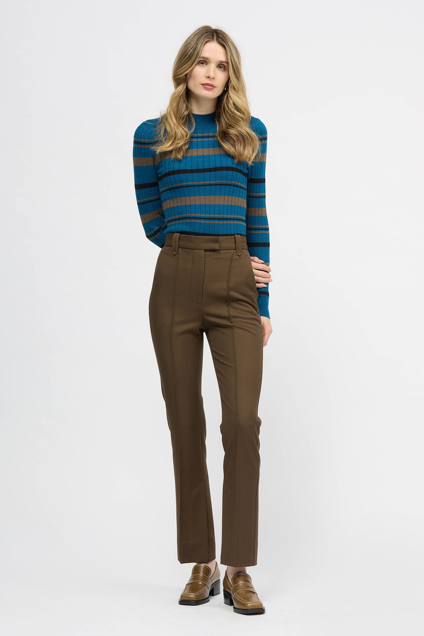 The Wiwat Trouser is a high-waisted, full-length, straight-leg style with a pressed line detail along the centre front and back legs. This style features inner leg vents, two slant pockets at the front, and two welt pockets at the back body. The front opening fly includes an interior zip, and fly extension which conceals the hook and eye tabs and an interior button. This style includes belt loops around the waistband and back darts for flattering shaping. Made with a Polyester/Viscose blend fabrication with slight stretch.