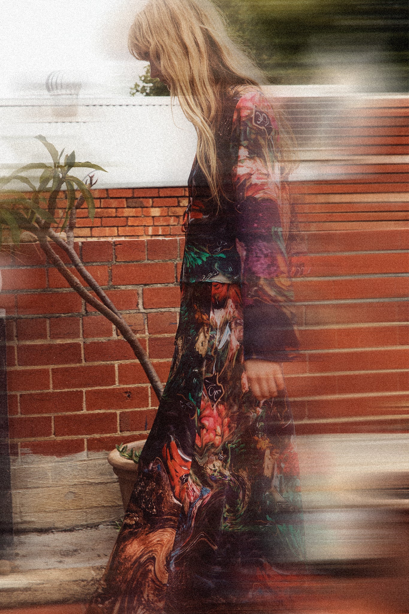 Colour stories capture Finland’s shift from autumnal melancholy to winter radiance. Hues of forest, earth, and ocean are anchored by tomato red, mushroom brown, and verdant green. Patterns in stripe and heritage check punctuate the collection, alongside a signature print inspired by a Helsinki floral market, twisting and warping into abstraction.