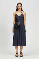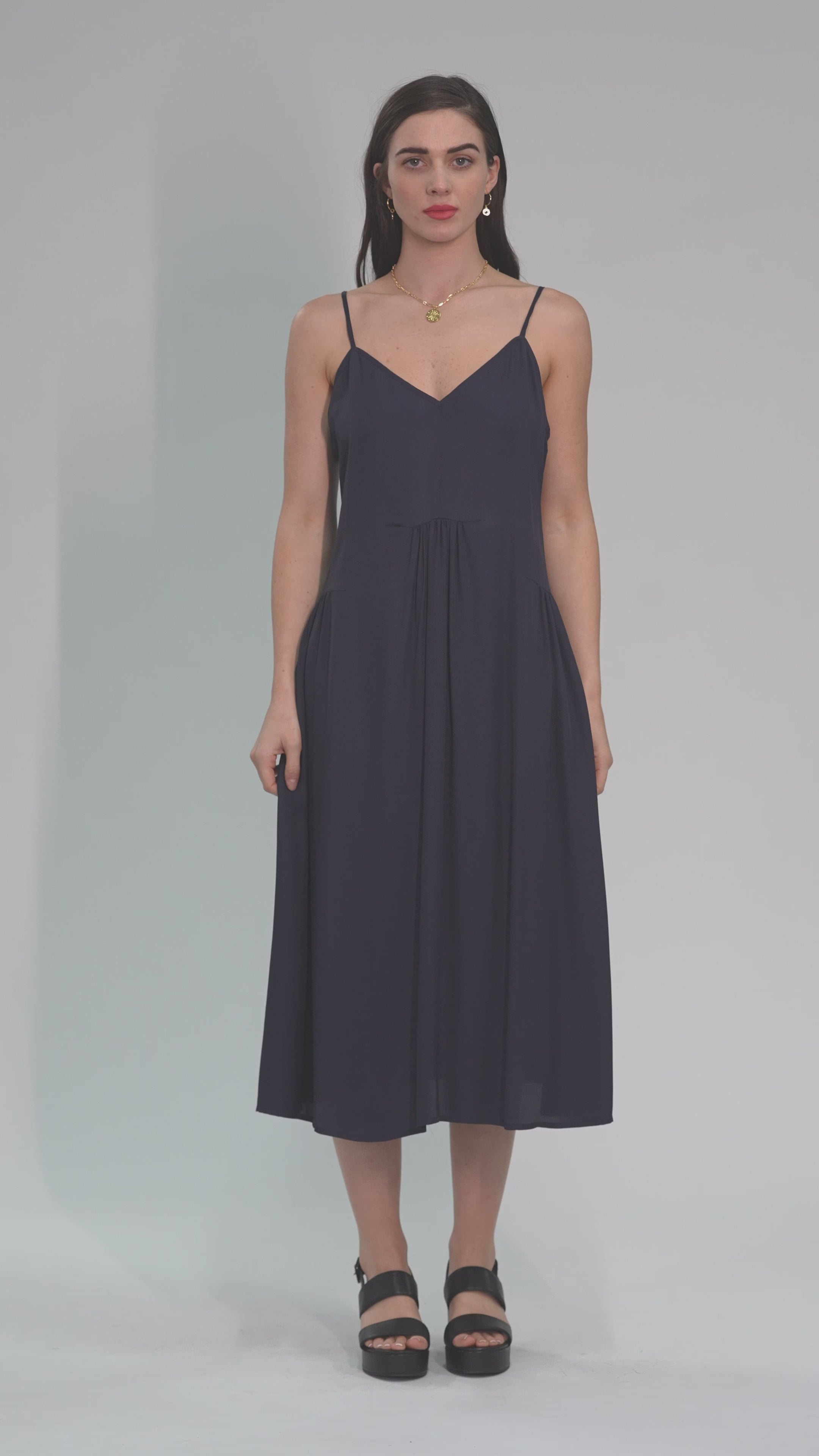 The Adeus Dress is a sleeveless, mid-length, relaxed fit style. This style offers gathered seams creating a soft volume at the waist and hip. Made in a flowy viscose fabrication