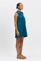 The Alcusas Mini Dress features a zip-front detail, collared neckline, and side pockets. Made from a soft Tencel and cotton blend.