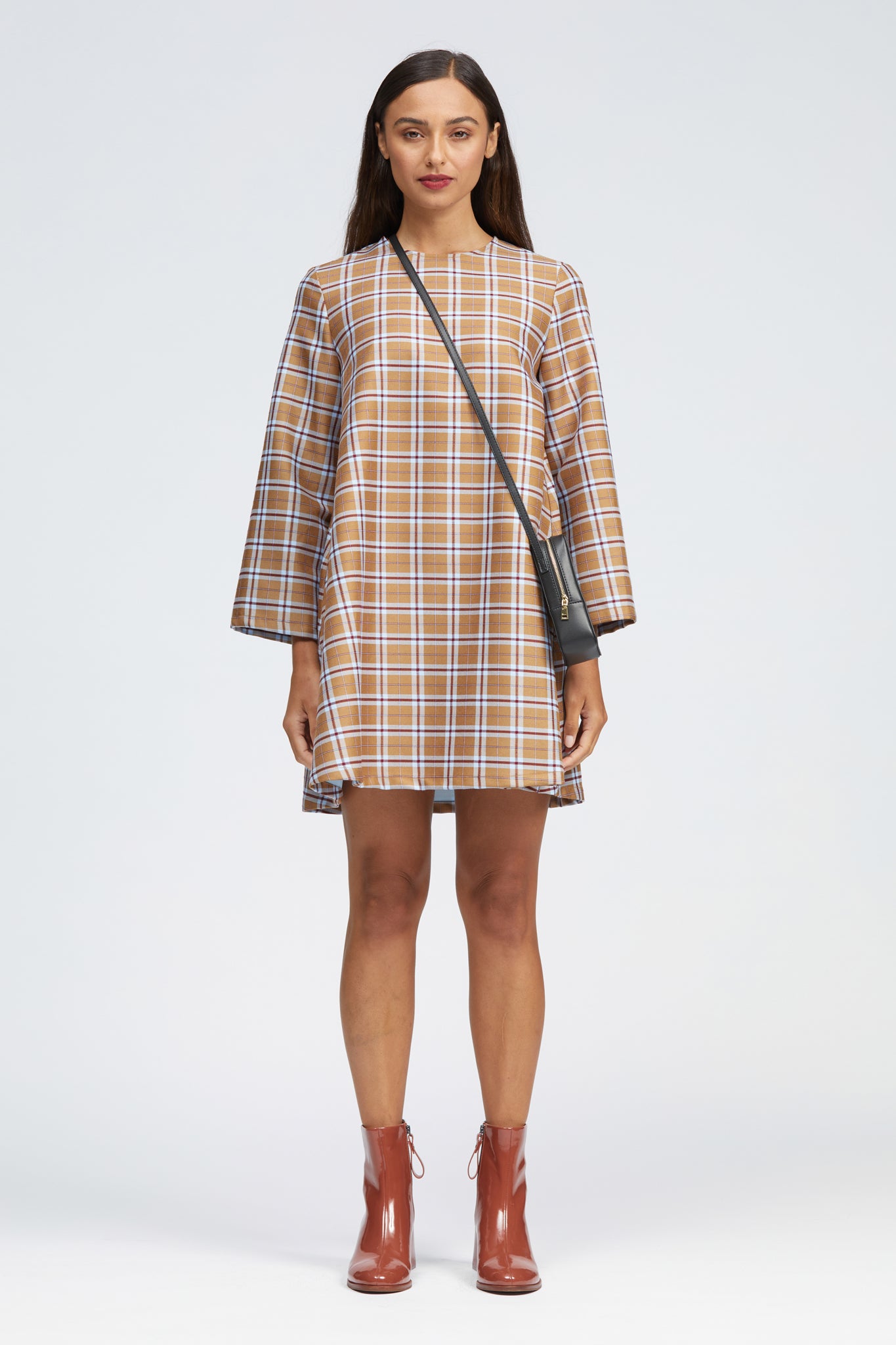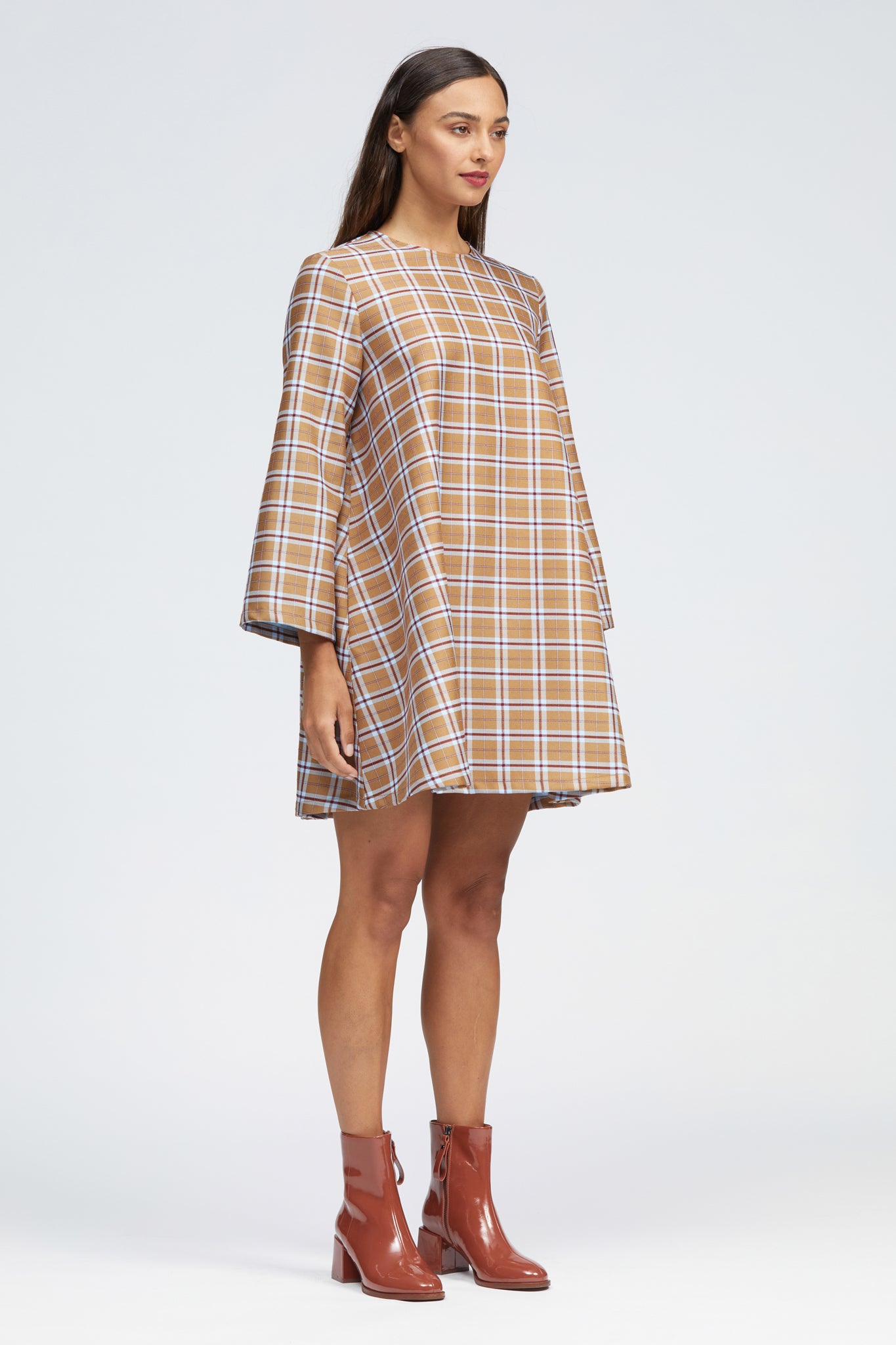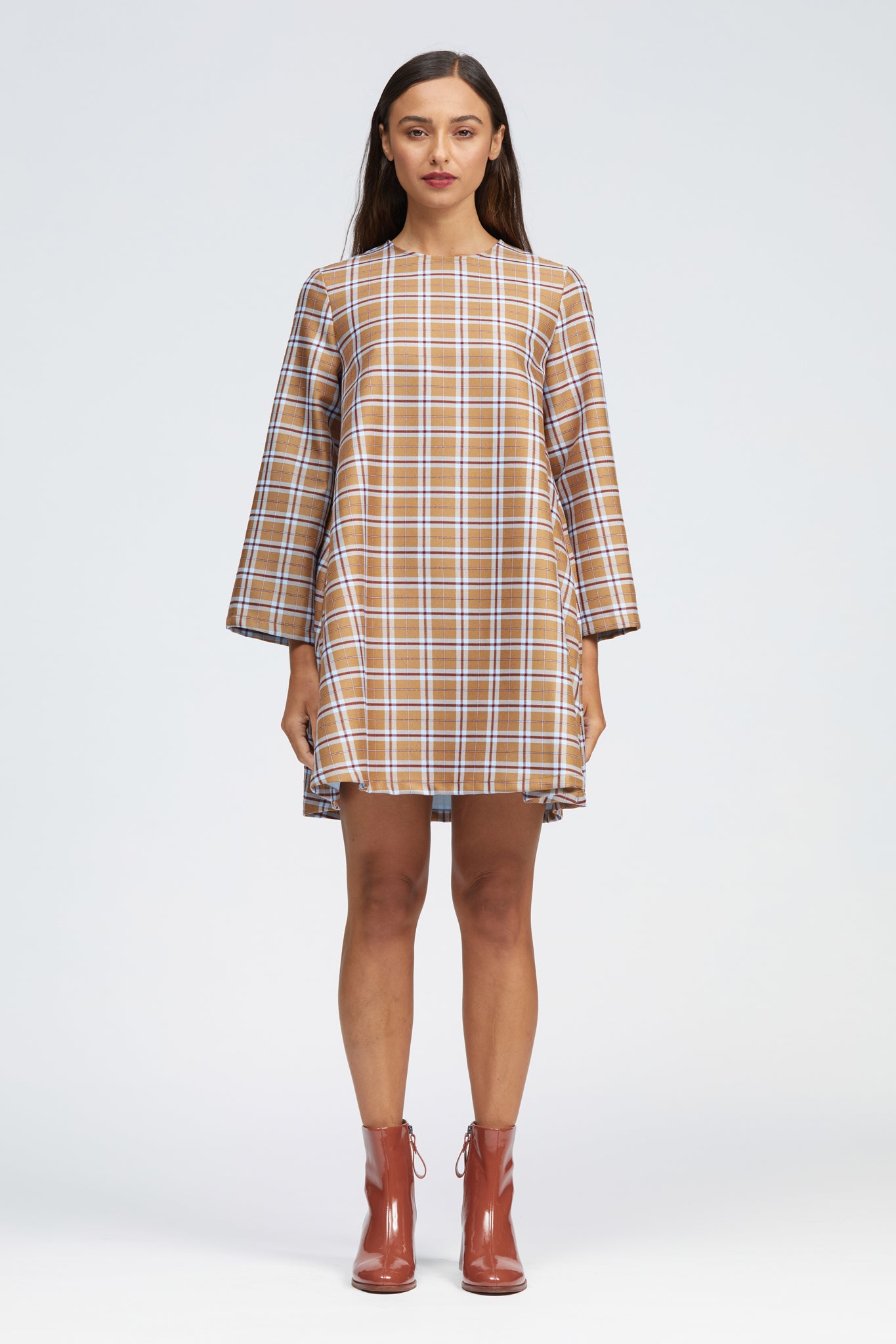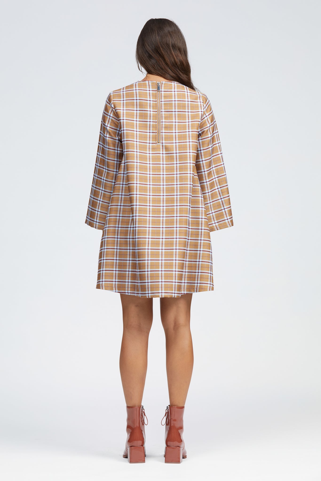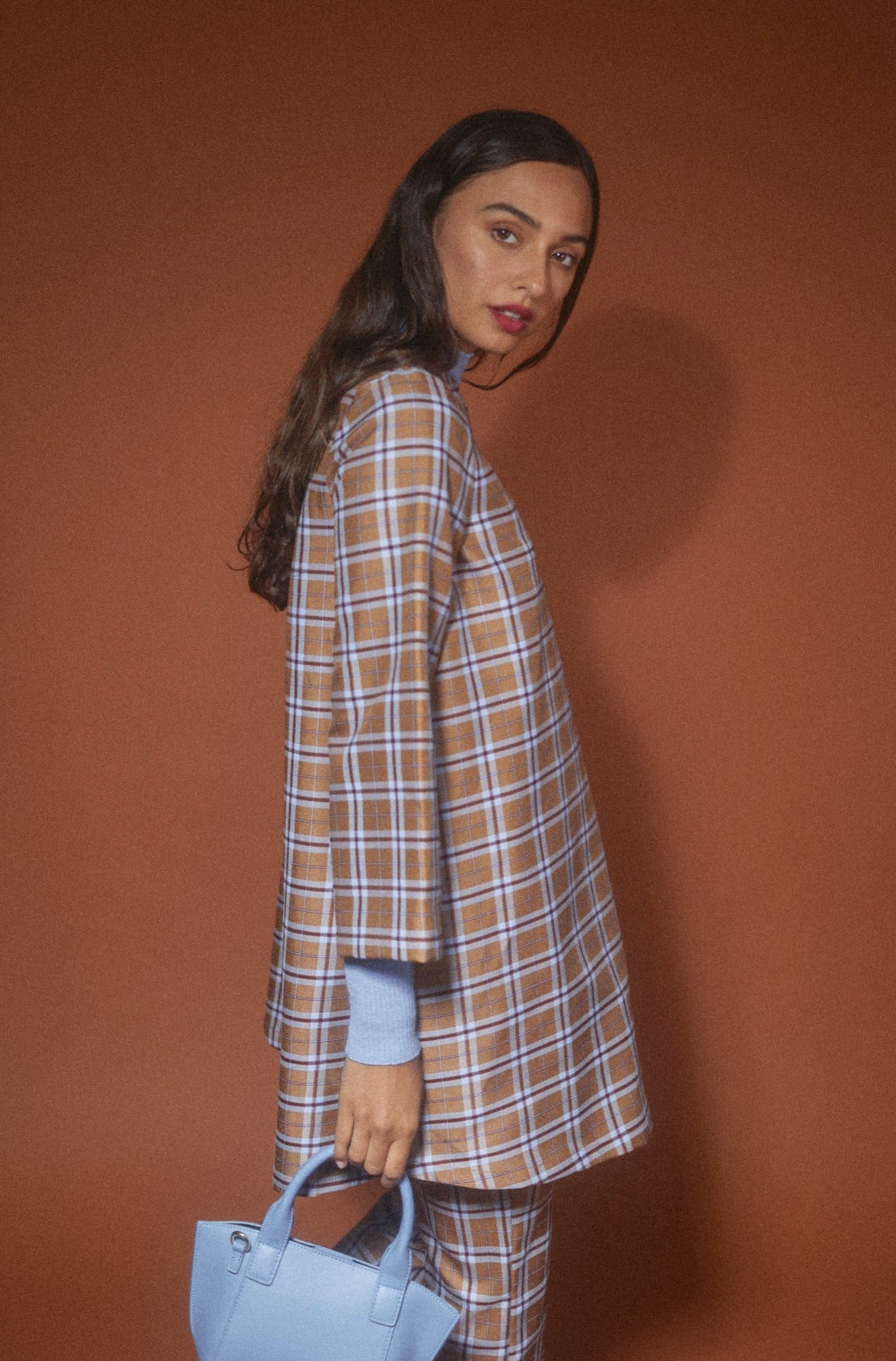 The Fala Dress is an a-line, mini-length shift dress with an oversized fit. This style offers bell sleeves and inseam pockets. Made with a structured Tencel blend check with interior blue fusing. This style can be paired back with your existing wardrobe favourites or with the Traf Pant in matching fabric as a set.