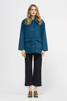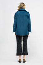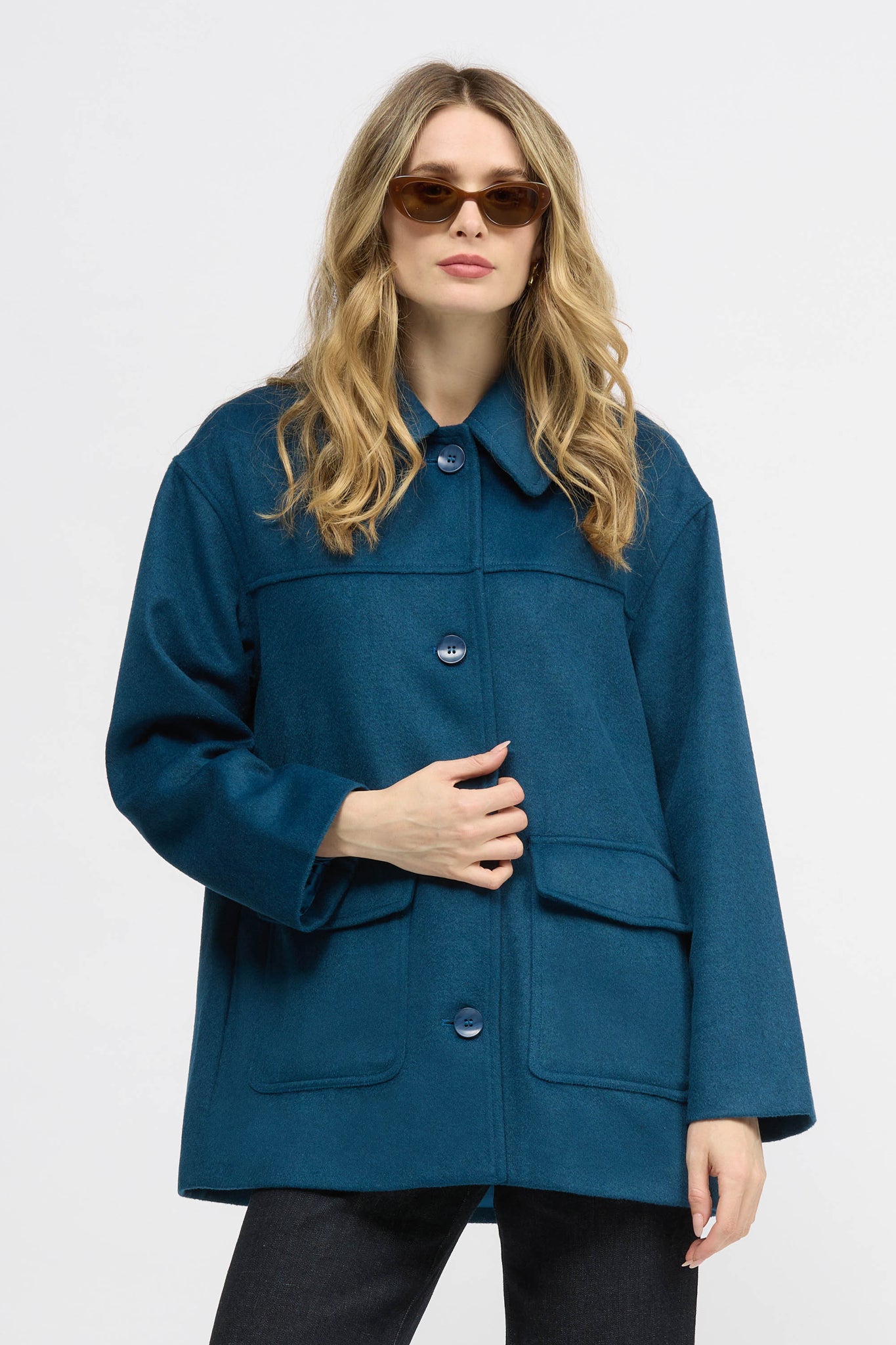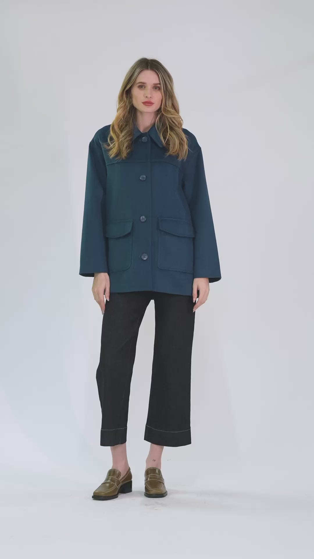 The Gyres Shirt Jacket is a mid-length, oversized style with a dropped shoulder and an exaggerated sized collar. This style offers two front pockets with flaps, exposed buttons along the front and is finished with a hanger loop in the interior back neck. Made with a warm and soft wool blend and is fully lined with a silky satin.
