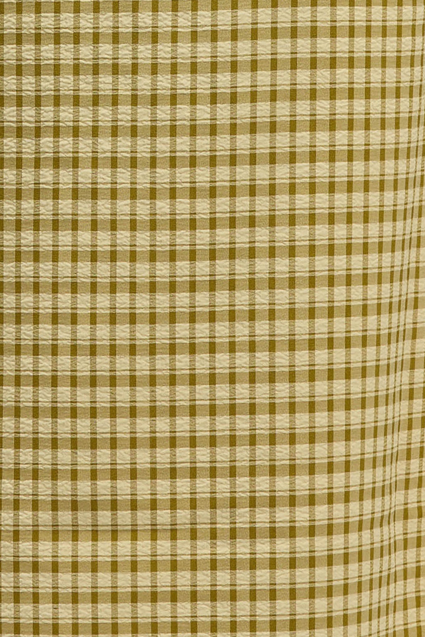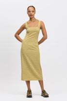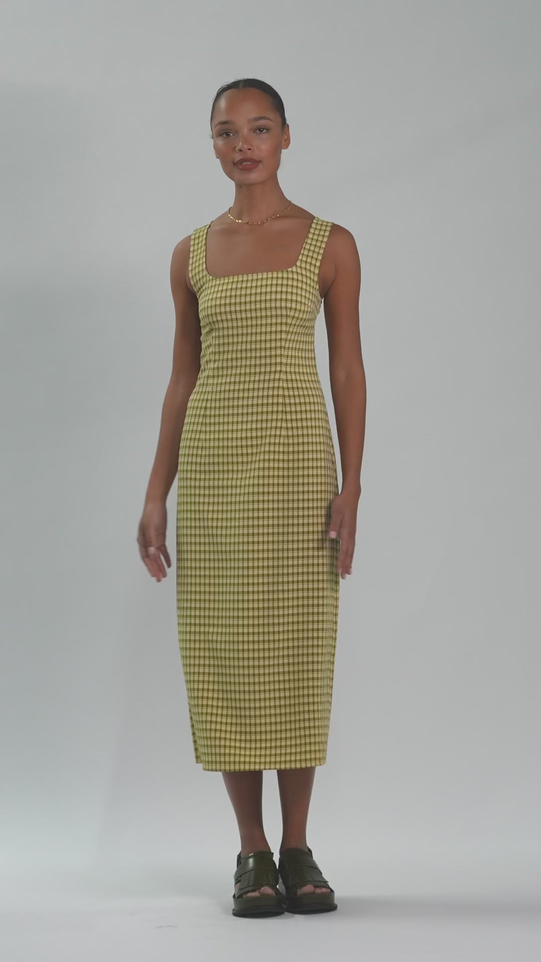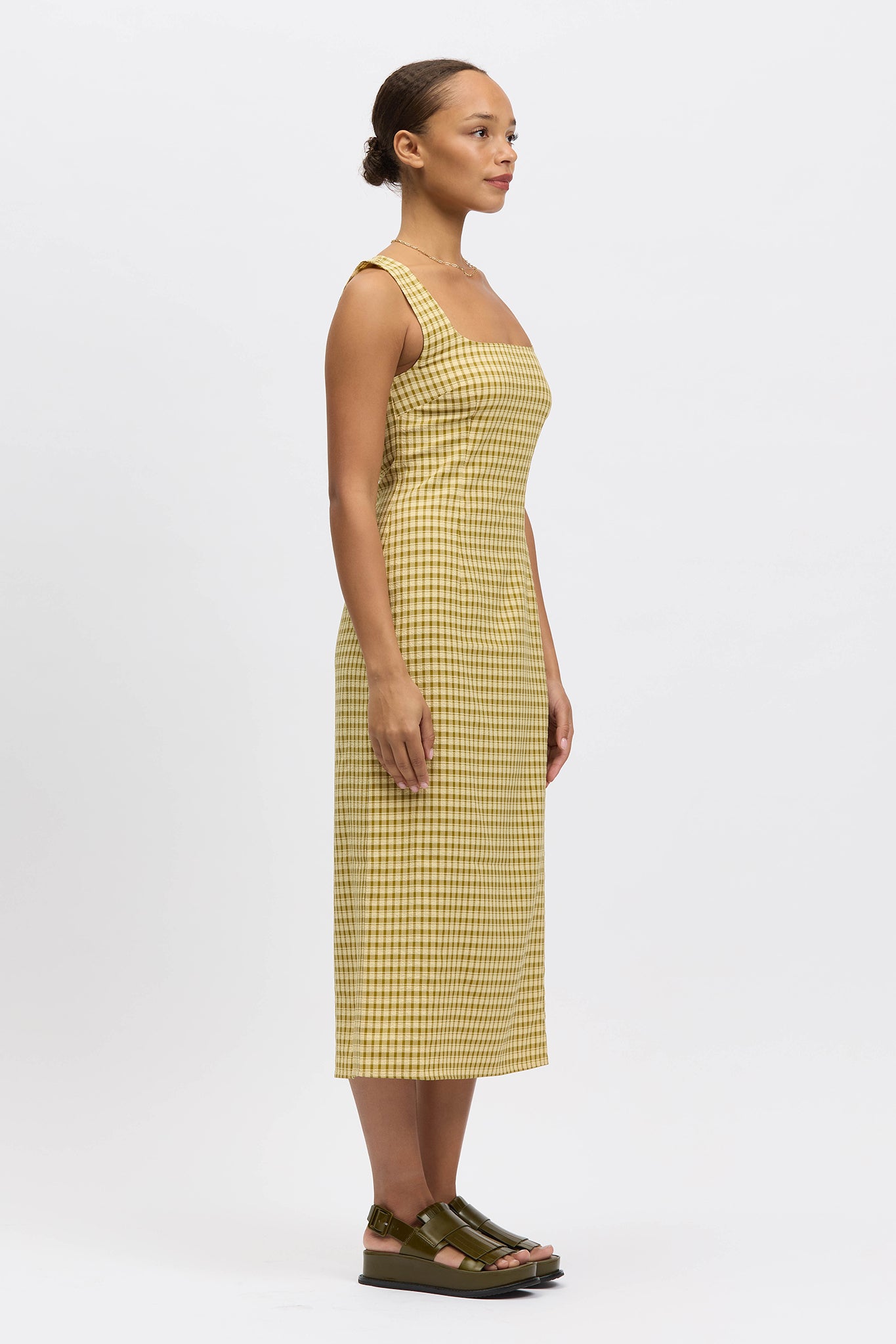 The Hae Dress is a midi length style with a softly rounded square neckline, made from textured crinkle fabric.