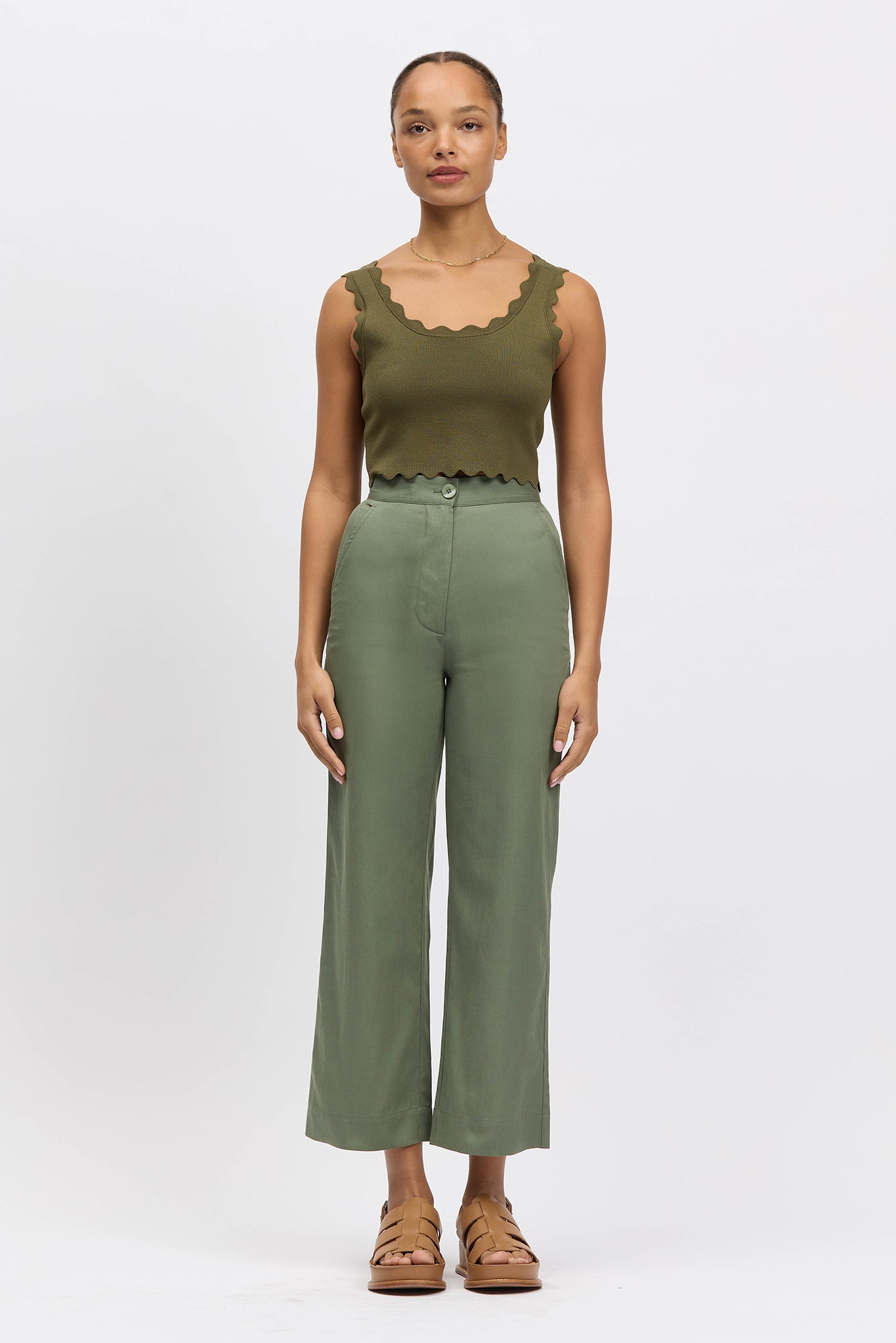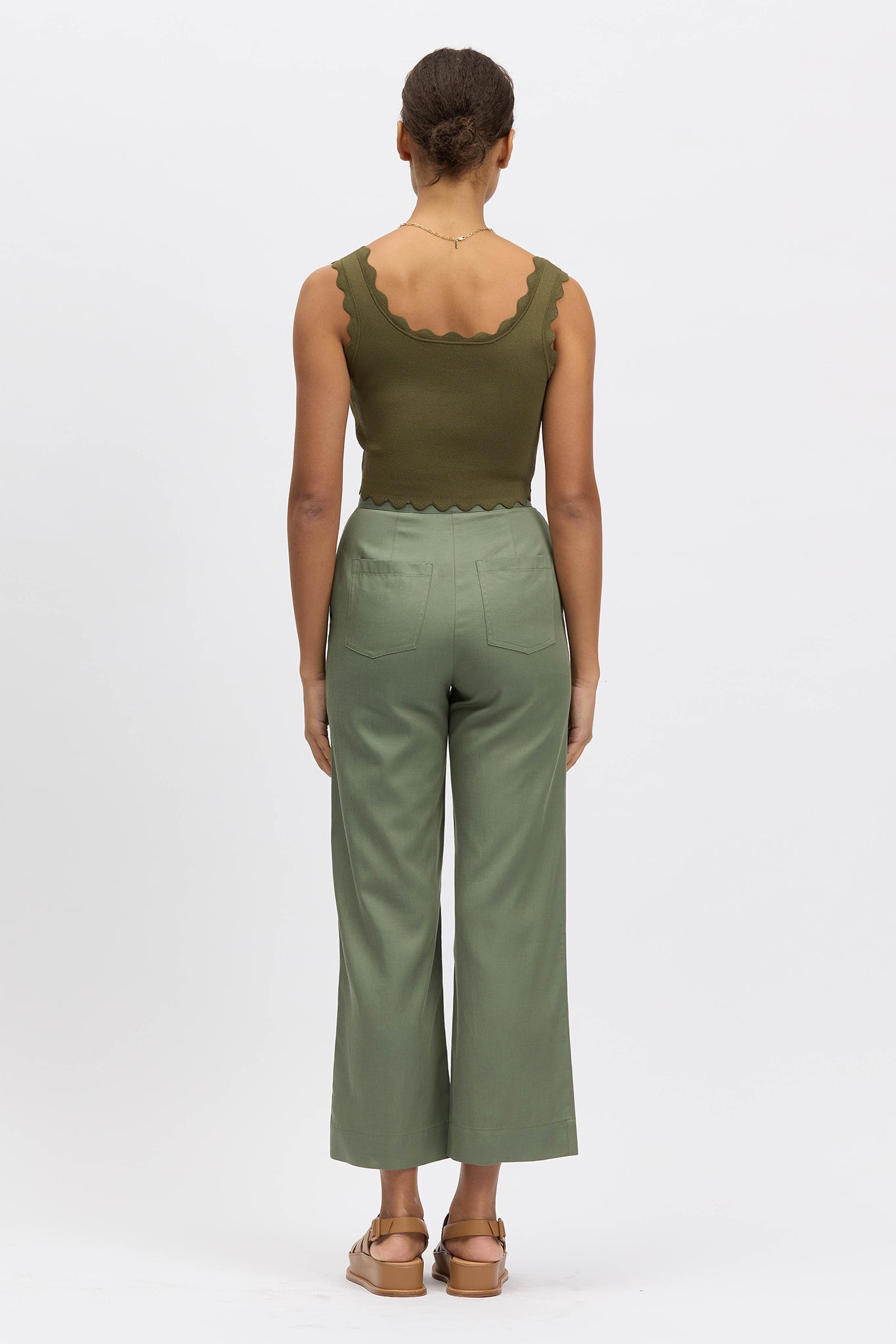 The Jaco Pant features a cropped leg and back pockets, made from a soft Tencel-cotton blend.