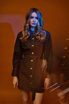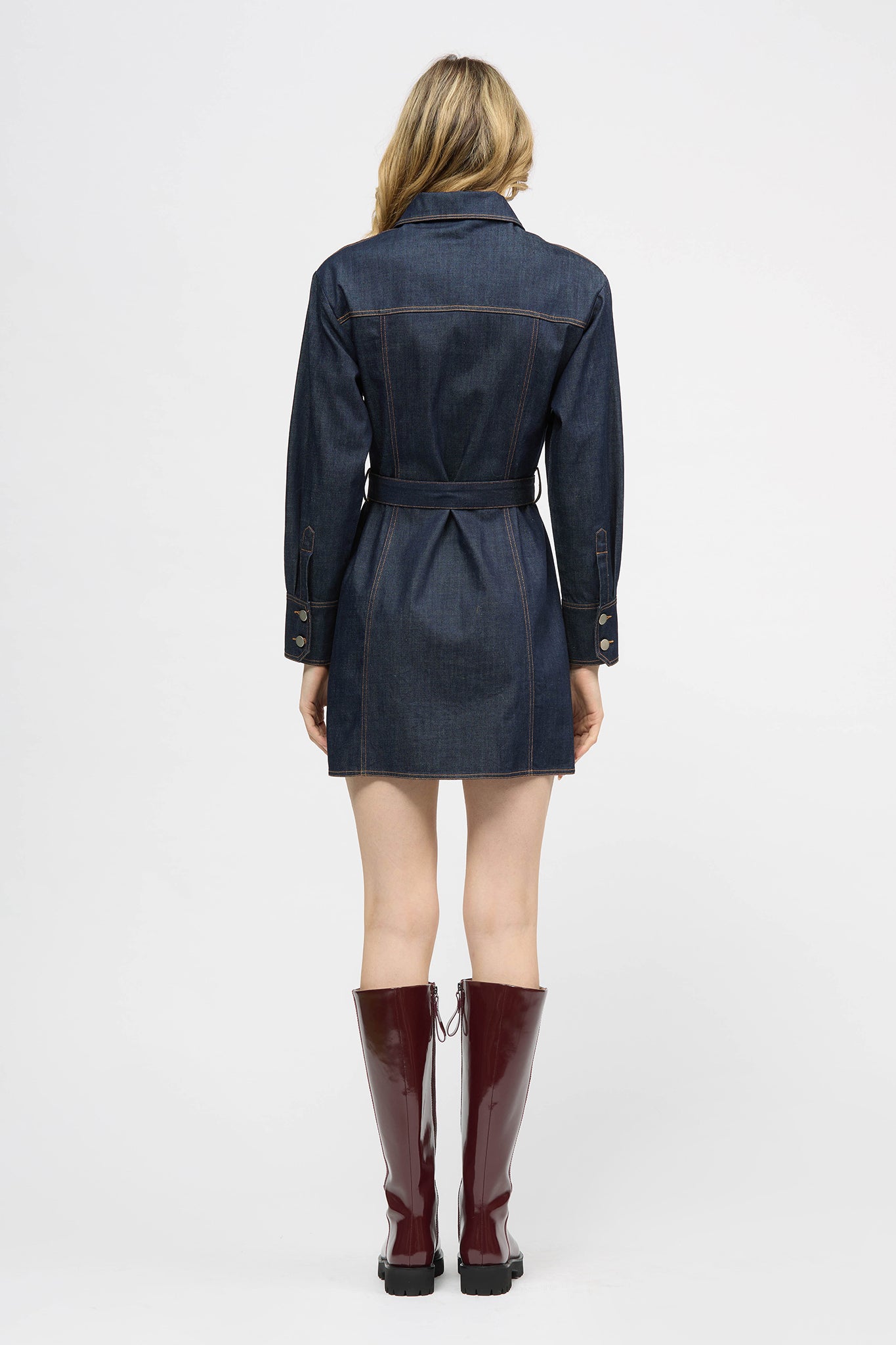 The Kingston Dress is a mini-length, long sleeve, button-up denim dress. Details include front chest pockets, button-up sleeve cuffs and a self-fabric tie that secures at belt loops at waist. This style is a tailored fit through the upper with an A-line silhouette through the skirt. Made in a rigid denim, in raw indigo wash.