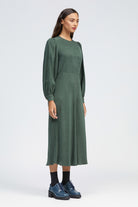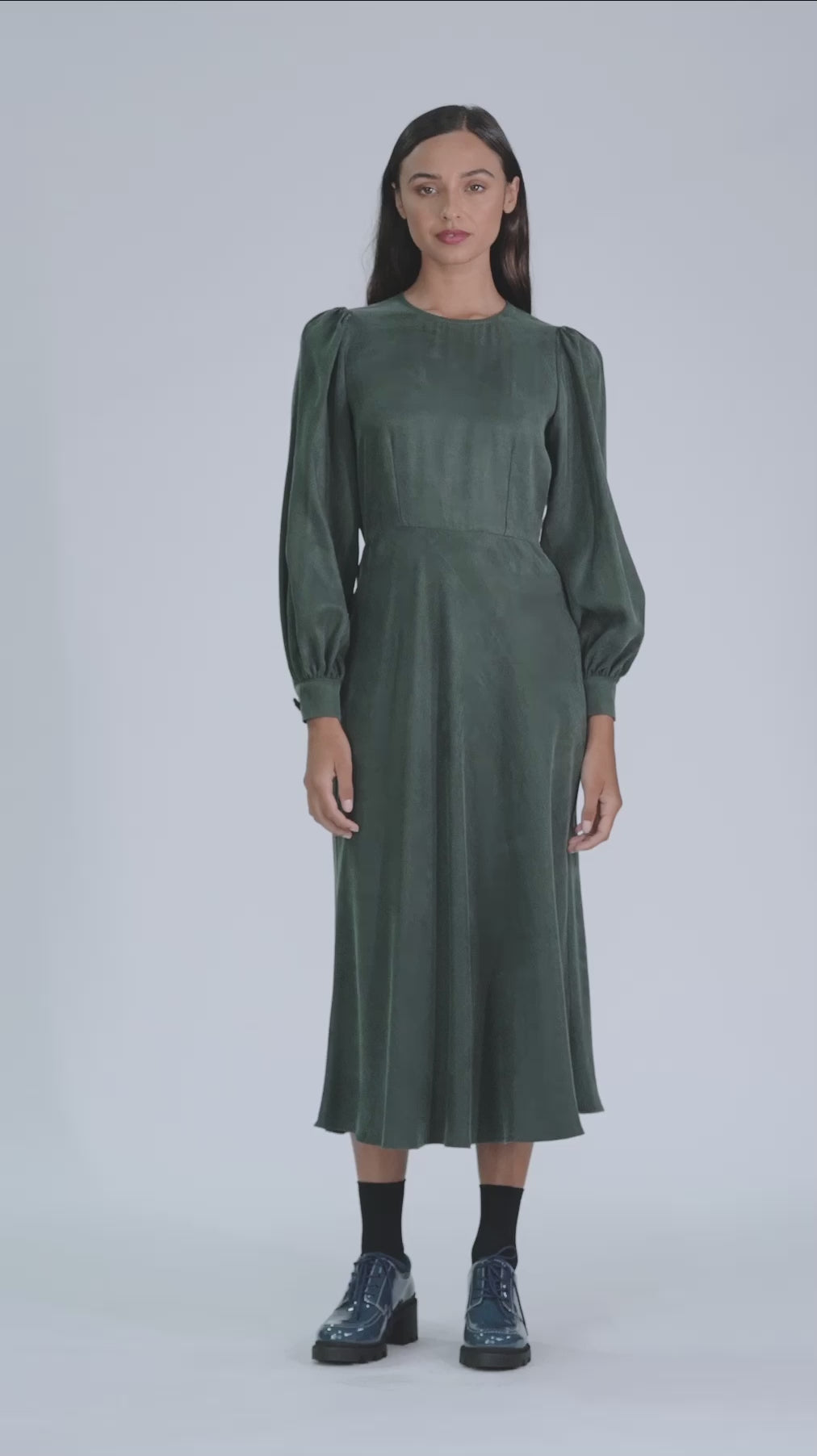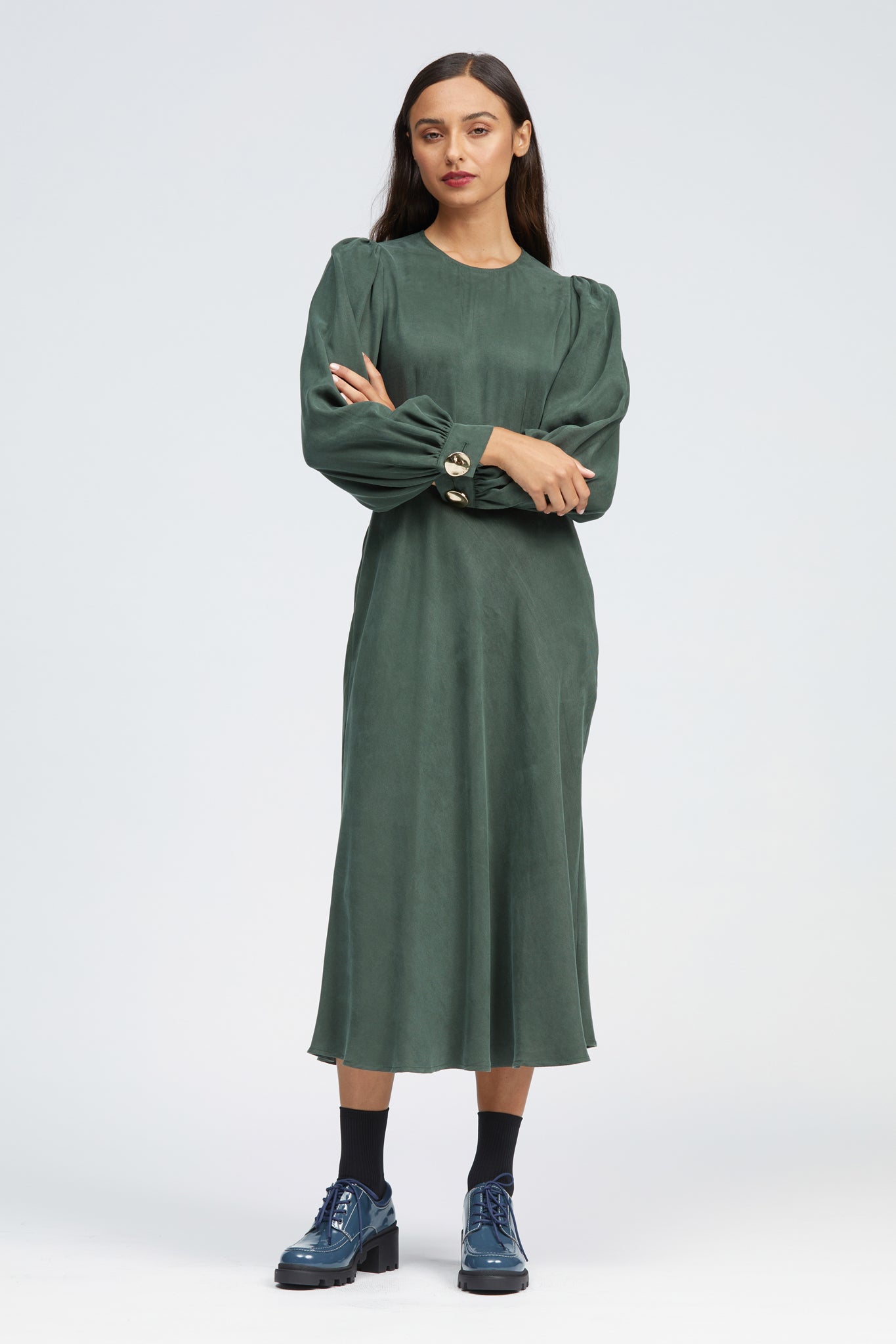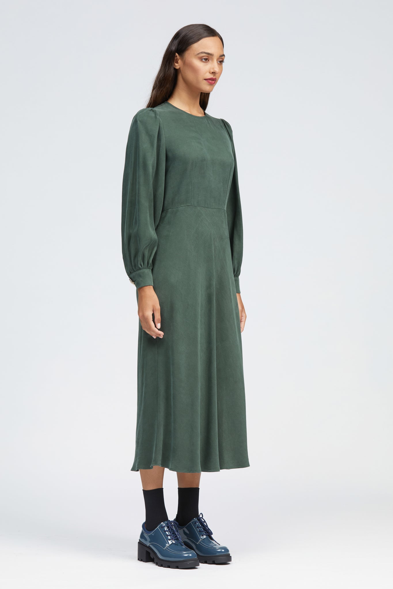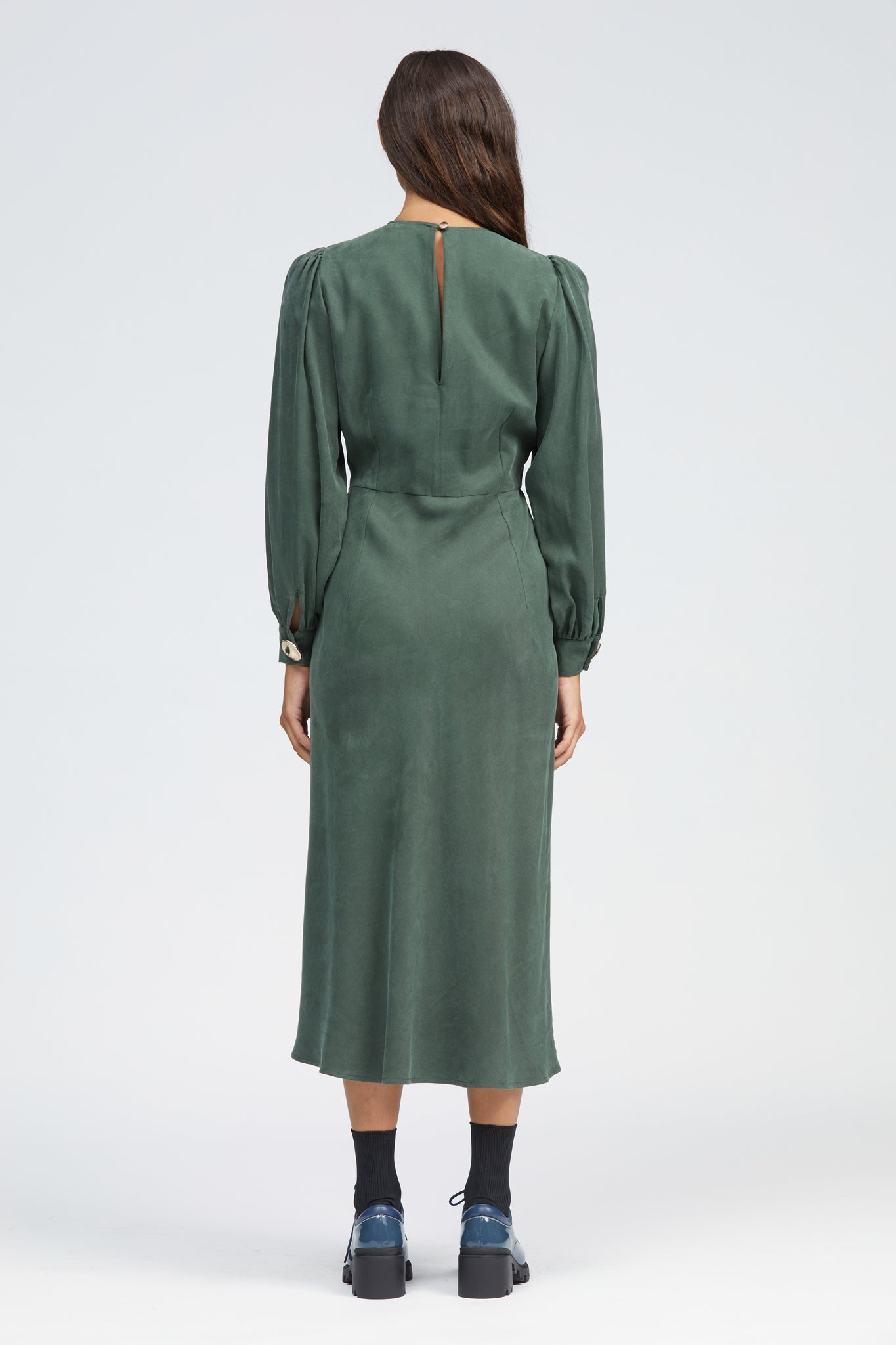 The Peregrine Dress is a mid-length style with a fitted upper body and waist that falls into a bias-cut flowy skirt. Features include balloon sleeves and organic-shaped gold button fastening on each cuff, a round neckline and a centre back slit which leads to a small gold button fastening at the back neck. Made in a soft, brushed Tencel twill weave fabrication.