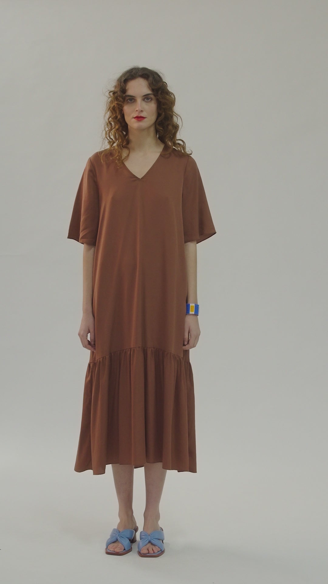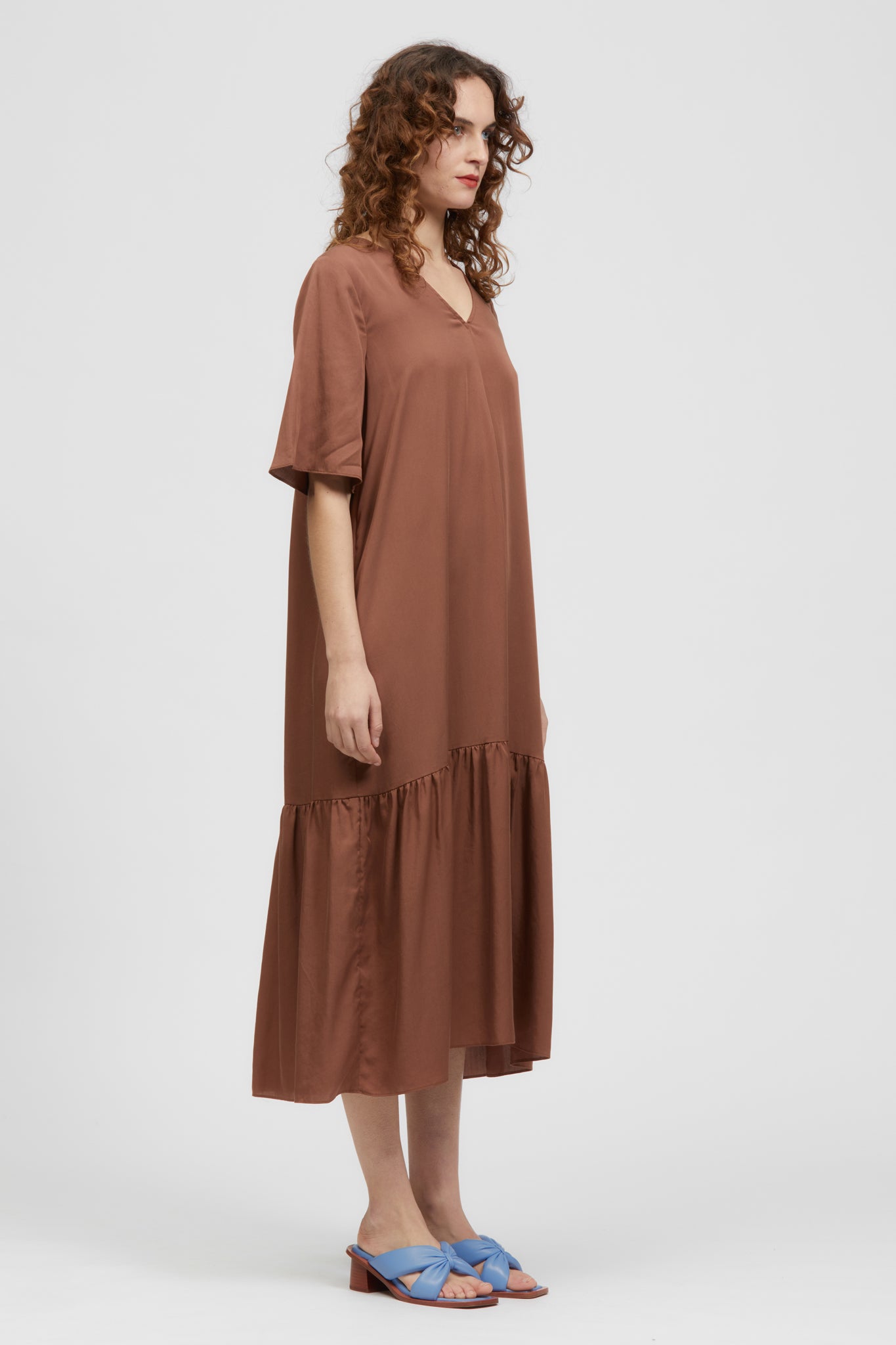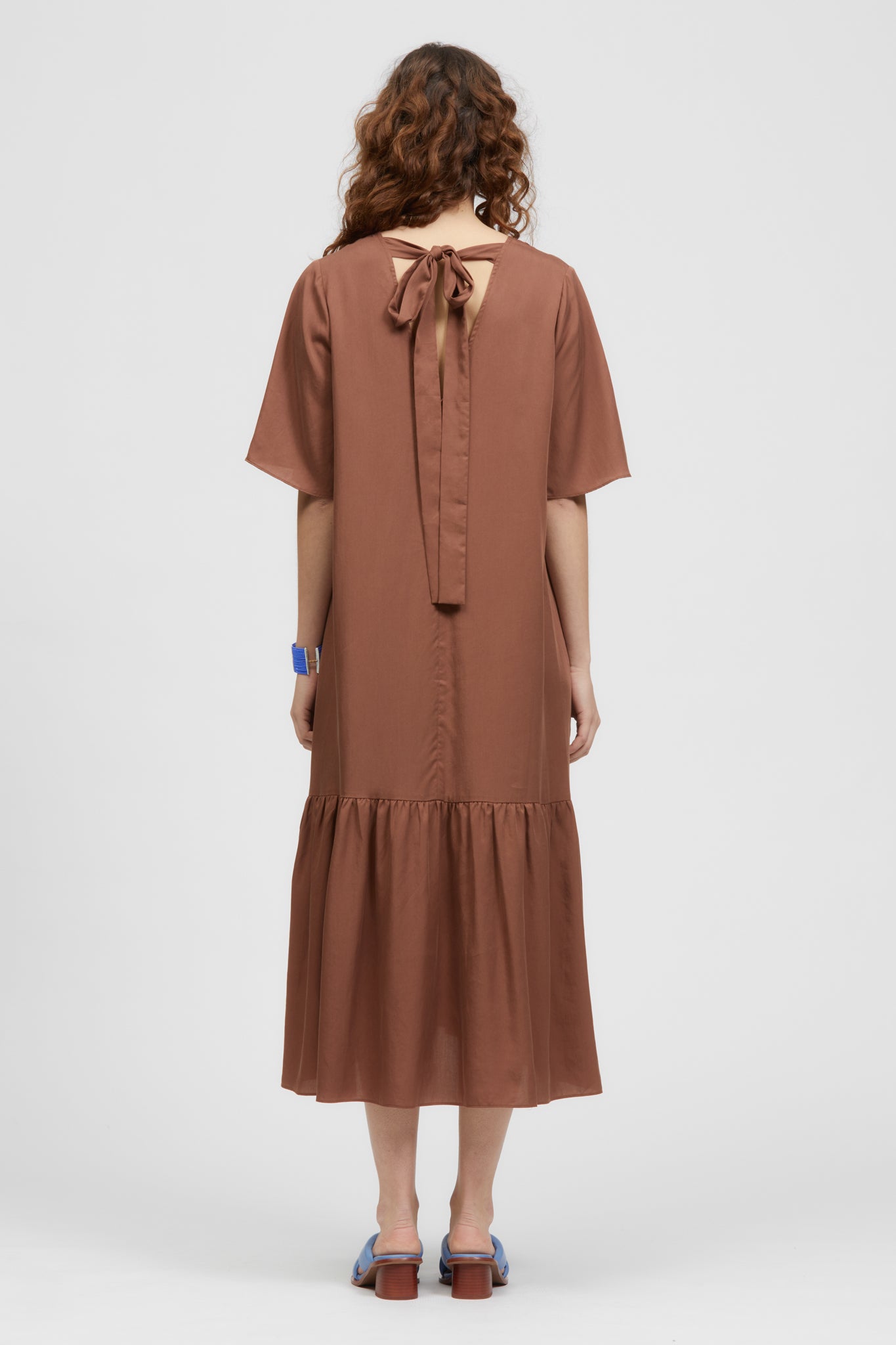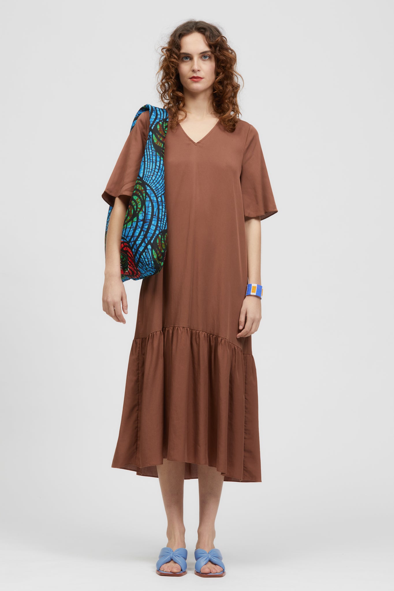 The Rafiki Maxi Dress is a v-neckline, relaxed fit maxi with a lower frill detailing on the skirt adding volume towards the hem. The style has a v-neckline front and lower v-neckline at the back with two long ties for fastening. This style is made with a soft Tencel blend.