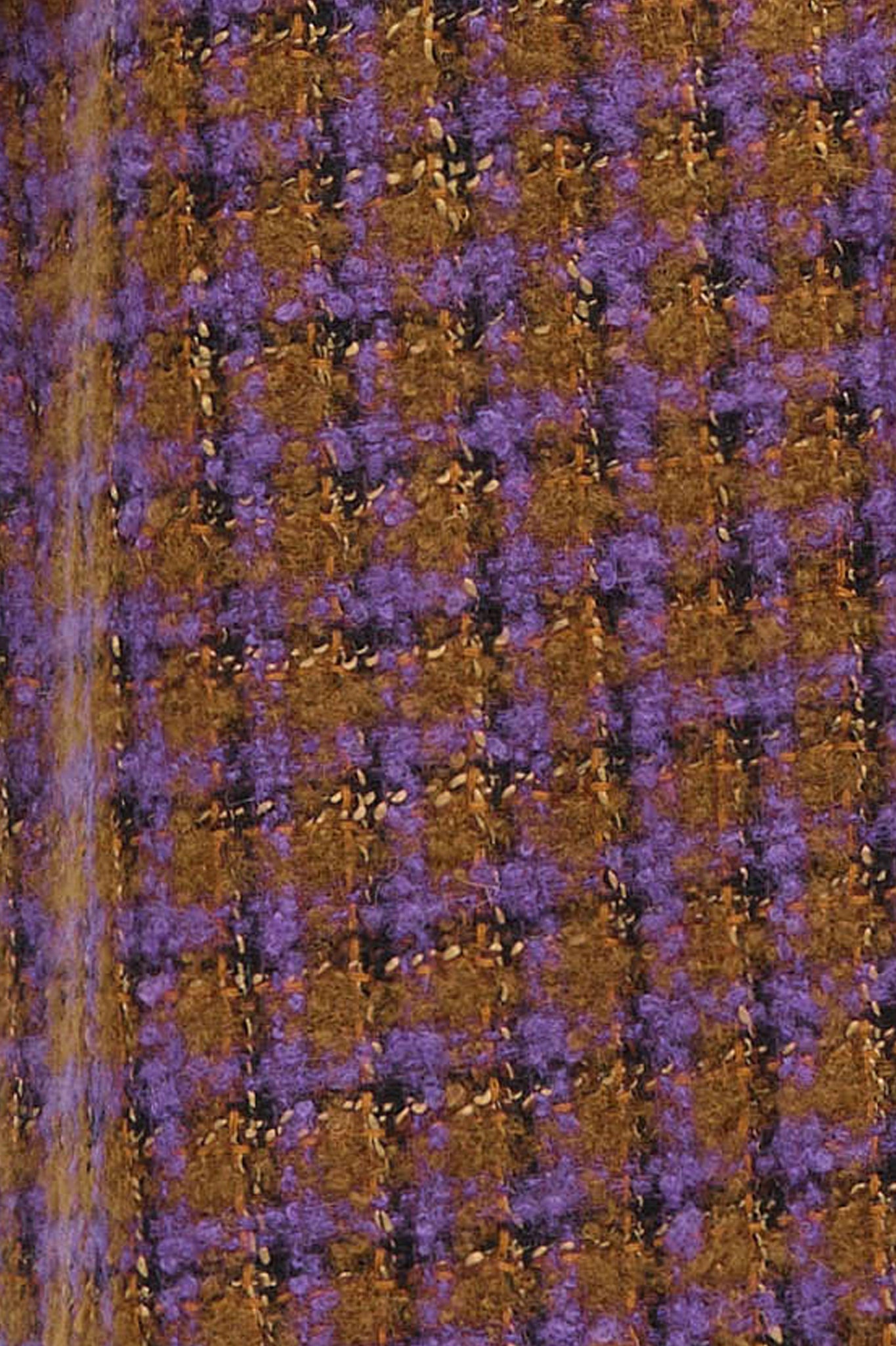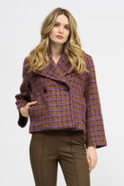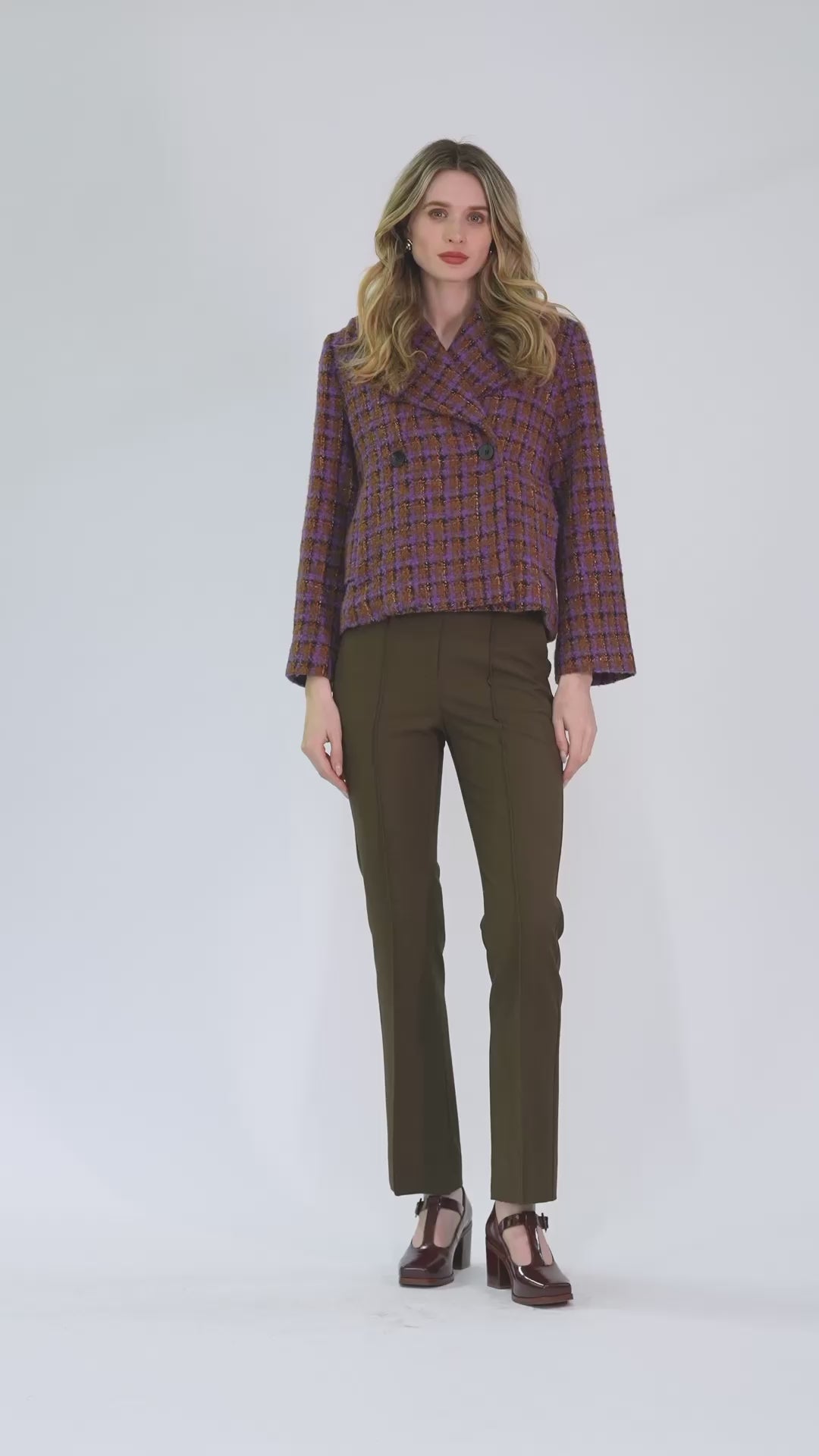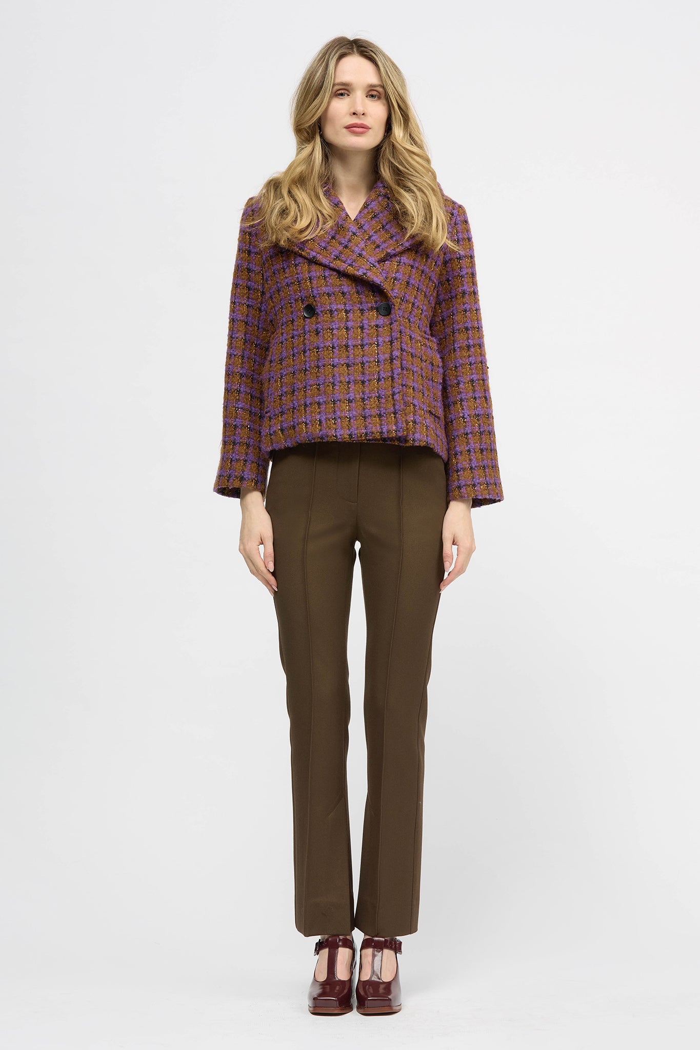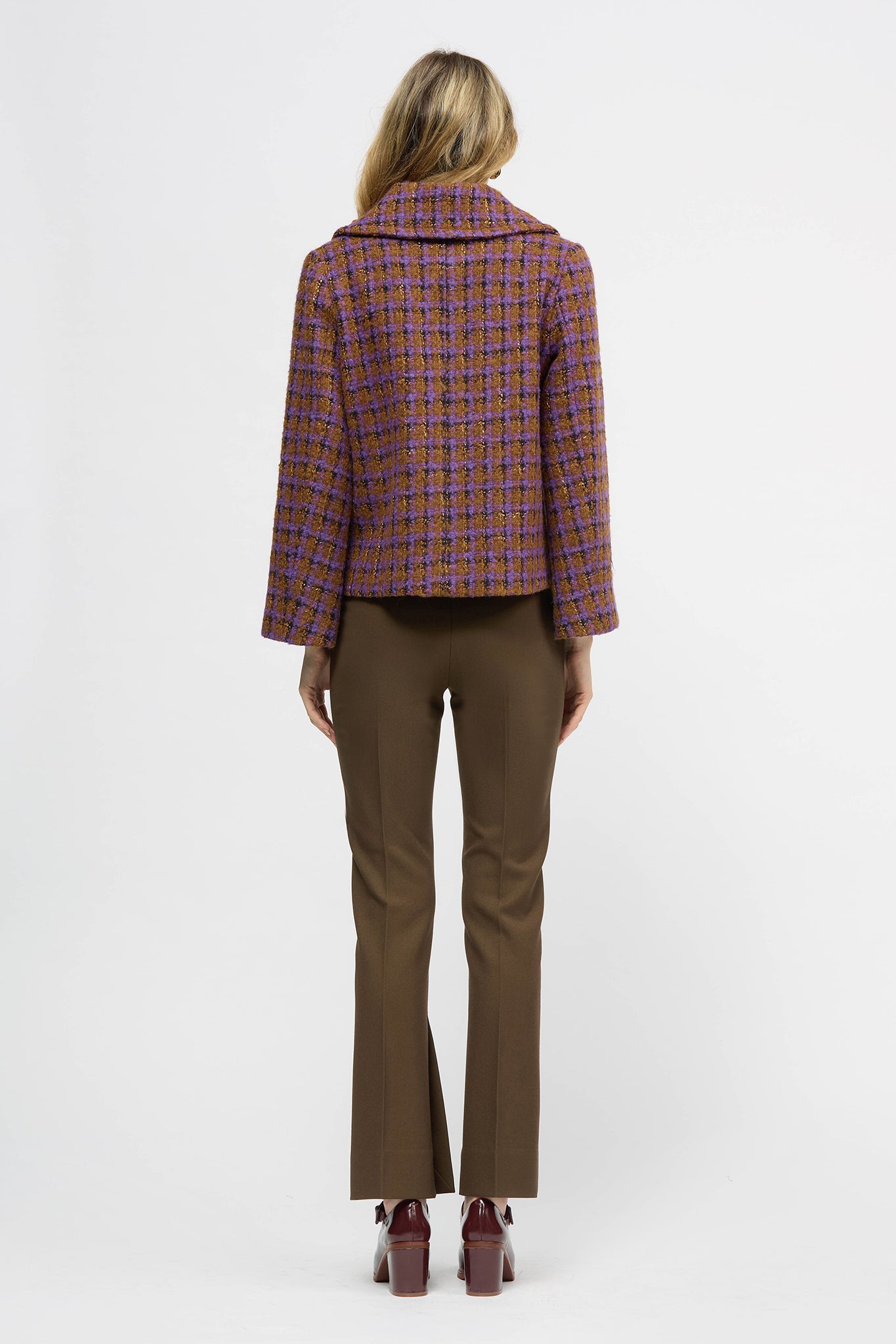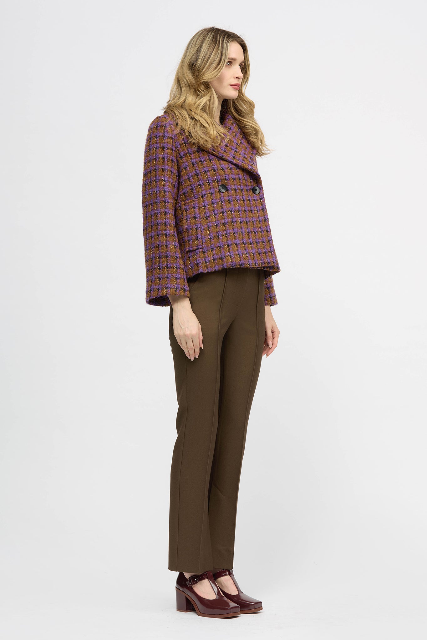The Rörö Jacket is a classic cropped double-breasted jacket with an oversized collar and lapel. This style offers two vertical welt pockets at the front body and an interior breast pocket. This style has two exposed buttons at the front and an interior button for fastening. Finished with a hanger loop in the interior back neck. Made with a warm wool blend textured fabrication and fully lined with a silky purple satin lining.