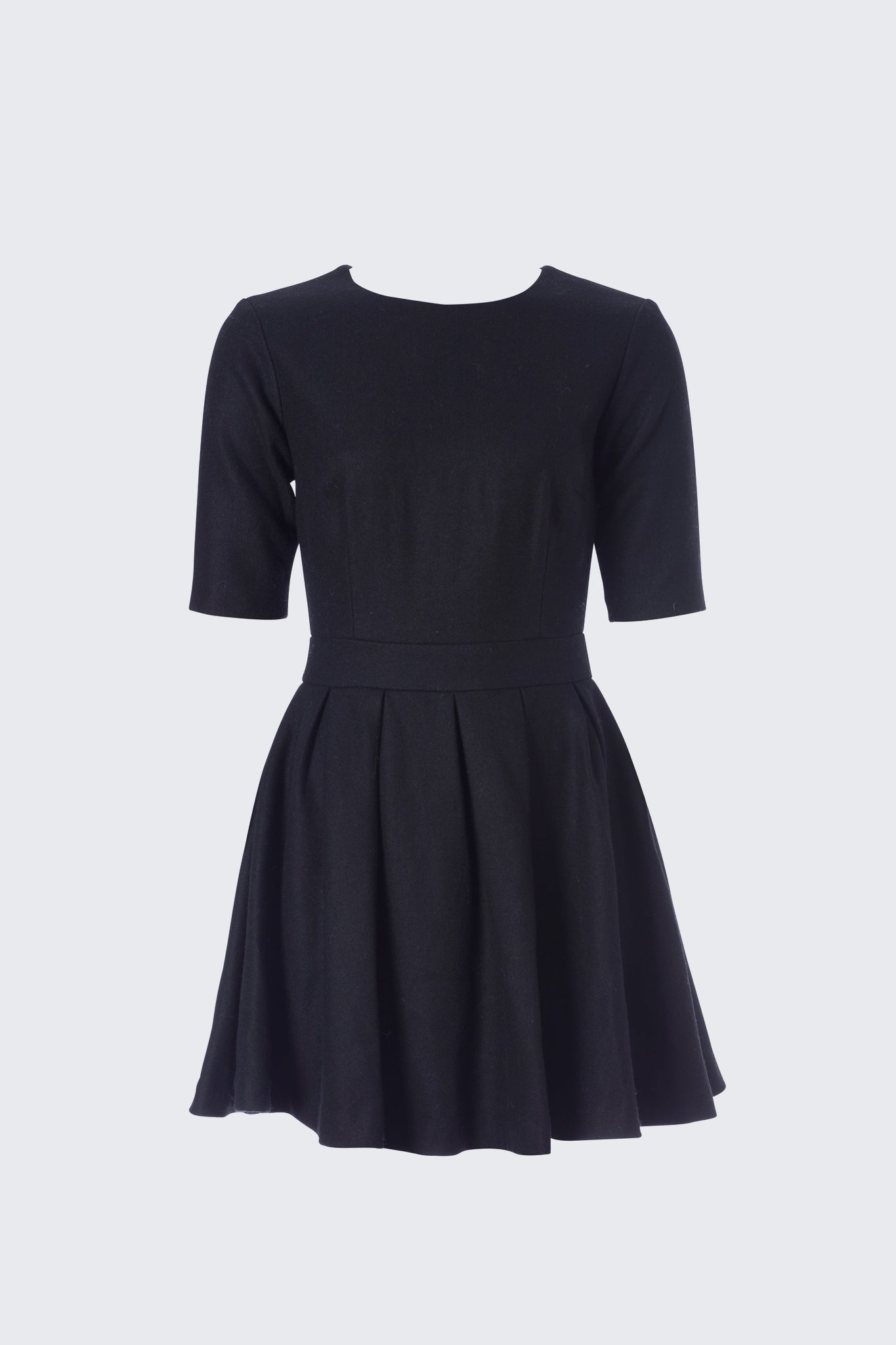 The Sandsend Dress is a midi style featuring 3/4 sleeves, crew neckline, long exposed zipper at the back and offers a fitted to pleated silhouette with slit side pockets. Made in a heavy wool/viscose blend and is fully lined.