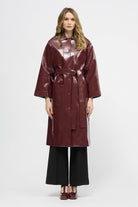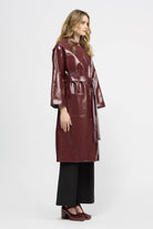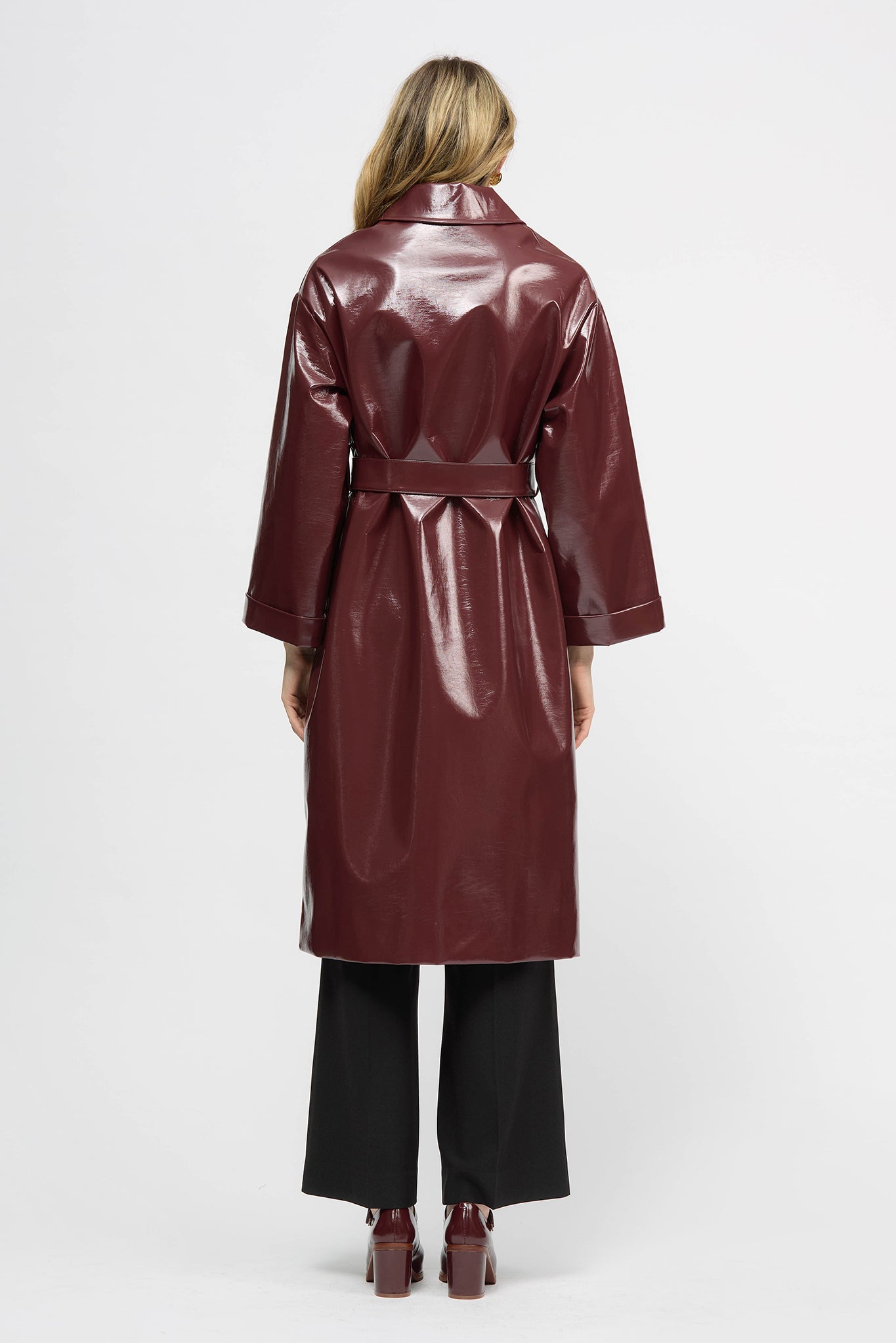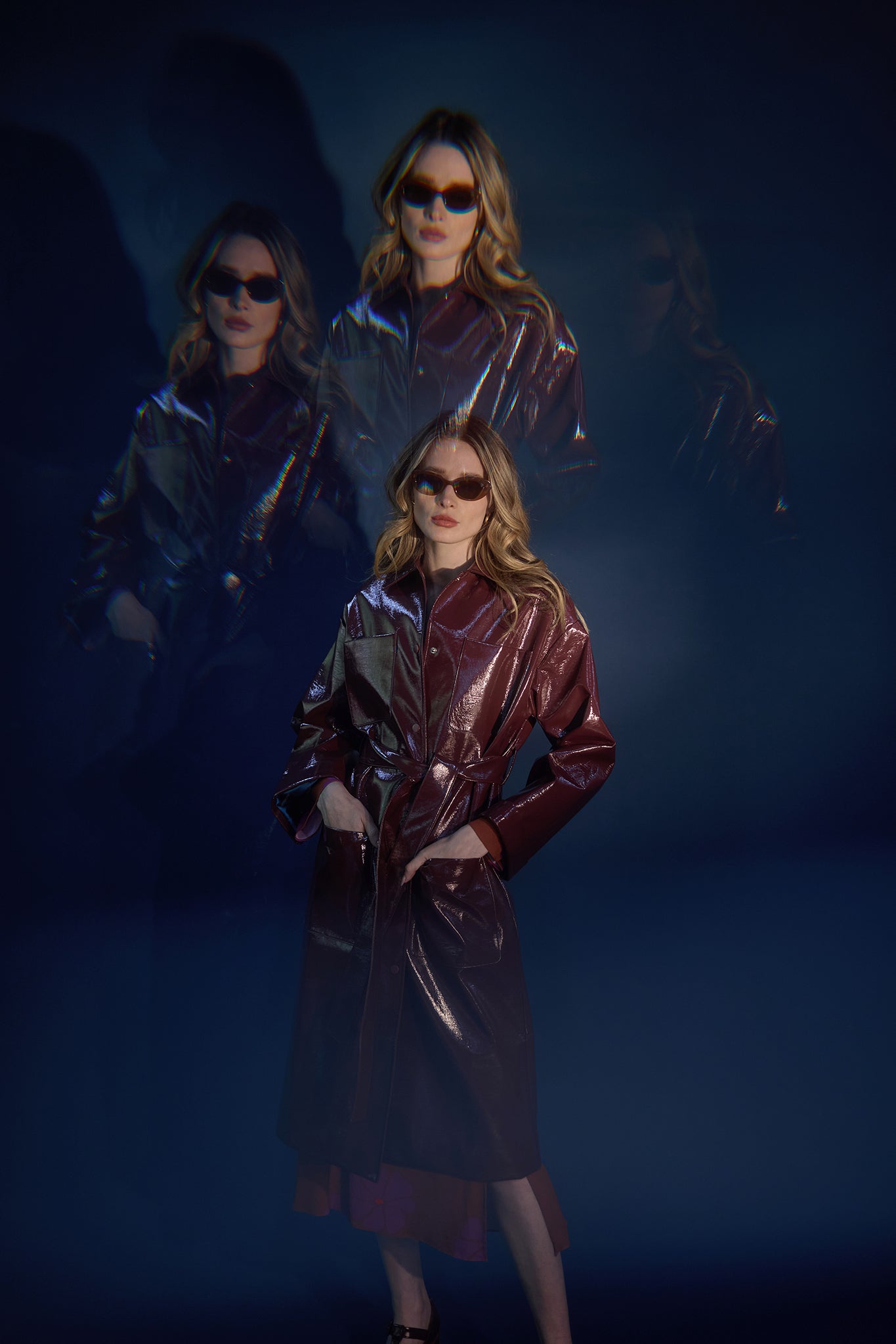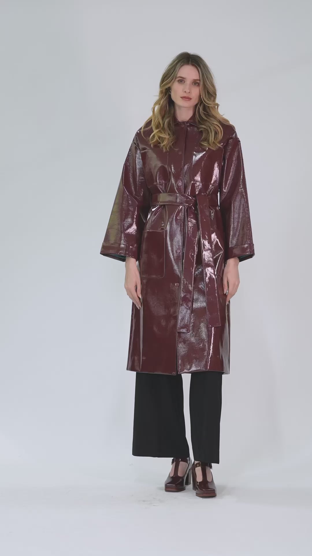 The Selva Raincoat is a mid-length, dropped shoulder style featuring four front body patch pockets. This style offers a classic style collar with matte powder-coated press stud buttons along the centre front for fastening. This style has a relaxed column fit which can be brought in with the detachable tie-up belt and belt loops located at the side waist. This style has wide-fit sleeves with a rolled cuff and is finished with a hanger loop in the interior back neck. Made with a gloss look PU and fully lined with a silky, teal satin.